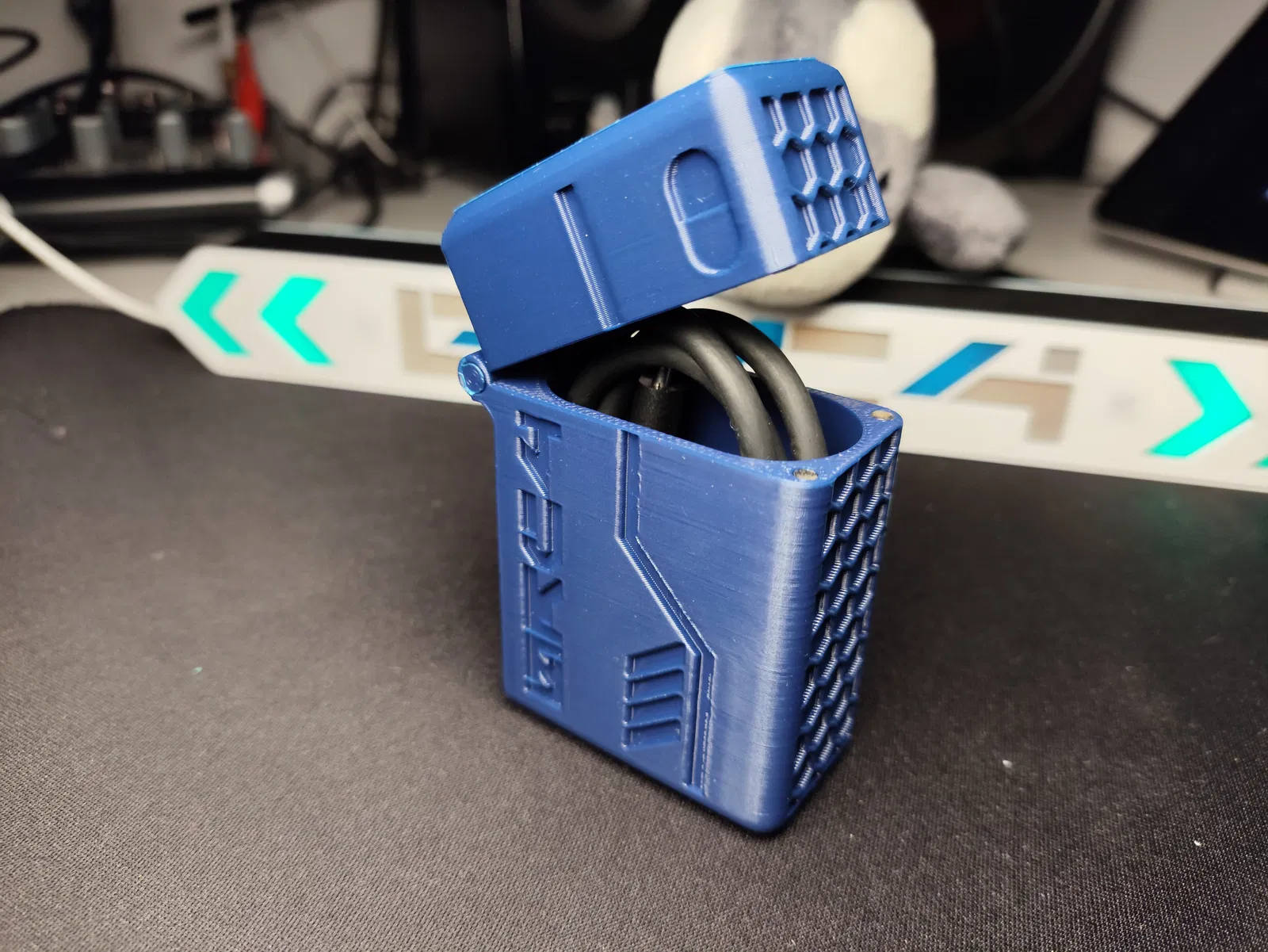 Hộp nhỏ xinh, có thể tùy chỉnh để đựng tai nghe, dây cáp, chìa khóa và nhiều thứ khác. Phiên bản không logo, hỗ trợ nam châm hoặc ốc vít cho bản lề. Infill 15%, có support và brim.