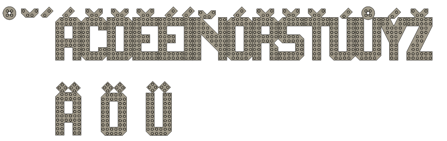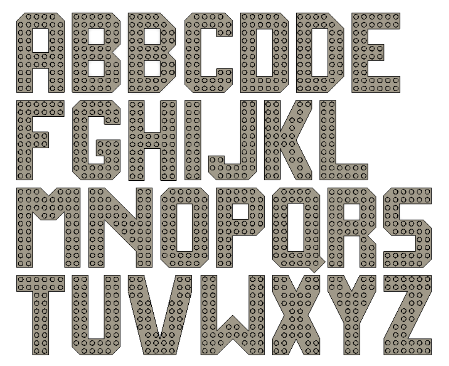 Chữ cái có thể lắp ráp với gạch Lego (nhưng có đáy phẳng). Kích thước gạch cơ bản "I" là 2x10.