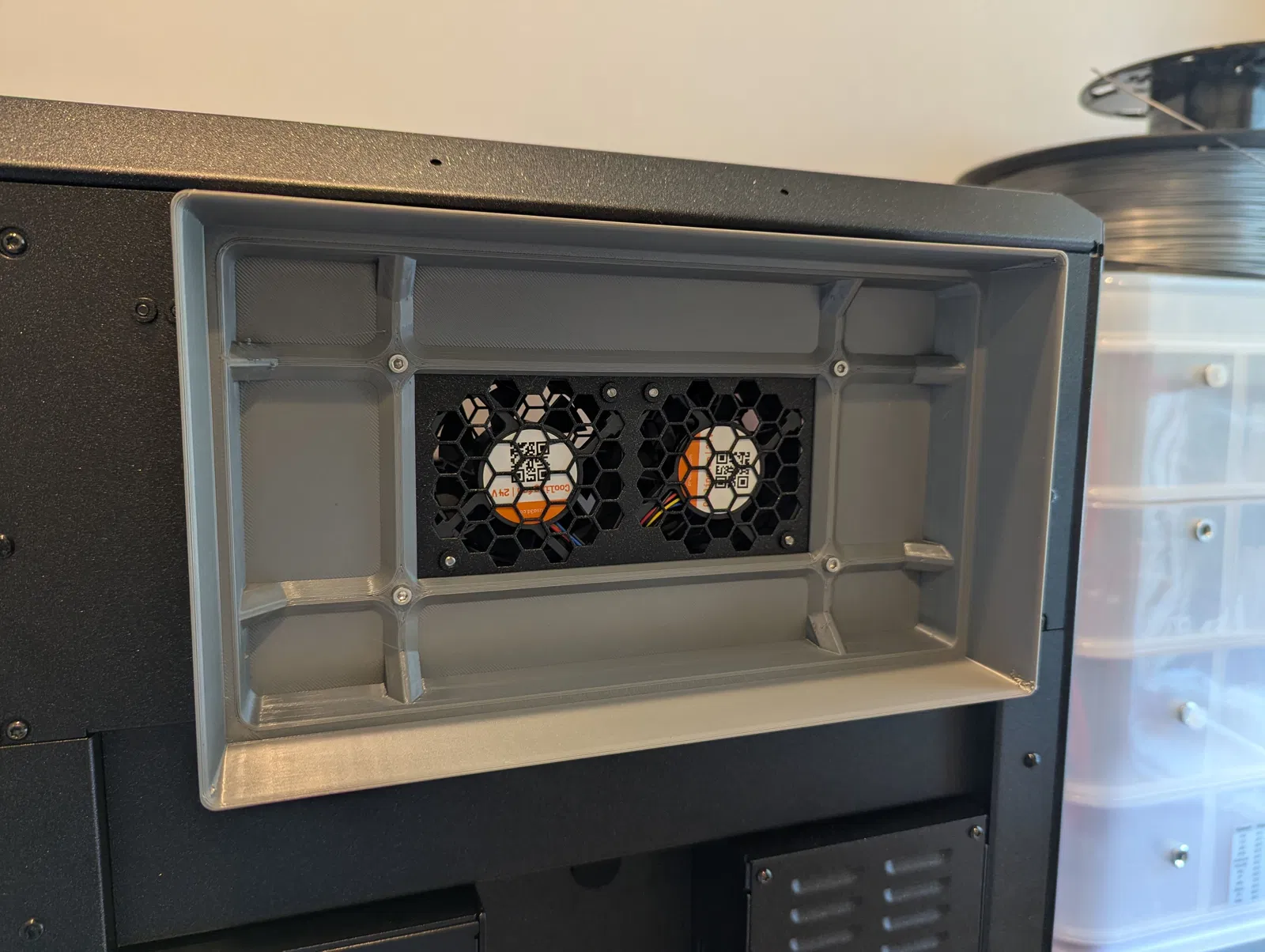 Cái adapter này vặn vô mặt sau của Core One bằng ốc M3x10 (4 con), bịt kín tốt, và có một khoảng không gian 20mm giữa quạt và bộ lọc để đảm bảo khí thải có thể lan tỏa khắp bề mặt lọc.