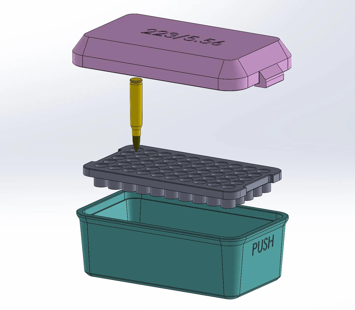 Hộp đựng đạn 223 hoặc 5.56. Chứa được 50 viên. In bằng PLA Mờ, hoặc bạn có thể dùng vật liệu nào tùy thích. Không cần hỗ trợ khi in. Nếu muốn, bạn có thể dùng vài giọt keo siêu dính để cố định khay bên trong. Lưu ý: Ở cạnh hộp bạn sẽ thấy nhãn "PUSH". Khi đậy nắp, chỉ cần gài một bên, sau đó ấn vào nhãn "PUSH" để bên còn lại khớp vào. Làm ngược lại để tháo nắp.