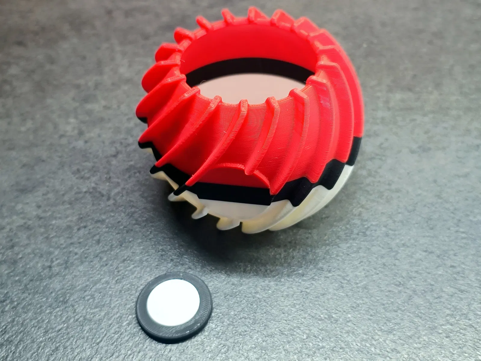 Cái chỗ cắm bút hình PokéBall này được chia ra thành từng phần riêng biệt để dễ dàng in đa sắc nha. Cái nút thì in rời ra rồi dán vô sau khi in xong. Cái mẫu này là thiết kế để in 3 màu luôn đó - có thể là tự đổi filament lúc in hoặc xài mấy hệ thống in đa vật liệu như AMS, CFS, MMU gì đó. Mỗi phần có thể gán một màu khác nhau, cho ra cái PokéBall nhìn tươi tắn, đúng chuẩn mà không cần xử lý hậu kỳ phức tạp.