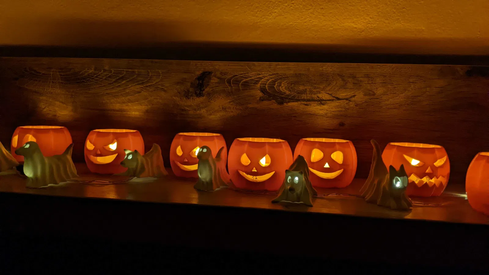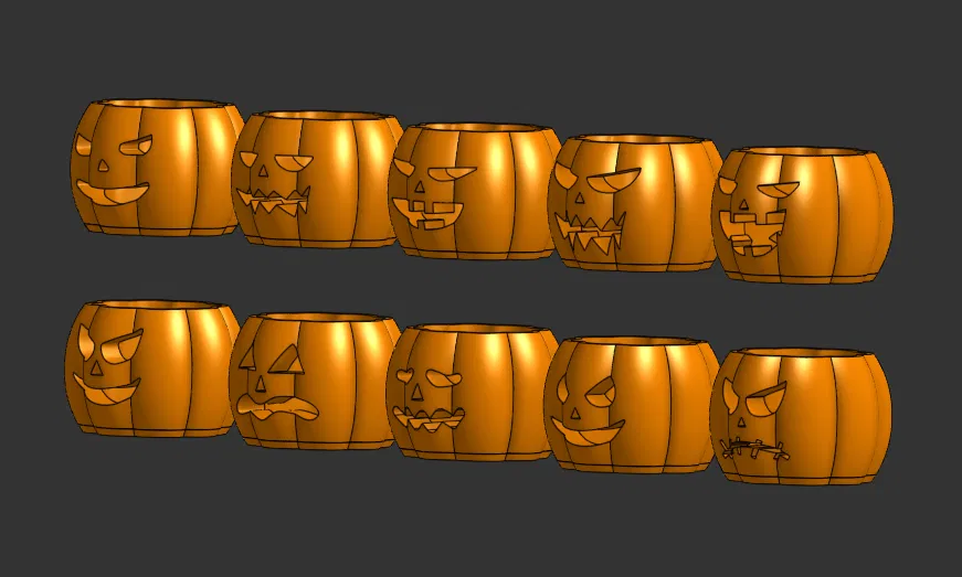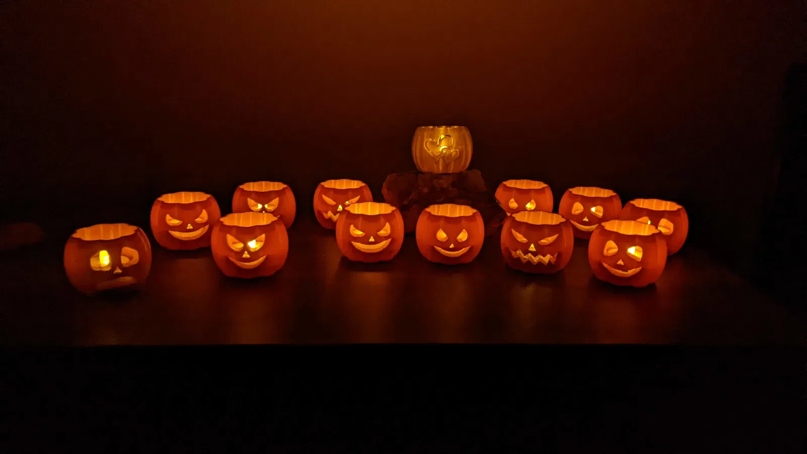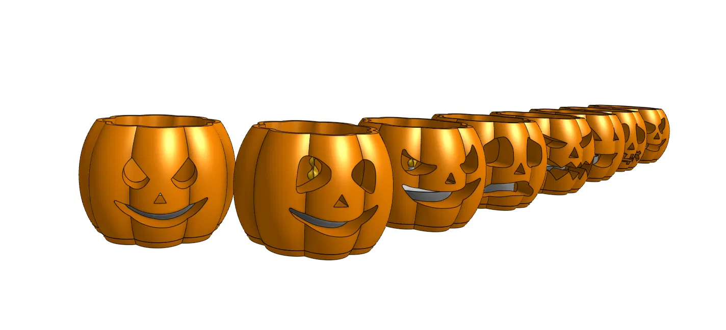 Chân nến bí ngô cho đèn trà LED, với 17 biến thể khuôn mặt. Có thể in bằng PLA, PET-G hoặc các vật liệu khác. Kích thước cao 50mm, vừa nến đường kính 45mm. Hướng dẫn in chi tiết kèm link tài liệu Onshape.