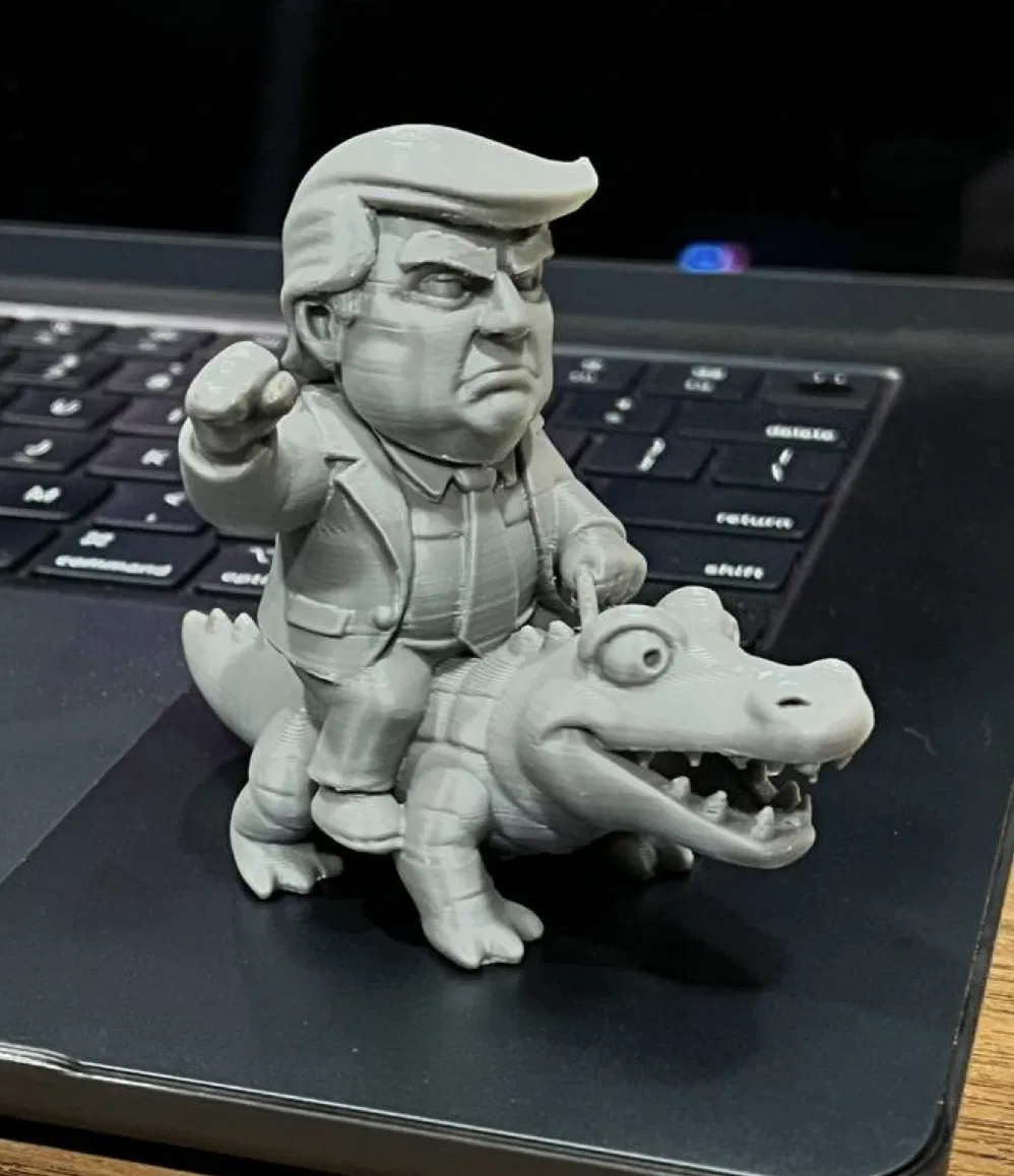 Mô hình 3D vui nhộn về cựu Tổng thống Donald Trump đang cưỡi trên lưng một con cá sấu. Một meme hài hước cho những ai yêu thích chính trị và sự độc đáo.