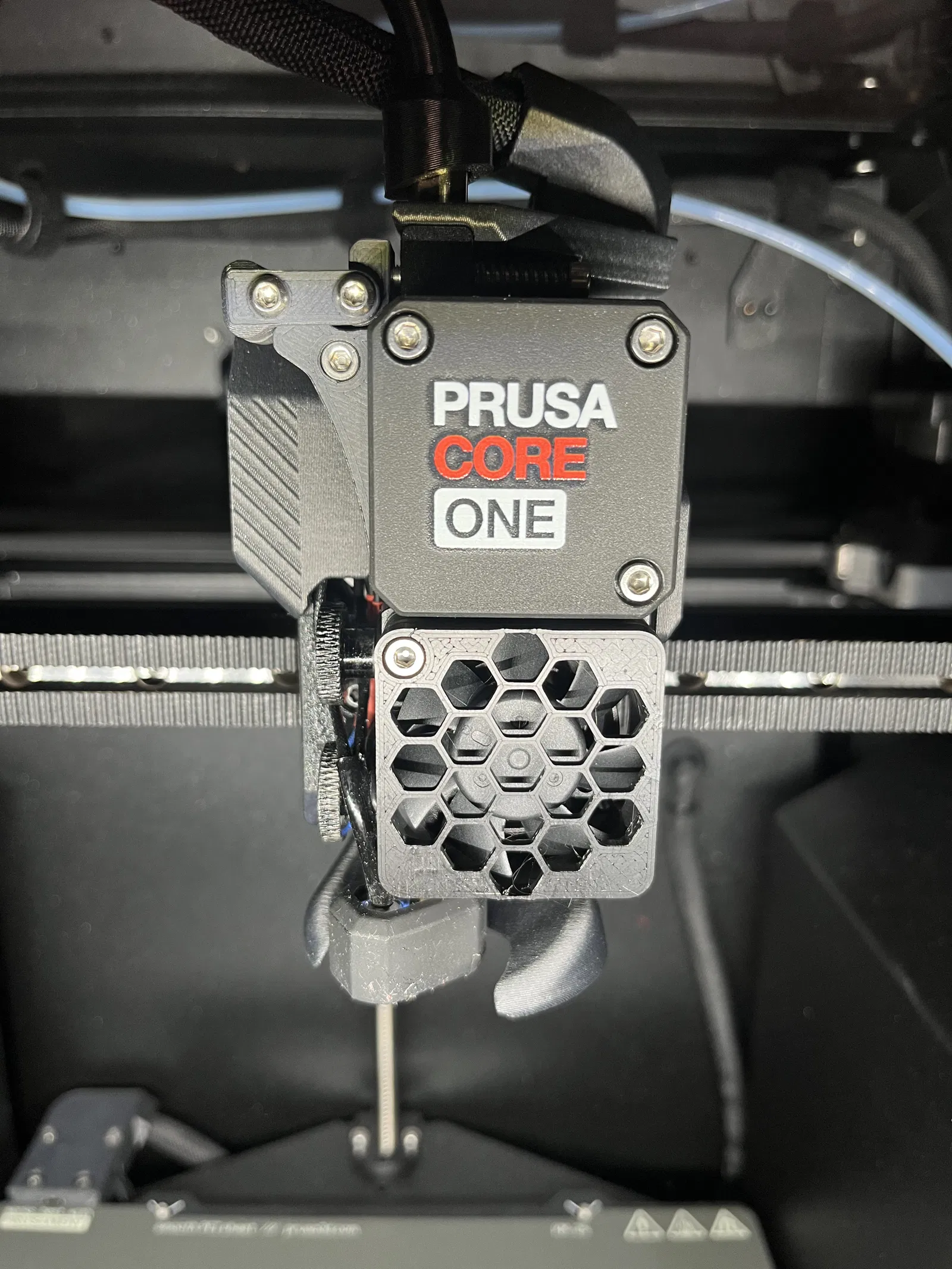 Tấm che lưới quạt hình tổ ong cho đầu máy extrude Prusa CORE ONE/MK4. Lắp đặt dễ dàng, ngăn nhựa vụn lọt vào quạt làm kẹt hệ thống làm mát. Thiết kế tối ưu luồng khí, chiều cao tương đương tấm che đầu máy.