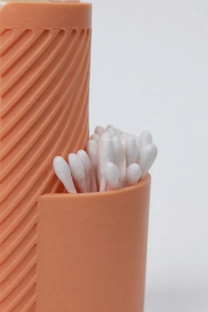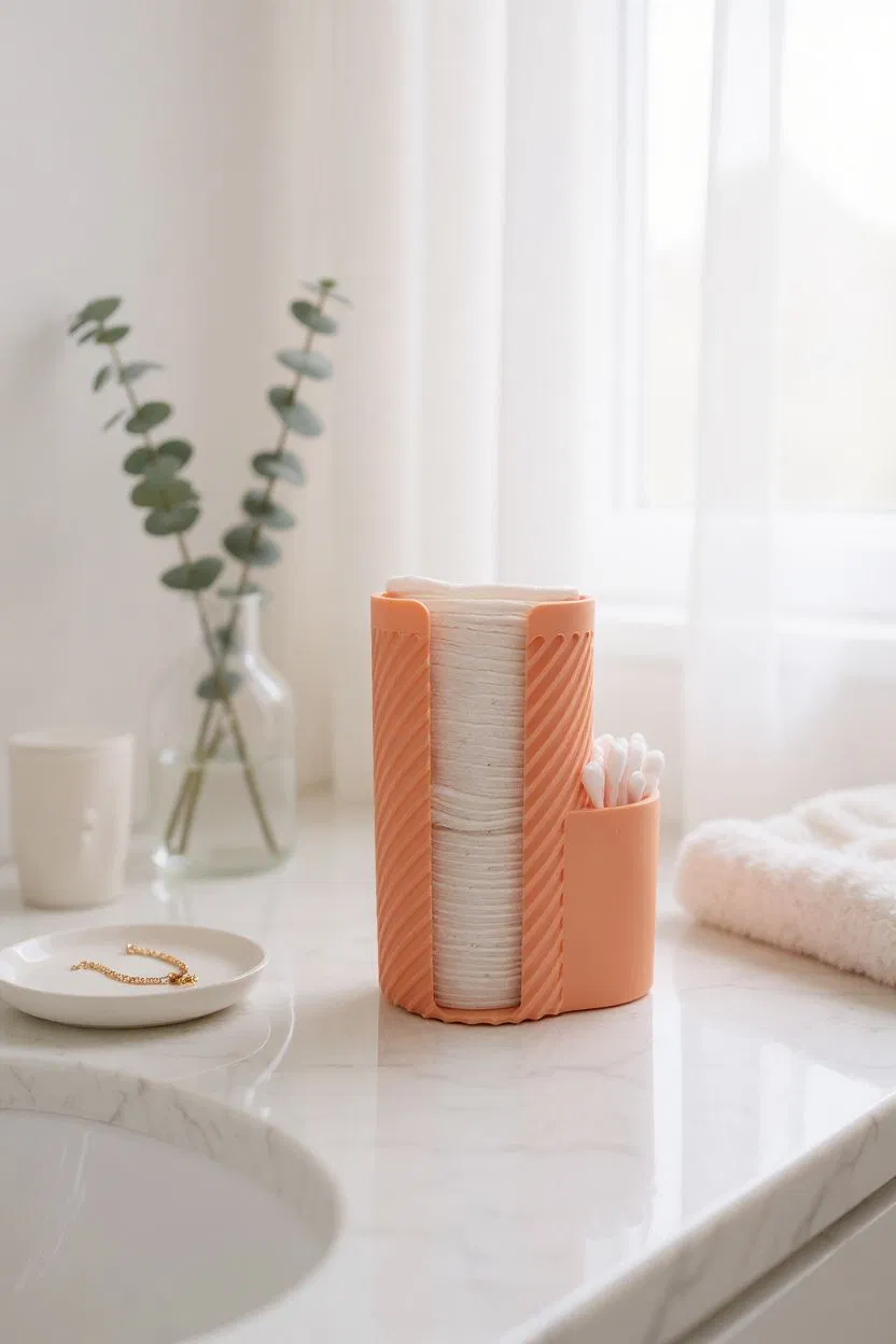 Mình thiết kế cái organizer này để cho mấy cái bàn hoặc tủ trong phòng tắm nhìn gọn gàng, thực tế hơn ha. Nó có 2 ngăn: 1 ngăn lớn hơn để đựng bông tẩy trang, kem, chai lọ, hoặc mấy món cao hơn, còn 1 ngăn nhỏ hơn thì để Q-tips, bông tăm hoặc cọ trang điểm. Thiết kế tối giản, đường nét gọn gàng tạo vẻ ngoài tinh tế, hợp với hầu hết các phòng tắm. Tường có gân tăng thêm độ cứng cáp mà không bị dày, đủ bền để dùng hàng ngày mà vẫn trông hiện đại. Rất hợp cho mọi loại tủ hoặc bàn bếp luôn nha!