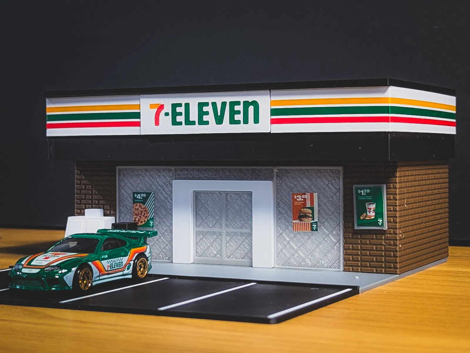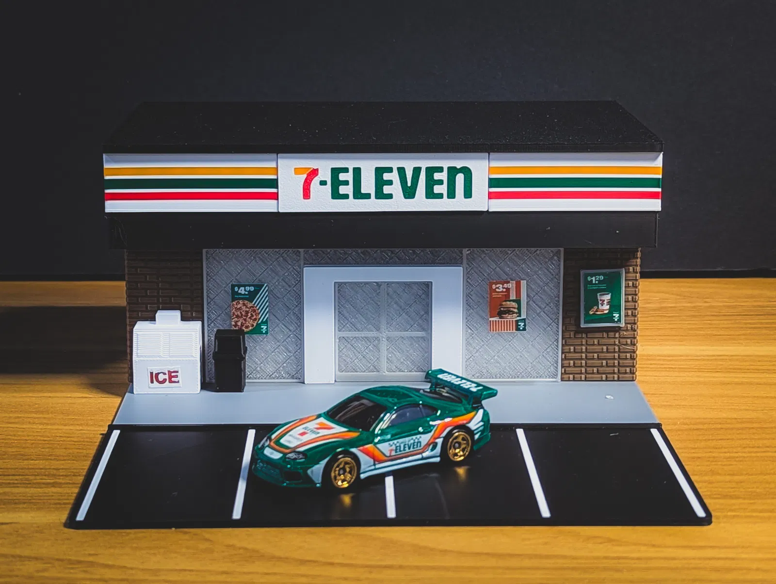 Đối với bộ mô hình, tôi đã giữ nó đơn giản nhưng thêm một số chi tiết nhỏ để làm cho nó nổi bật. Phần thân chính của tòa nhà có hoa văn gạch xung quanh, trông rất đẹp, đặc biệt với sợi màu nâu tôi đã sử dụng. Các chi tiết nhỏ hơn như tủ đông đá và áp phích thực sự làm cho mô hình trở nên sống động. Và sau đó, thêm một số xe Hot Wheels theo chủ đề 7-Eleven sẽ kết nối toàn bộ cảnh.