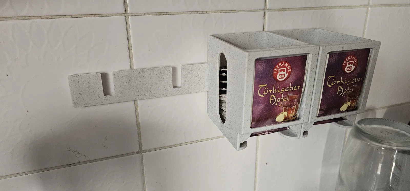 Hộp đựng trà tiện lợi cho 15, 20 và 25 bịch. Có đế tối ưu để dán hoặc bắt vít. Mẫu có gờ dùng để dán keo cho chắc chắn hơn. Có nắp đi kèm, cám ơn Wendelburg đã đóng góp.