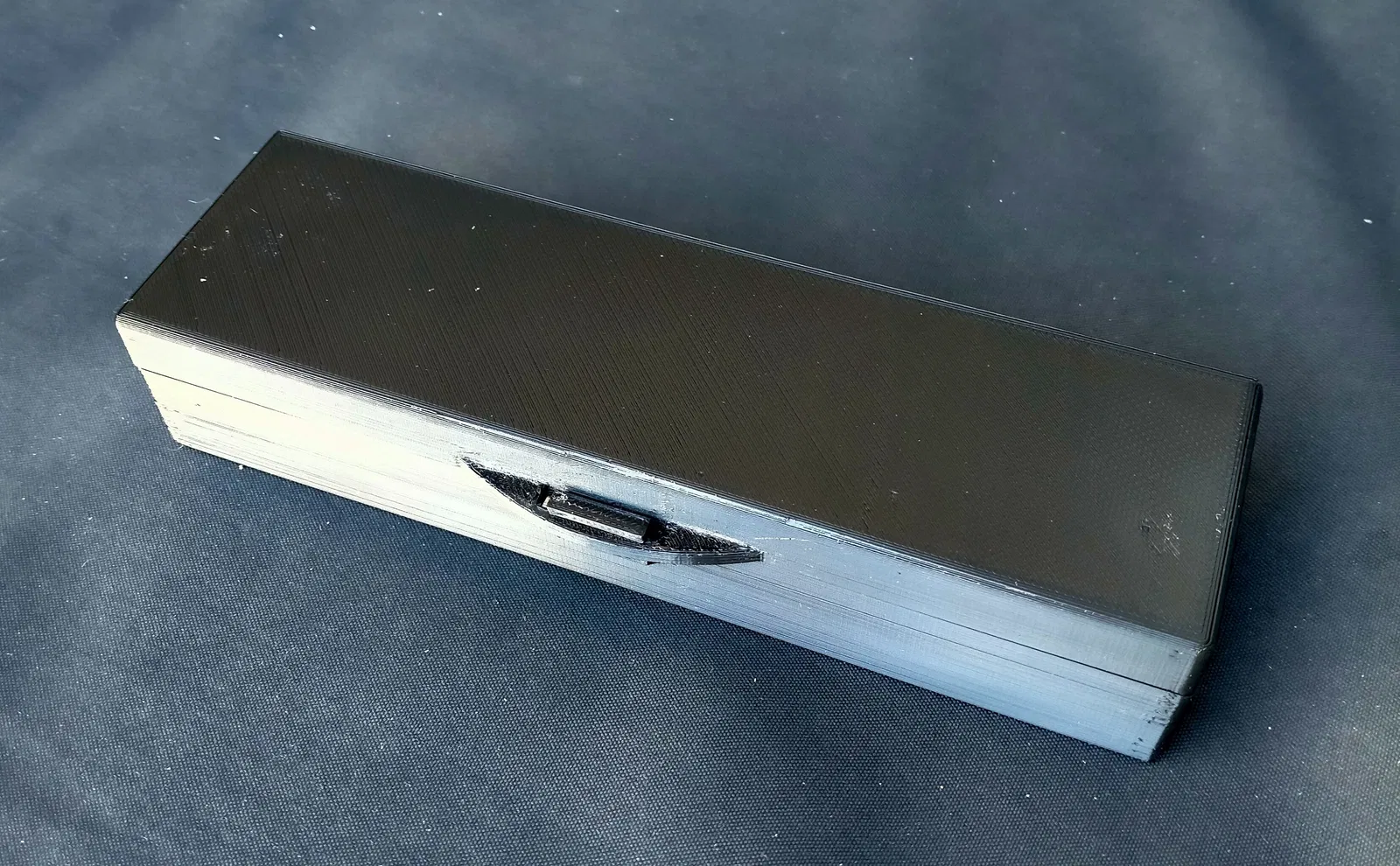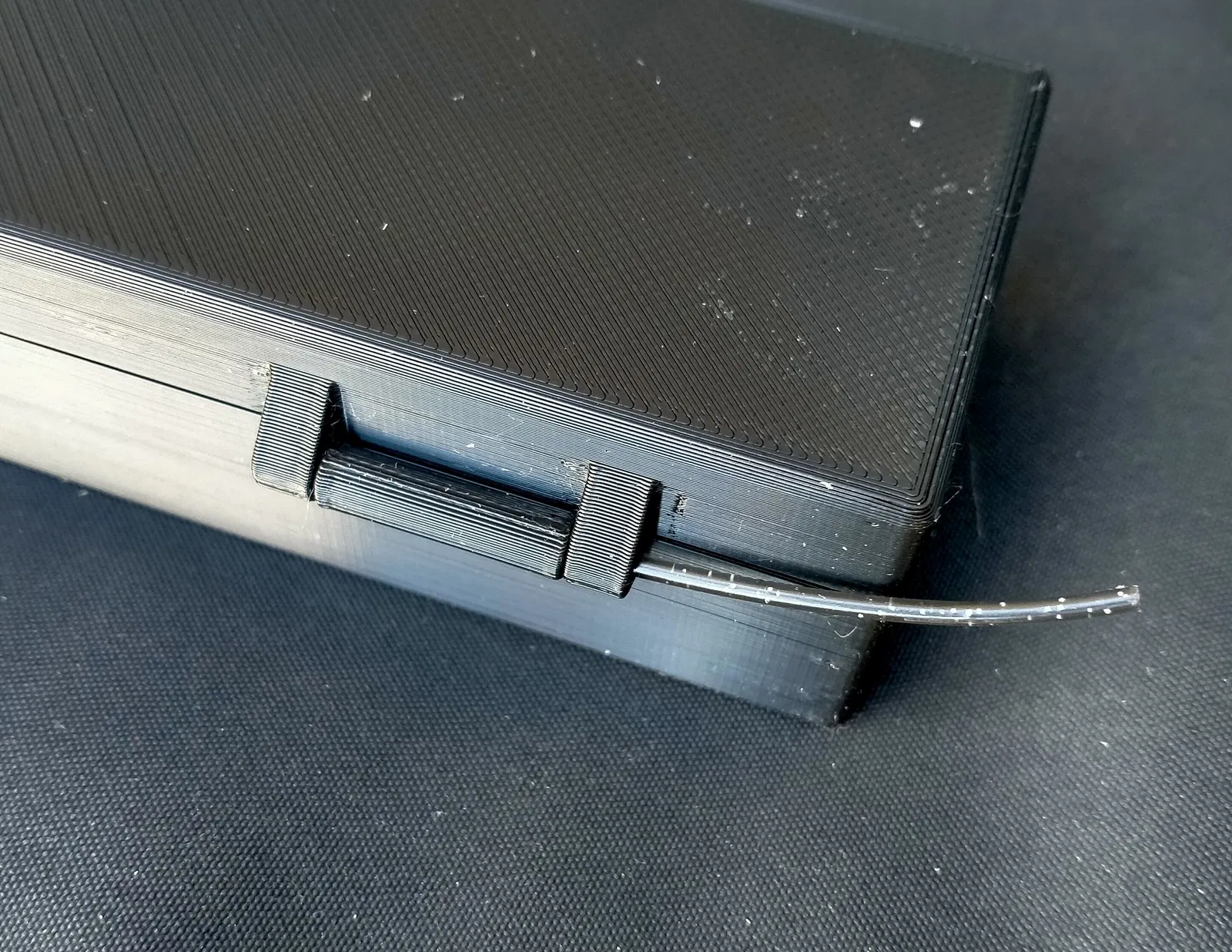 Bản lề dùng một đoạn dây filament ngắn làm chốt. Cứ cắt một đoạn dây filament vừa đủ, luồn qua các lỗ trên bản lề, rồi nhỏ một giọt keo siêu dính lên hai đầu để giữ cho dây không bị tuột ra. Cuối cùng, tui có dán thêm một miếng mút nhỏ bên trong nắp để chống cho mặt dưỡng bị rung lắc khi đóng case lại.