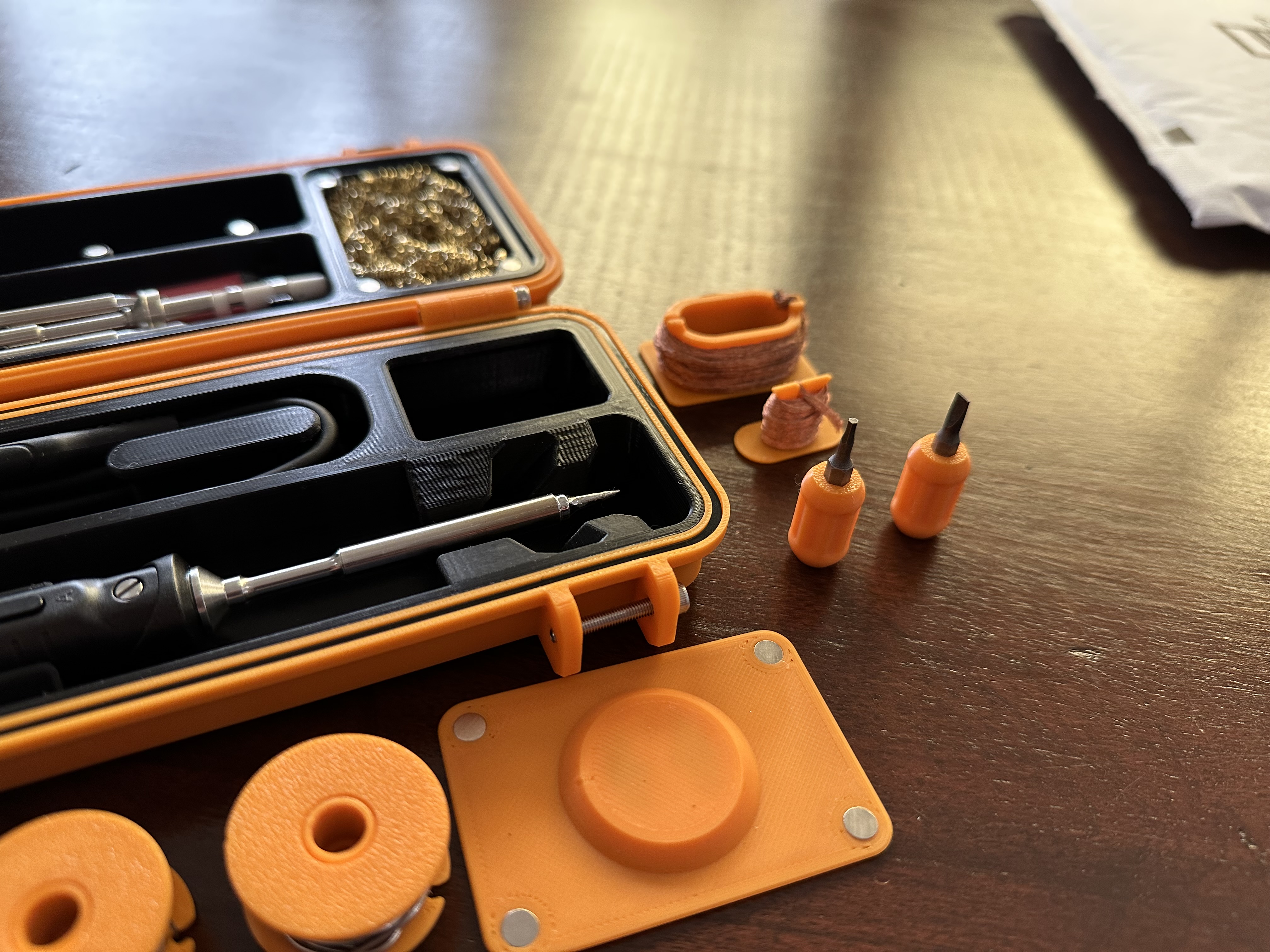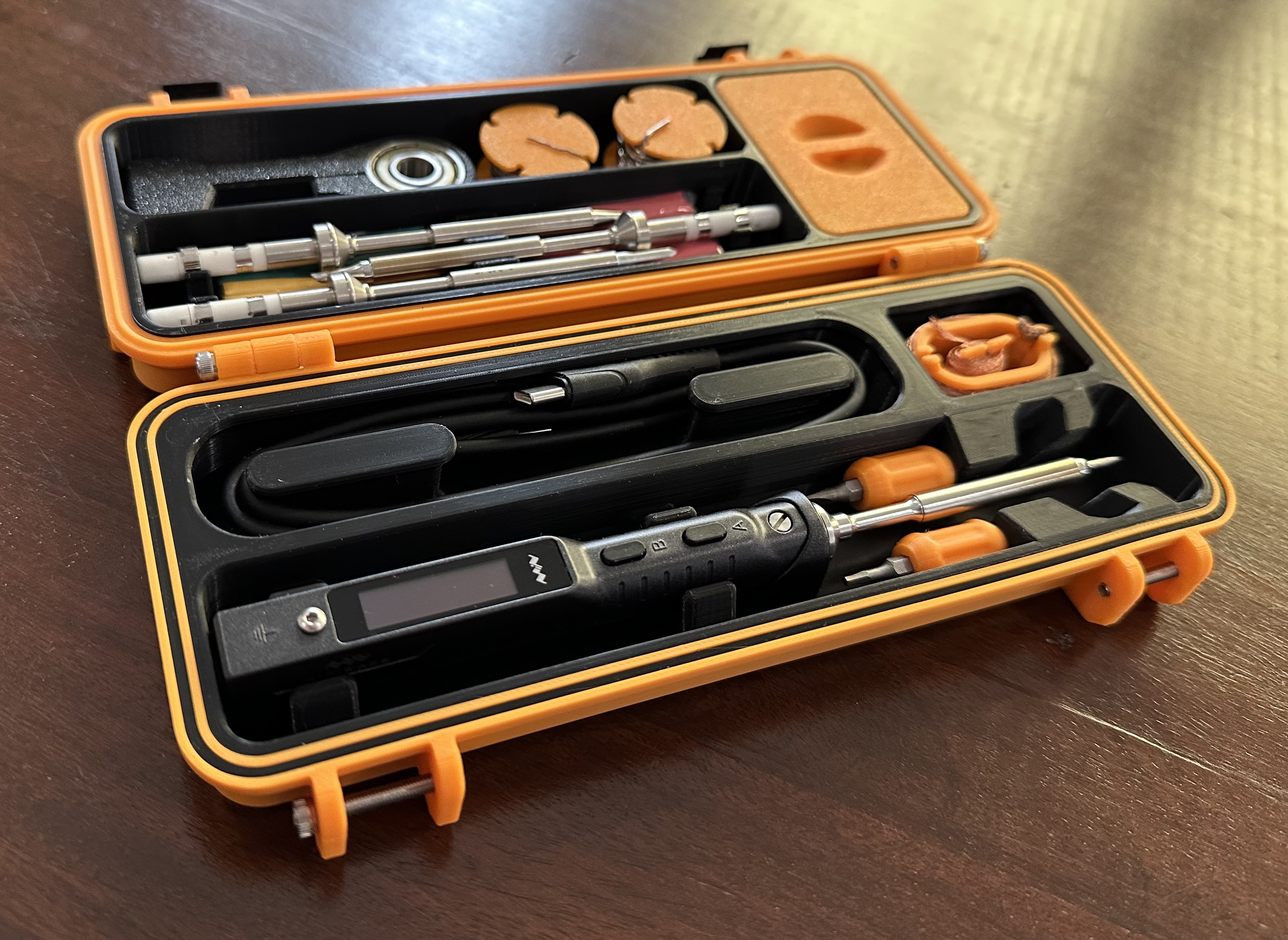 Sau một thời gian sử dụng chiếc hộp đựng Pinecil/TS100 cứng cáp, tôi quyết định thực hiện một vài cải tiến nhỏ để phù hợp hơn với nhu cầu của mình. Các bộ phận chèn sẽ vừa với hộp ban đầu vì tôi không muốn in lại hộp chính.