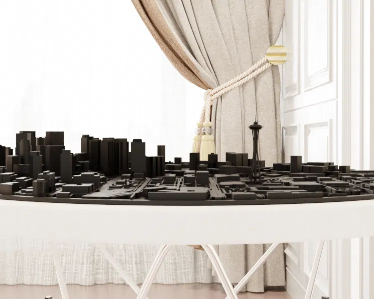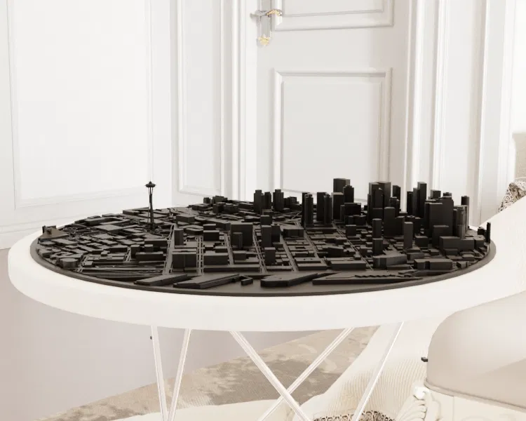 Bản đồ 3D địa hình tròn Seattle với Kim Chti Space Needle và đường chân trời thành phố, sẵn sàng để in 3D và trưng bày. Hoàn hảo cho trang trí, quà lưu niệm hoặc giáo dục.
