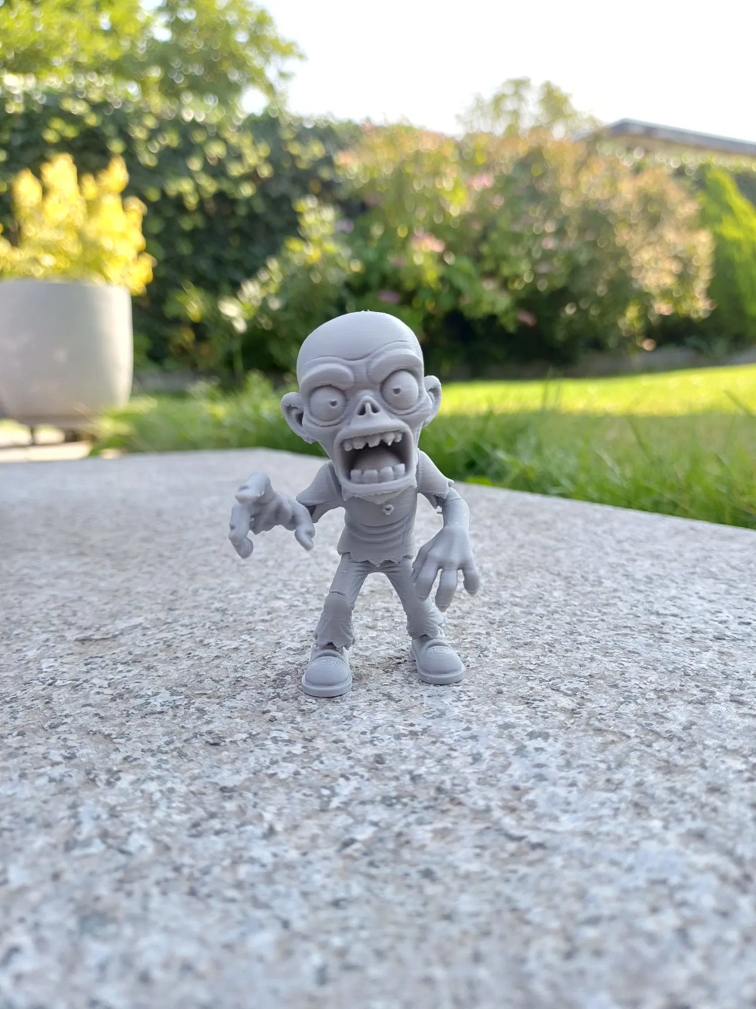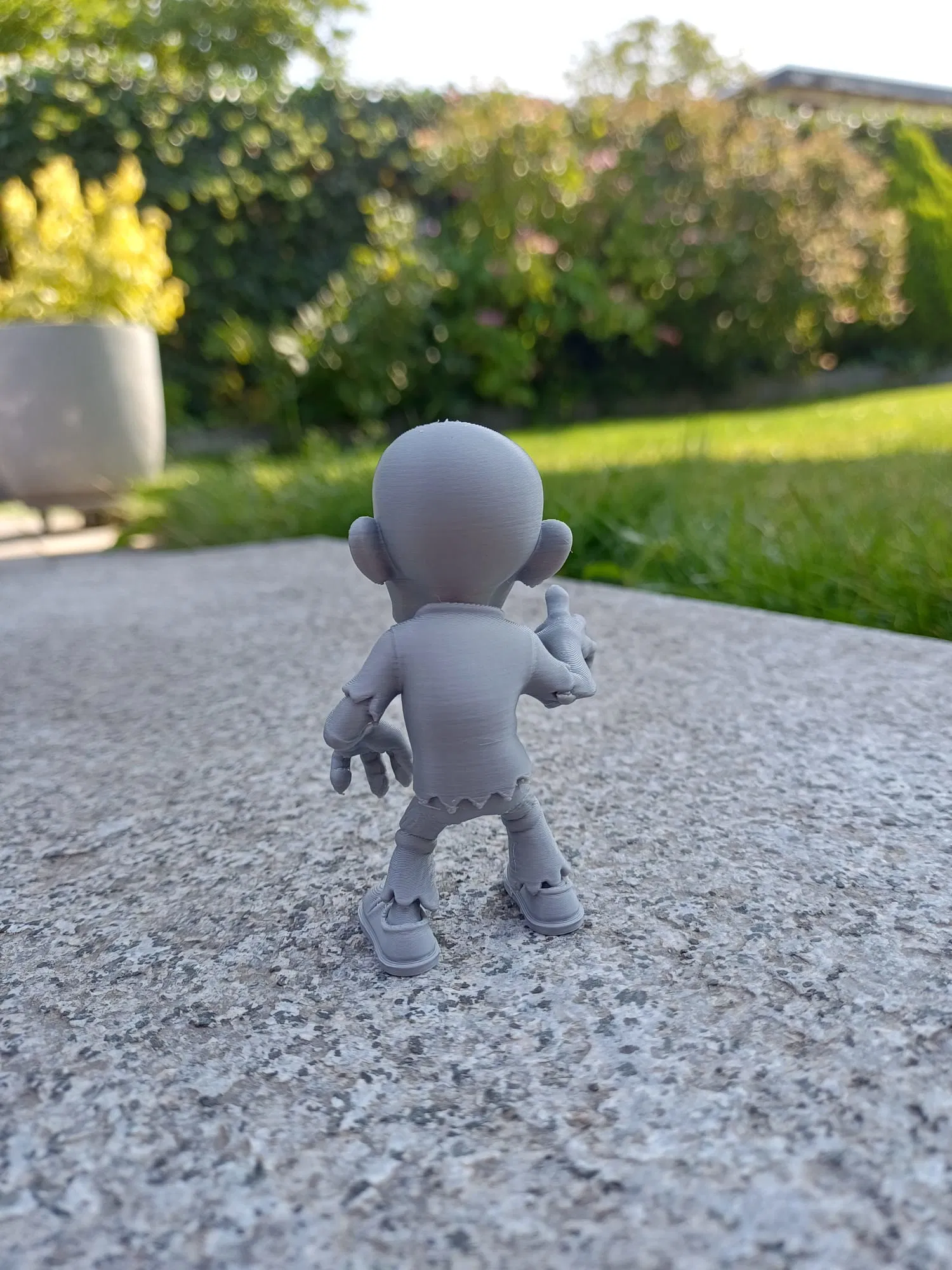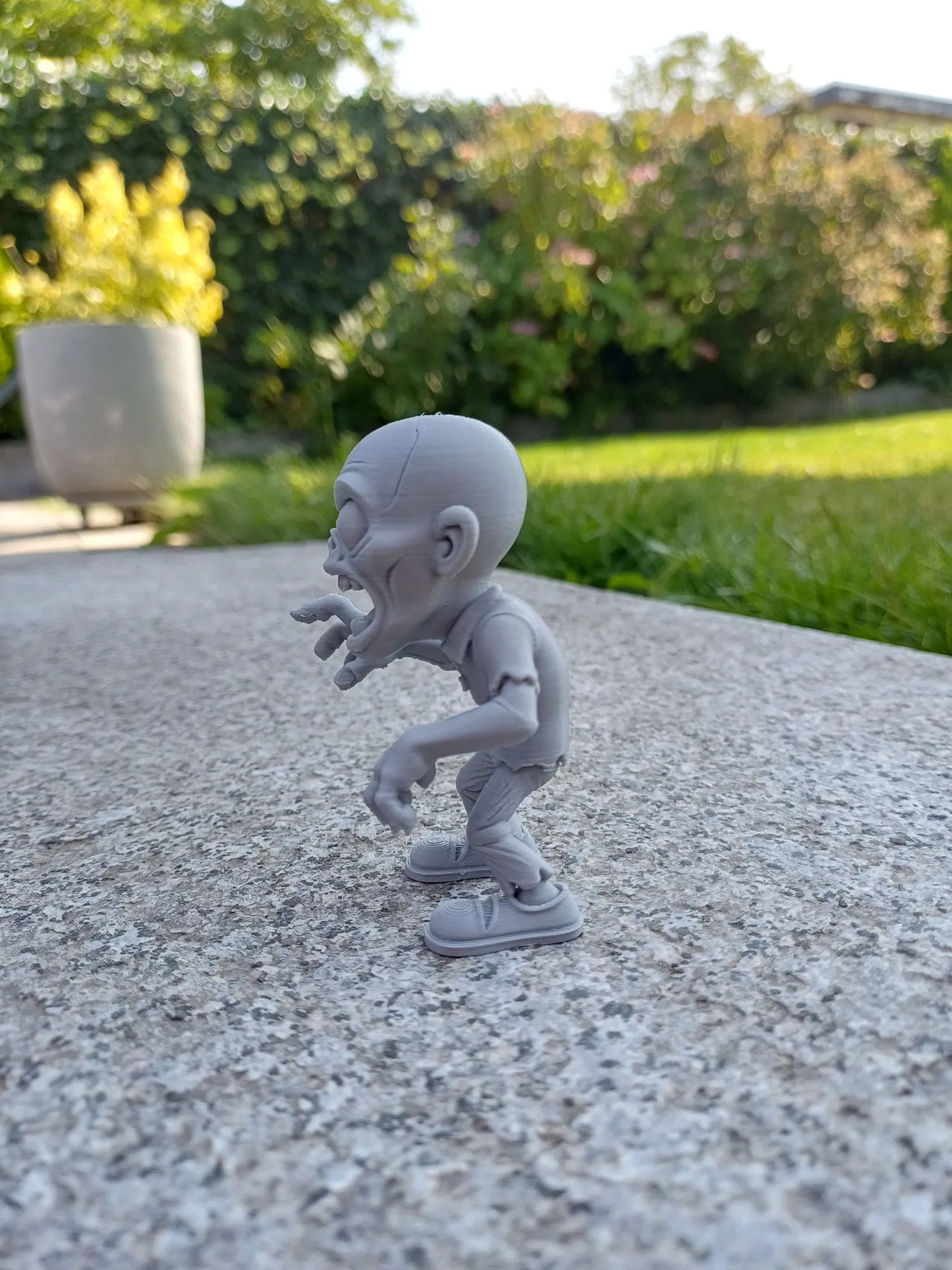 Một bộ xương zombie ngộ nghĩnh-kinh dị đang lảo đảo tiến tới với hai tay dang rộng, quần áo rách rưới và đôi giày thể thao ngoại cỡ. Hoàn hảo làm vật trang trí Halloween nhỏ, mô hình tập sơn, hoặc một người bạn đồng hành vui vẻ trên bàn làm việc.