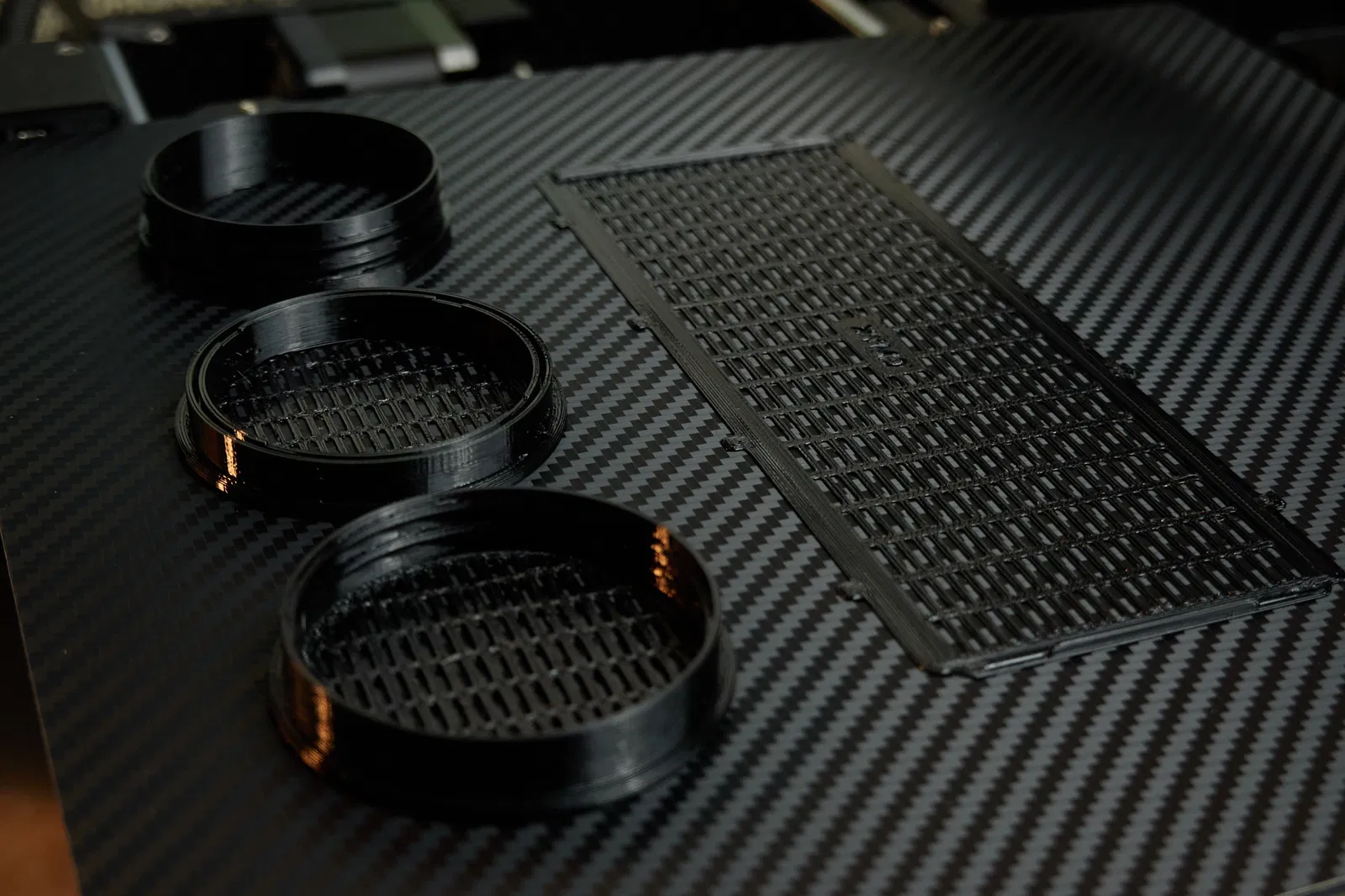 Với PETG á, lớp đầu tiên hơi khó nha. Phải tăng nhiệt độ bàn lên 85°, nozzle lên 235° và giảm tốc độ xuống 30 mm/s cho lớp đầu tiên đó. Cái này còn tùy vào cái mặt in của bạn nữa. Tui xài cái mặt carbon có vân (xem 2 ảnh cuối nha).
