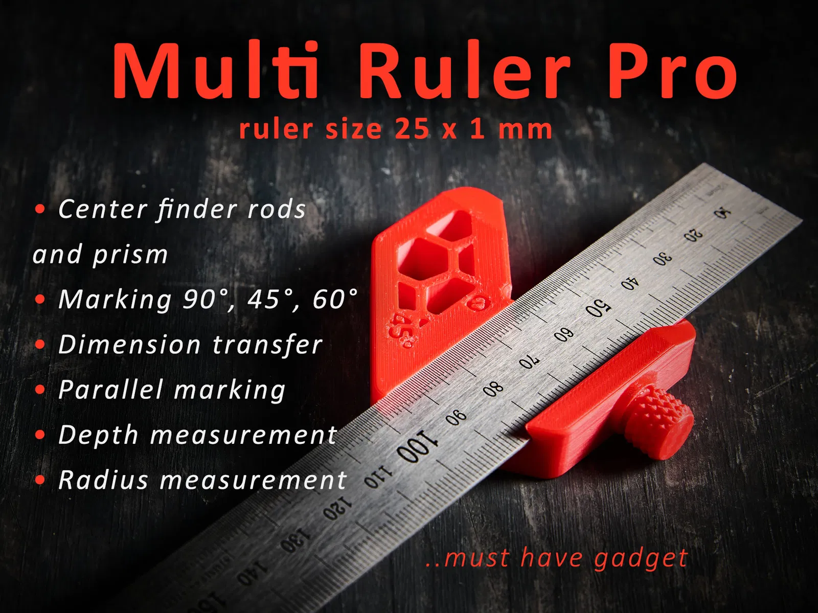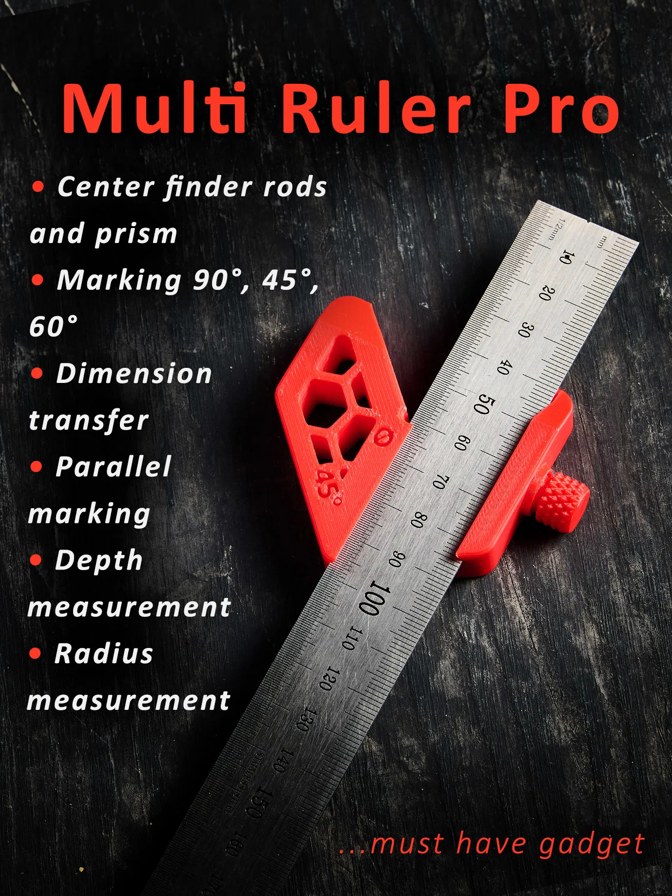 Multi Ruler Pro là kẹp đa năng cho thước thép 25x1 mm, giúp bạn tìm tâm, đánh dấu góc, đo bán kính gián tiếp, chuyển kích thước, đo song song và đo độ sâu. Thiết kế nhẹ, dễ in, chỉ tốn 1 giờ. Một dụng cụ không thể thiếu cho thợ mộc và mọi người làm DIY.