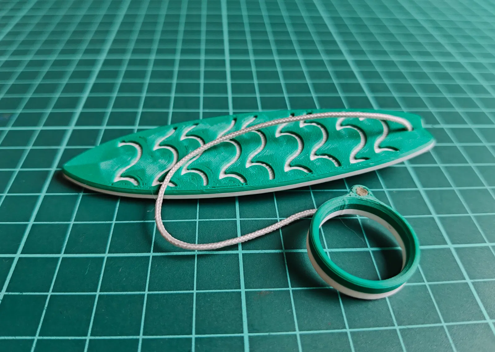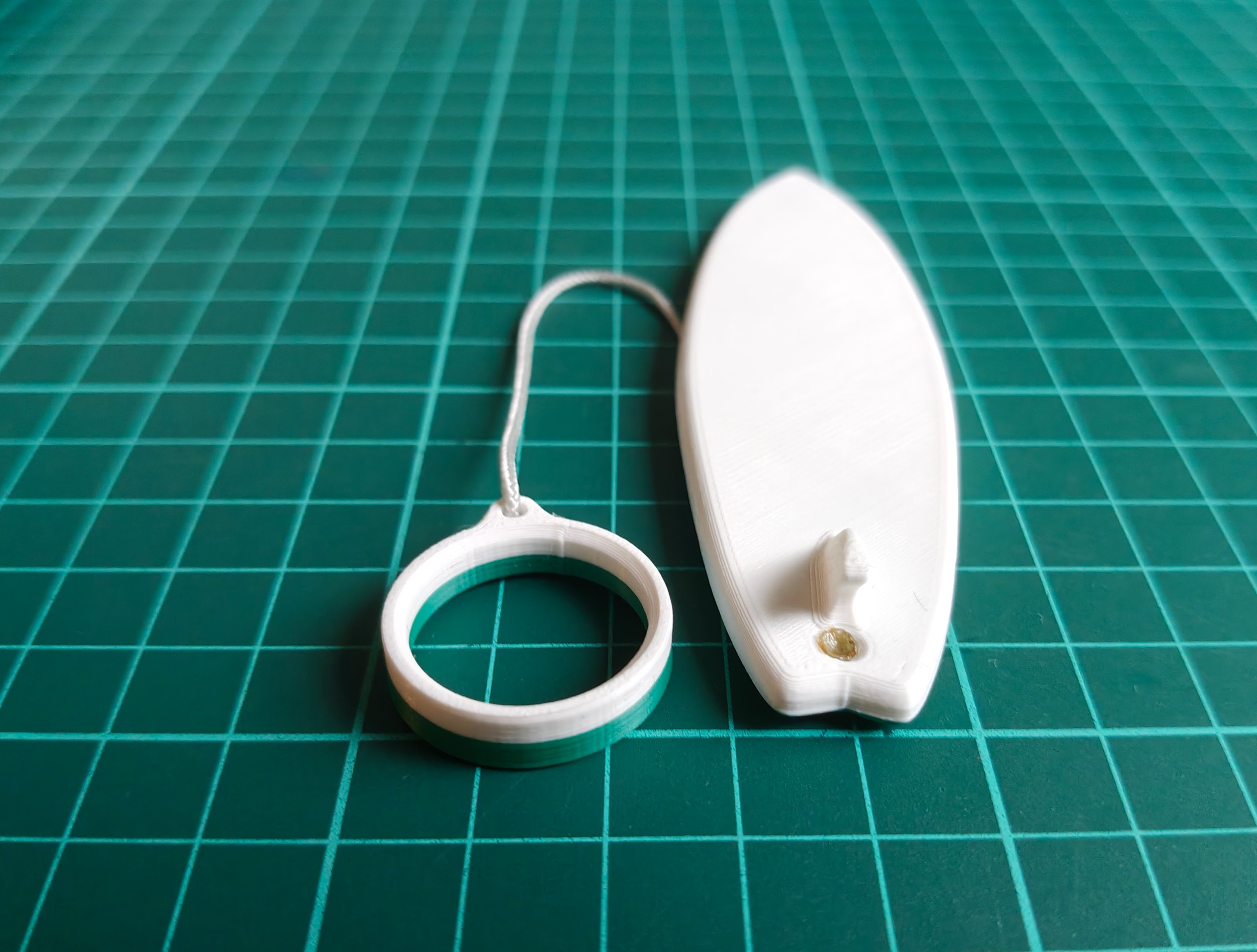 Nói về dây nè: Tui dùng dây paracord 2mm, hơ lửa cho chảy hai đầu rồi ép vô chỗ lõm trên ván lướt và khoen gắn ngón tay là xong.