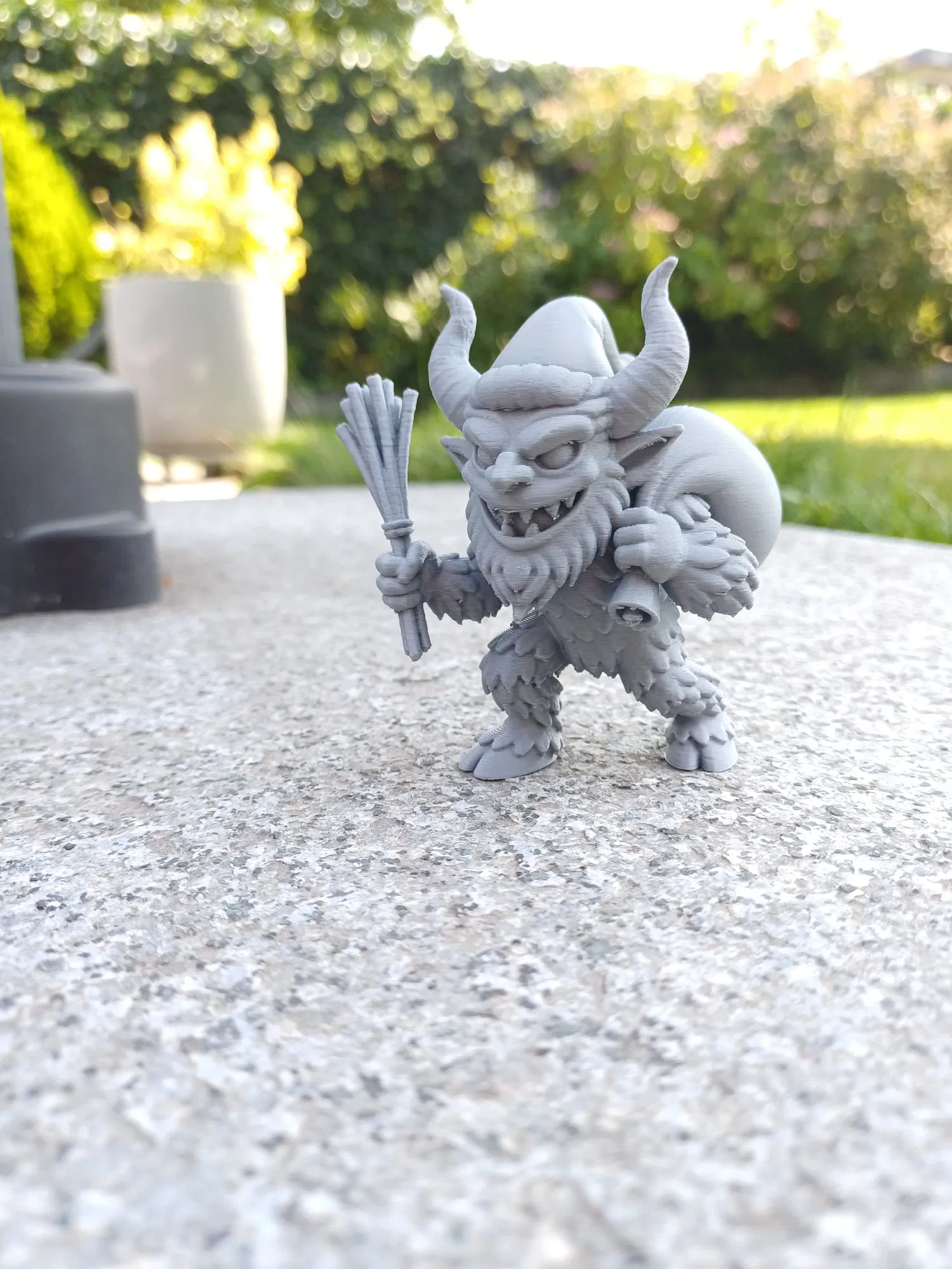 Chú Krampus cách điệu này có sừng cong, mũ chóp nhọn, bộ đồ "lông" xù xì, một bó roi bạch dương và một túi phồng mang trên vai.