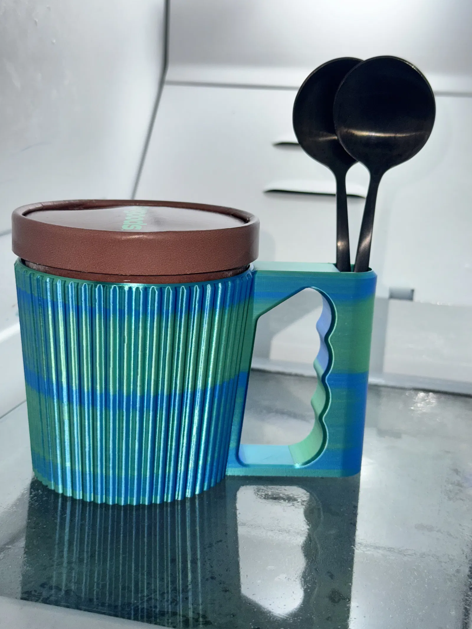 Thiết kế "Ice Cream Pint Holder" dễ in, không cần supports, có chỗ cắm muỗng, giữ tay ấm và kem lạnh. Tối ưu hóa cho in 3D, chỉ tốn ~100g filament. In với 2 lớp thành giúp kem lạnh lâu hơn. Khuyến nghị PETG. Rất mong thấy sản phẩm bạn đã in!