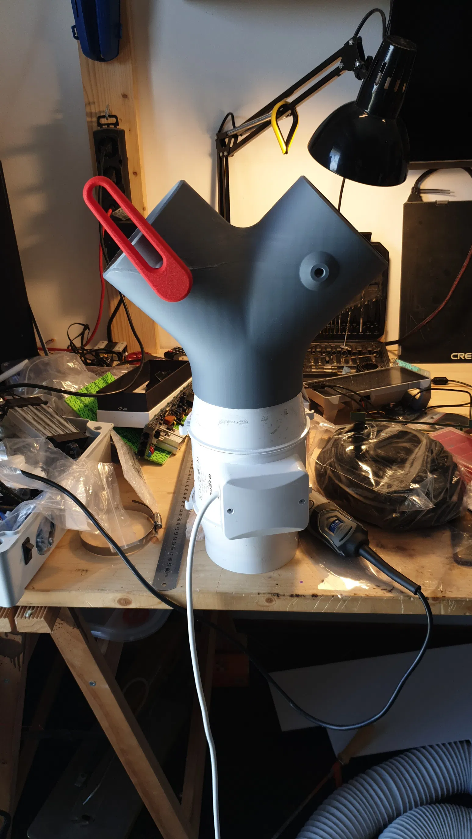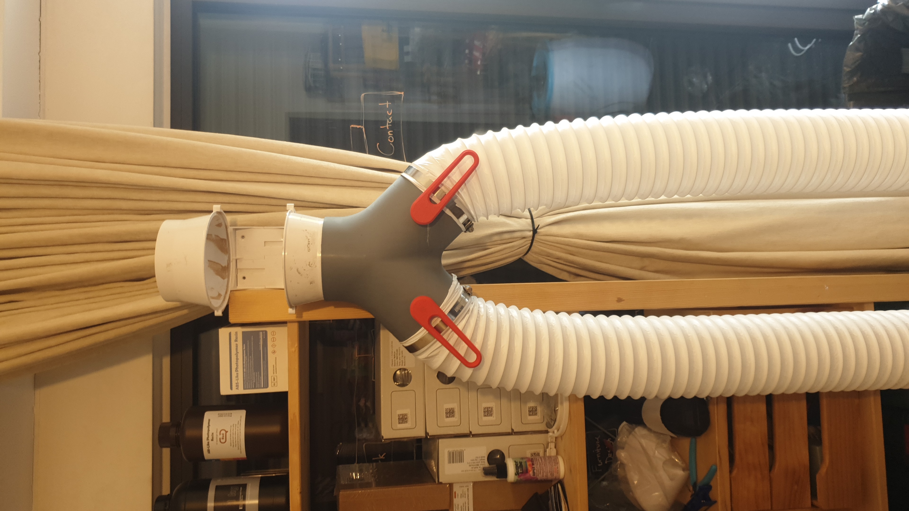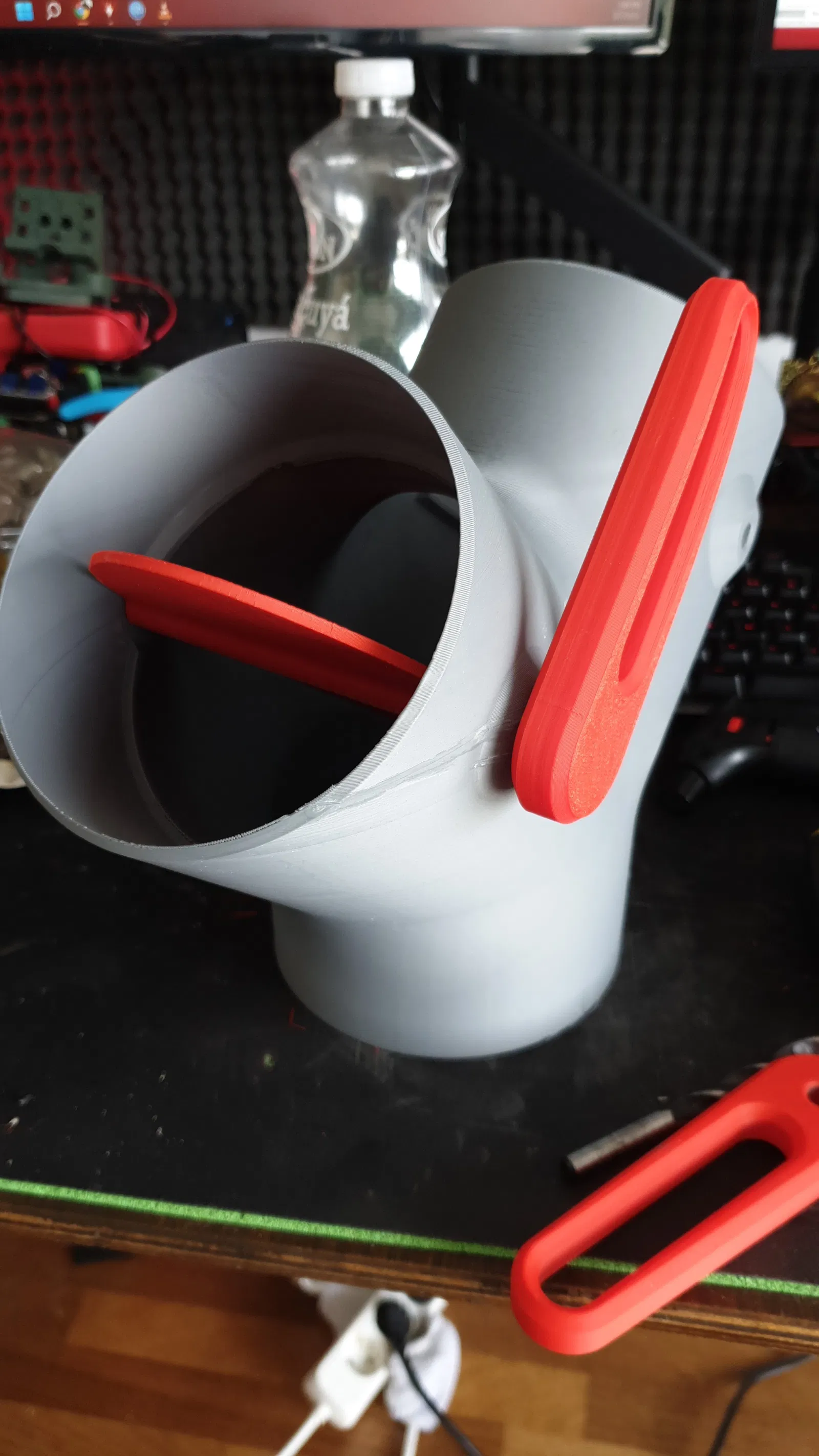 Ống thông gió cho tủ máy in resin và CNC của tui. Cần một giải pháp để chia đường khí cho quạt 125mm gắn trong ống ra cả hai bên, nên tui nghĩ ra cái này.