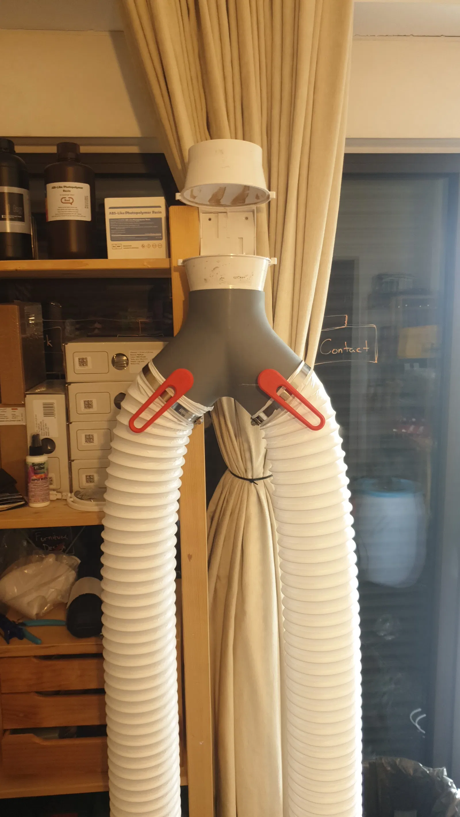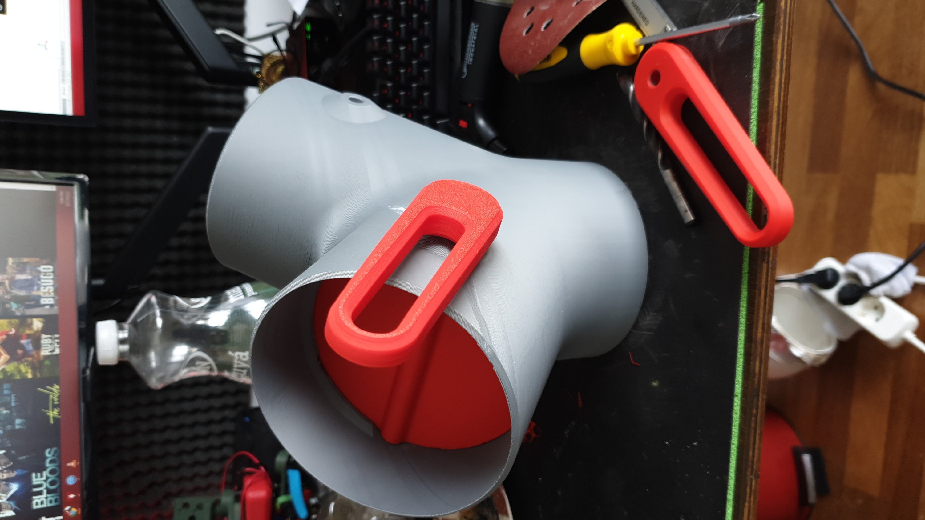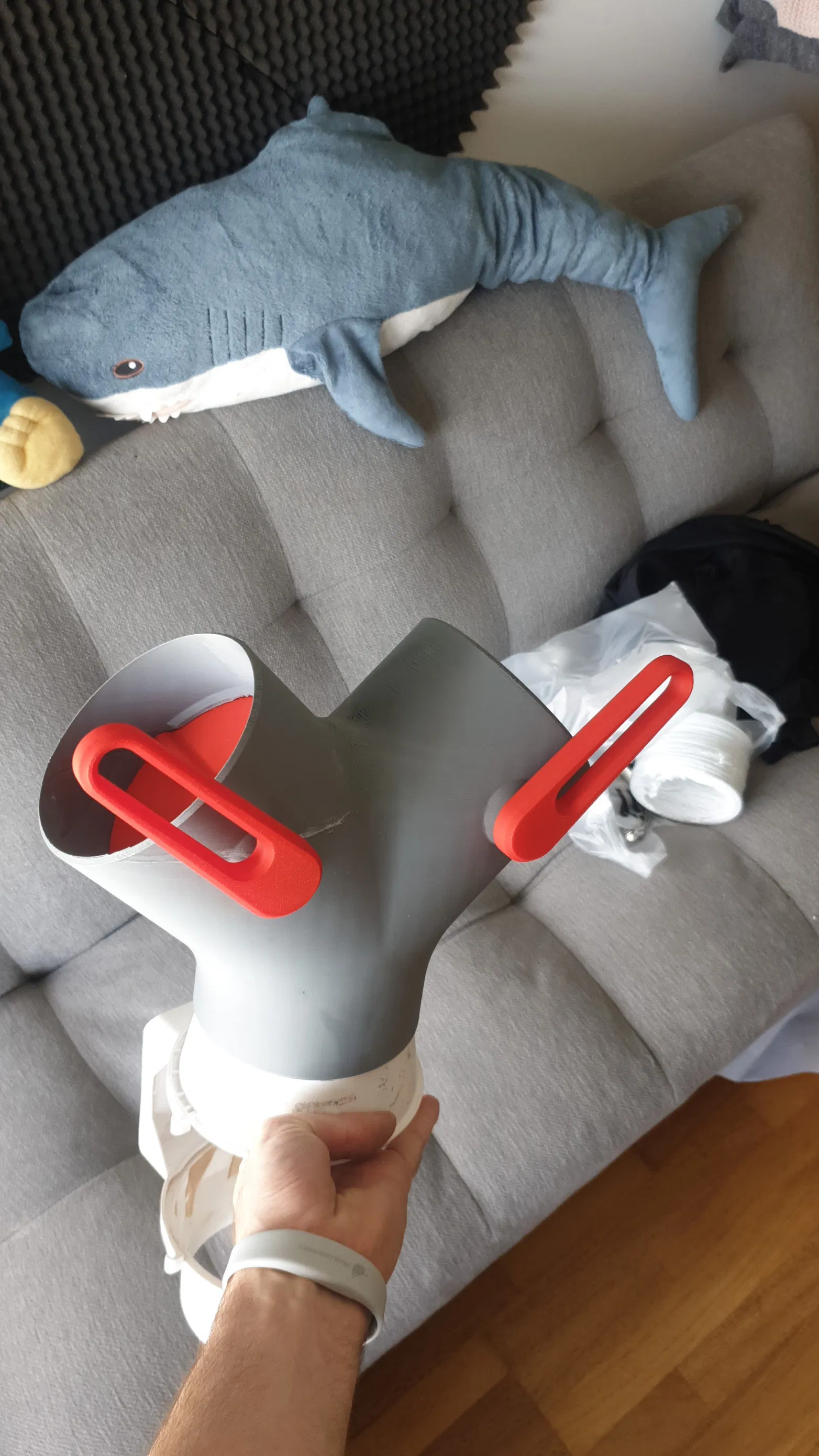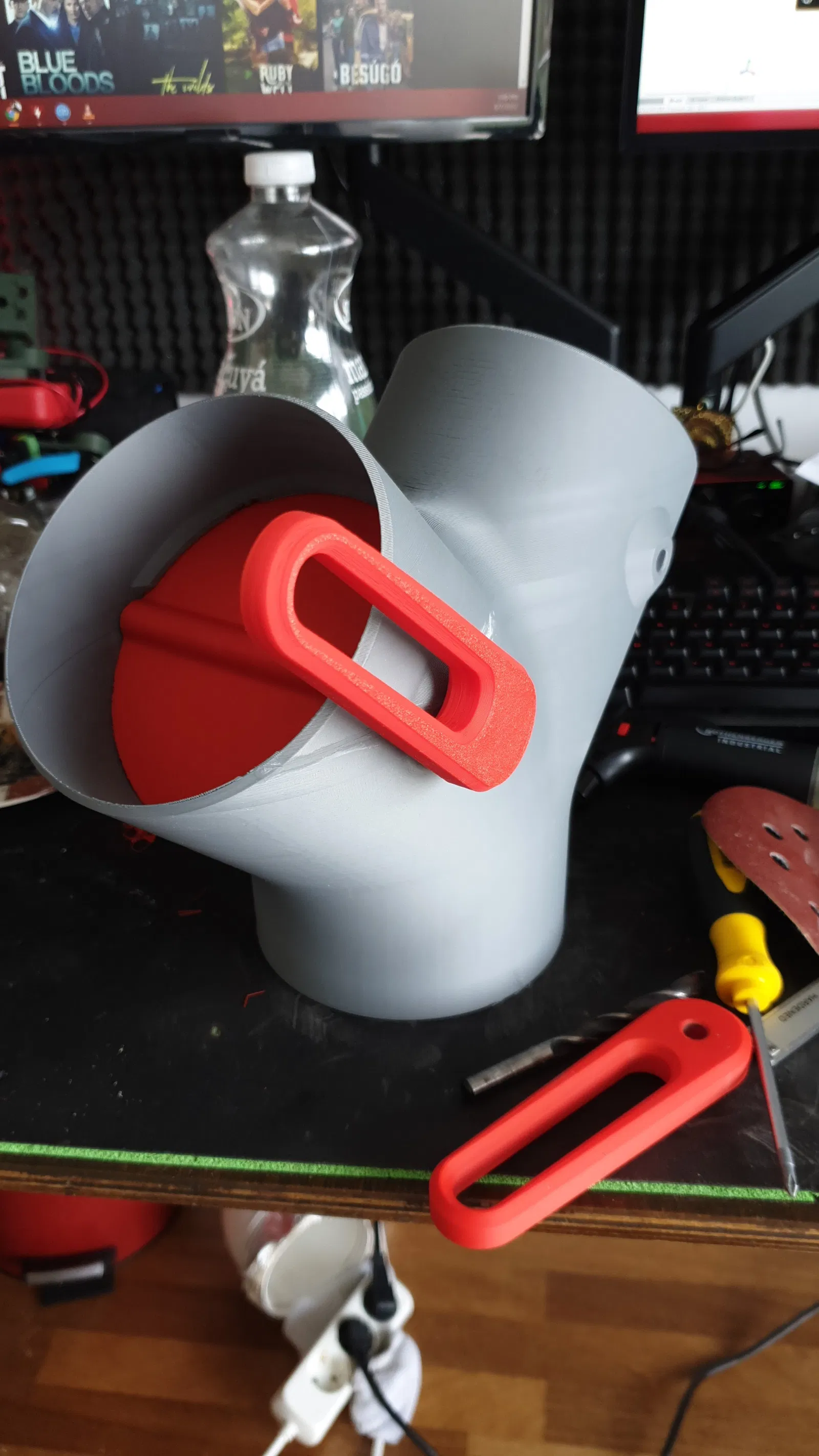 Ống thông gió cho tủ máy in resin và CNC của tui. Cần một giải pháp để chia đường khí cho quạt 125mm gắn trong ống ra cả hai bên, nên tui nghĩ ra cái này.