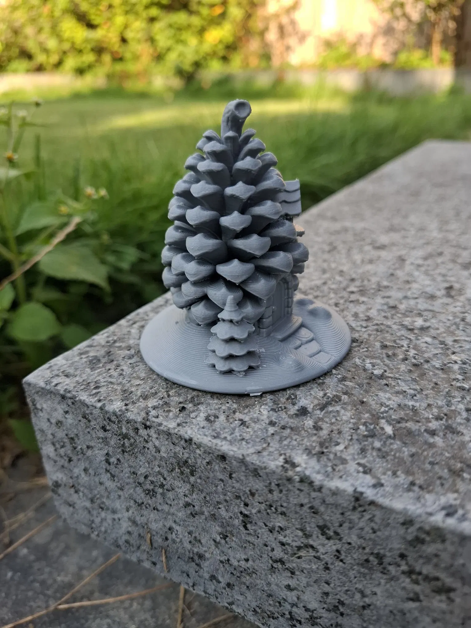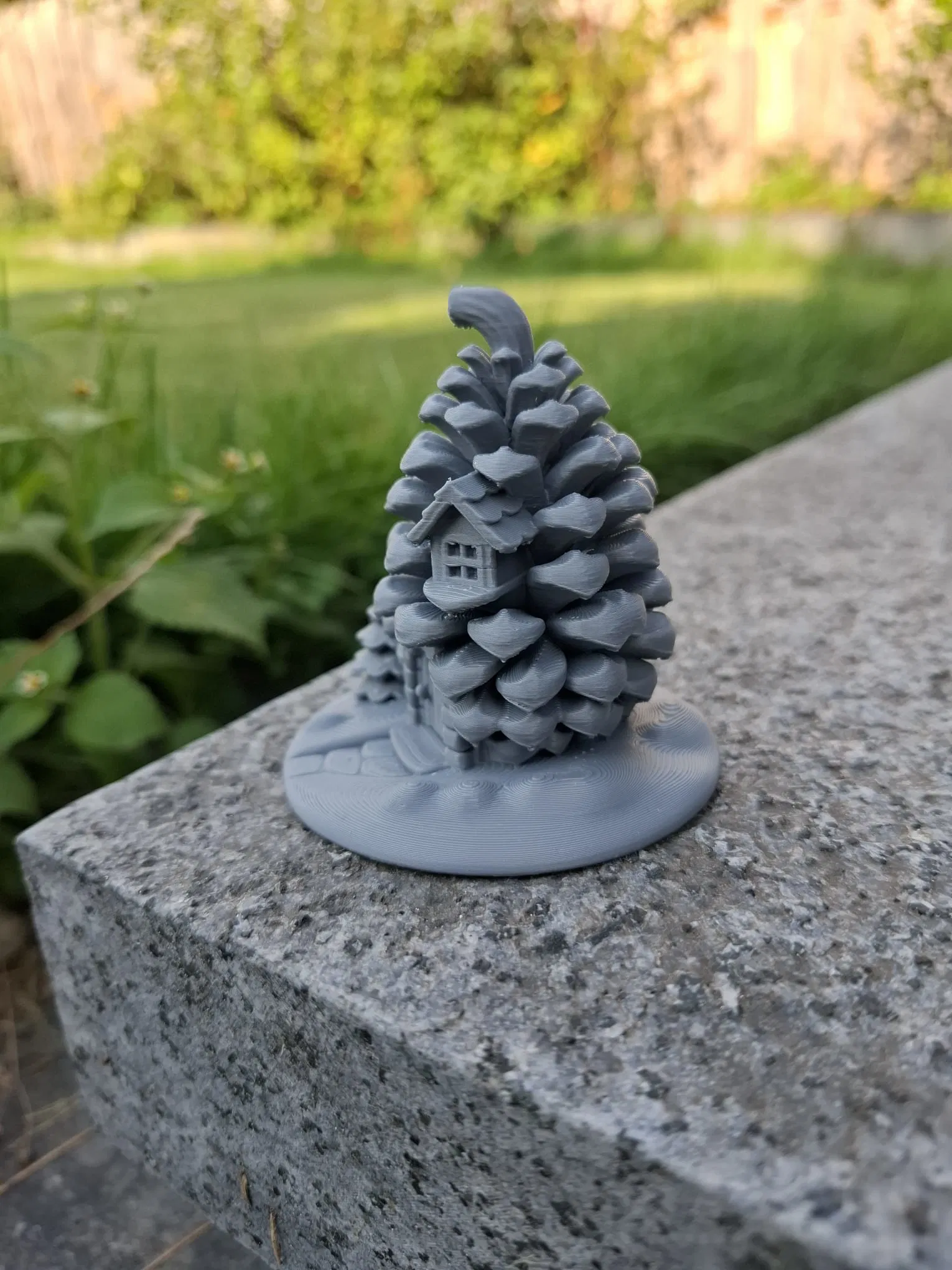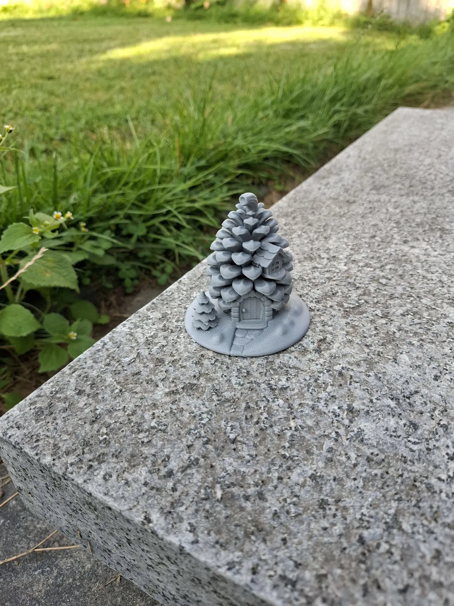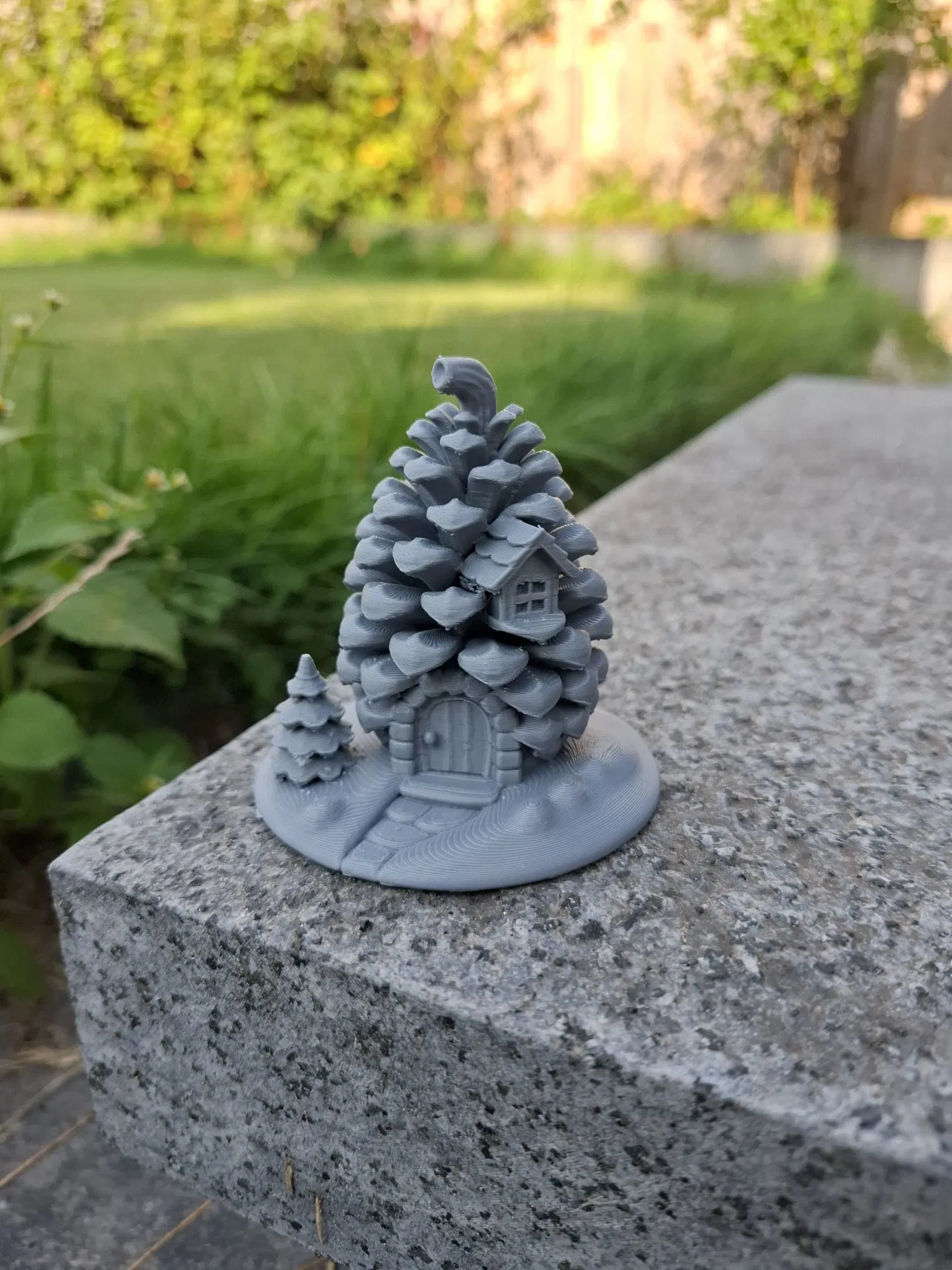 Một ngôi nhà cổ tích ấm cúng giữa rừng, được tạc từ một cây thông khổng lồ! Cửa trước hình vòm, cửa sổ nhỏ có chớp, cây thông mini và lối đi lát đá trên bệ tròn. Hoàn hảo cho tiểu cảnh vườn tiên, làng mùa đông hoặc làm vật trang trí kệ độc đáo.