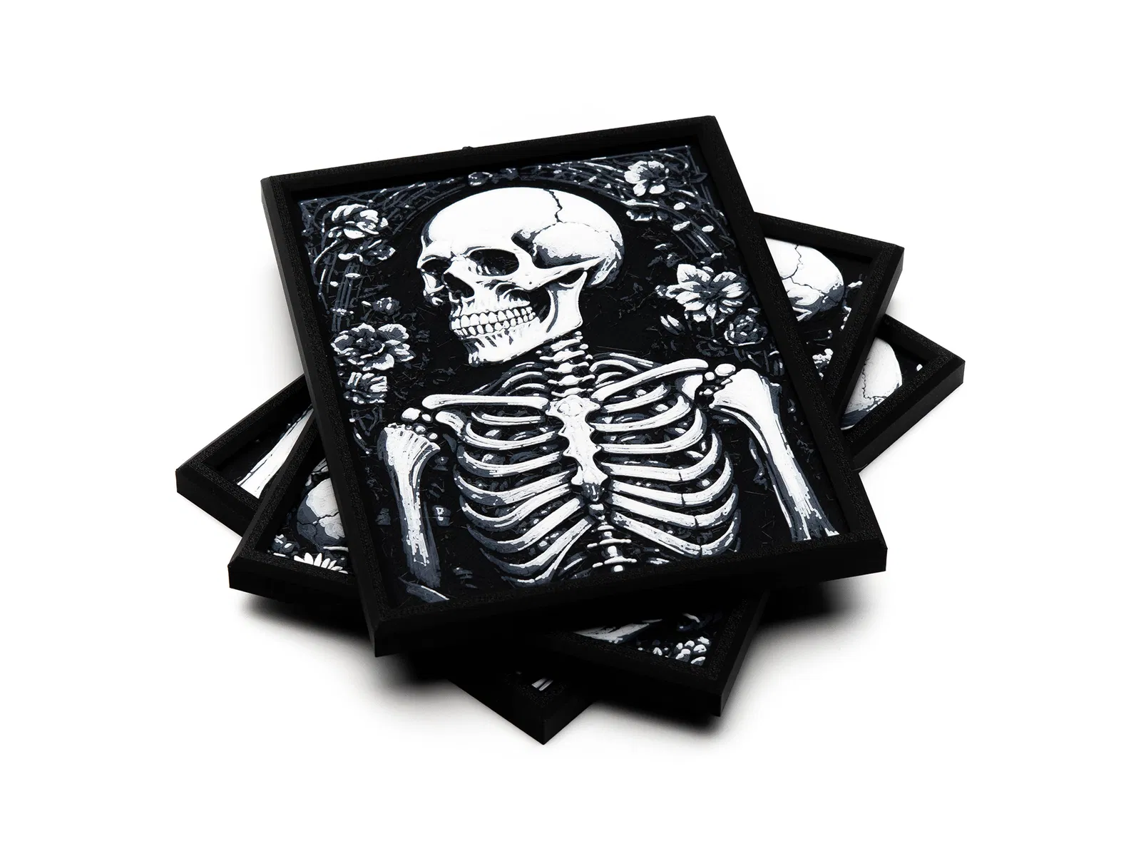 Bộ tranh treo tường gồm ba món với thiết kế bộ xương theo phong cách gothic mạnh mẽ. Khung lắp ráp nhanh, dễ dàng thay đổi màu sắc thủ công. Phù hợp làm đồ trang trí nhà cửa, văn phòng, quà tặng độc đáo dịp Halloween.