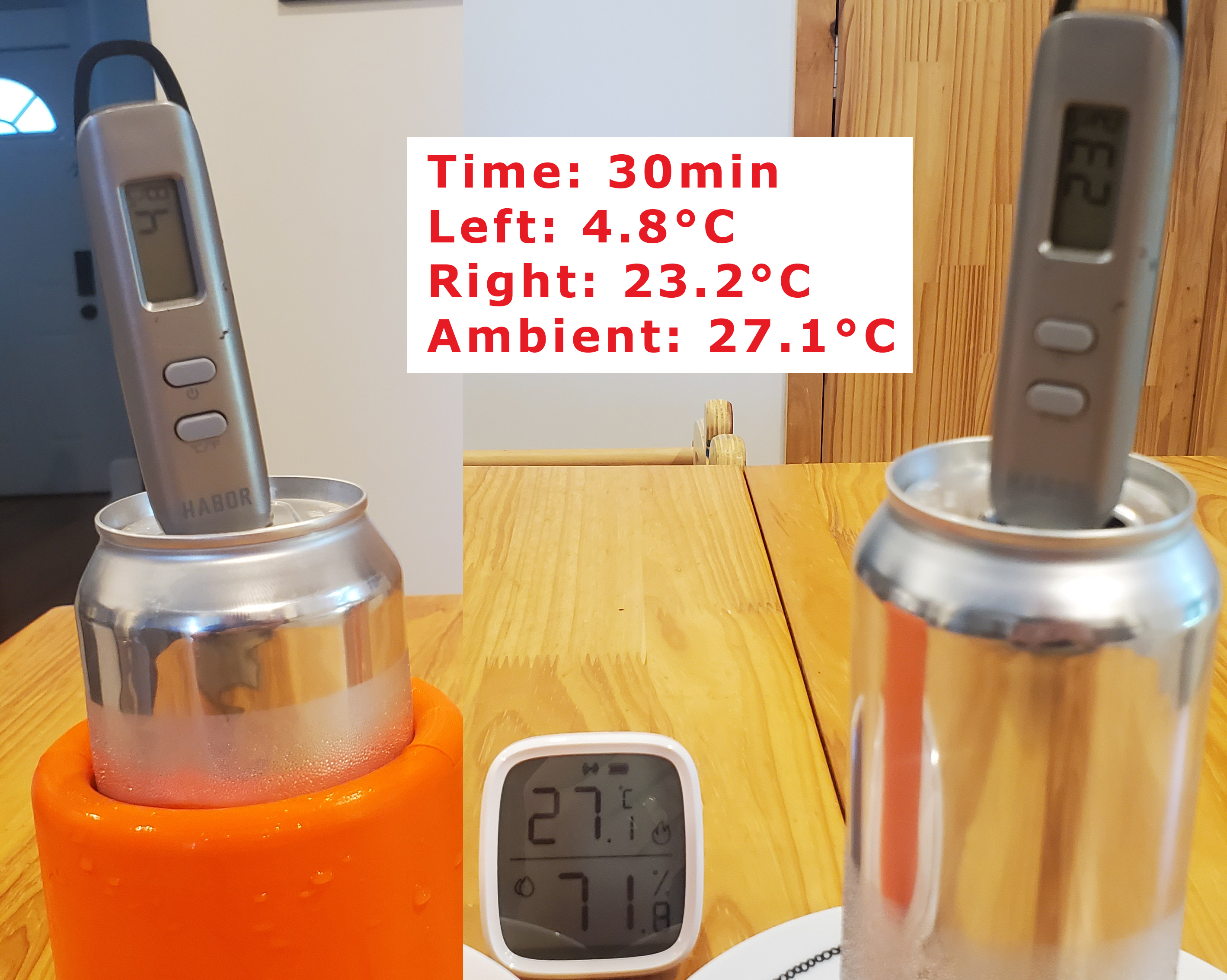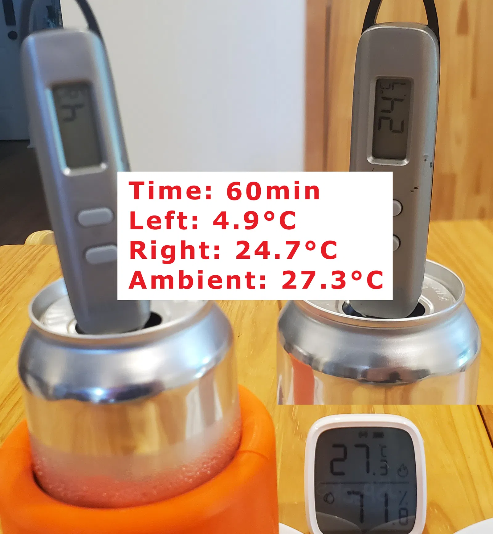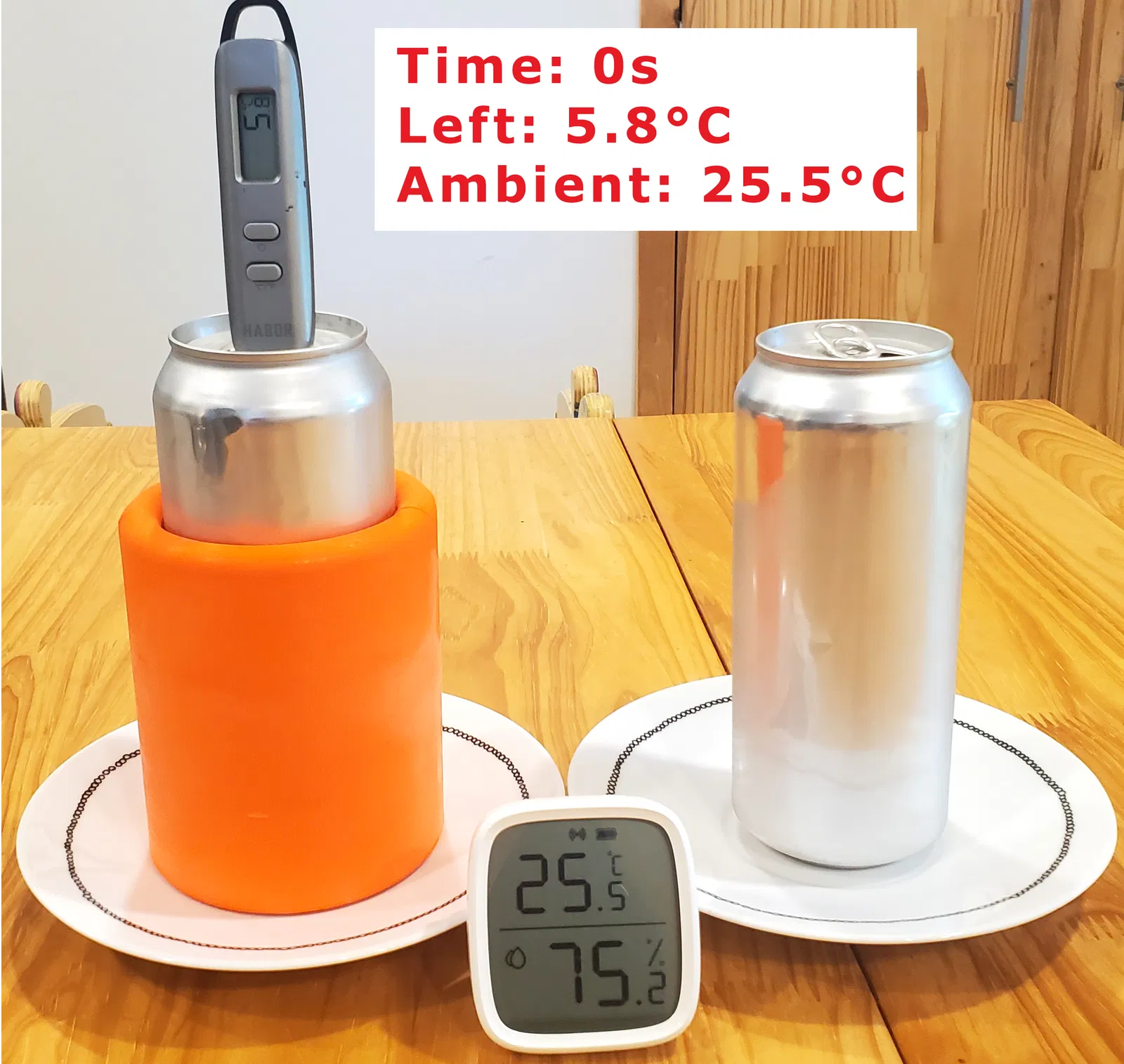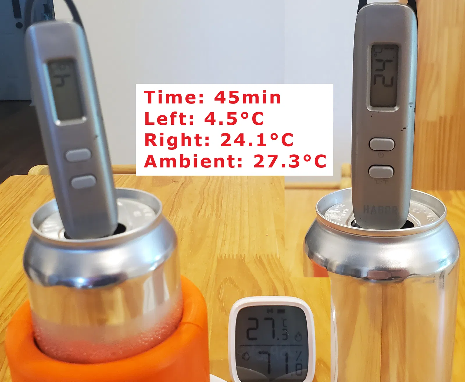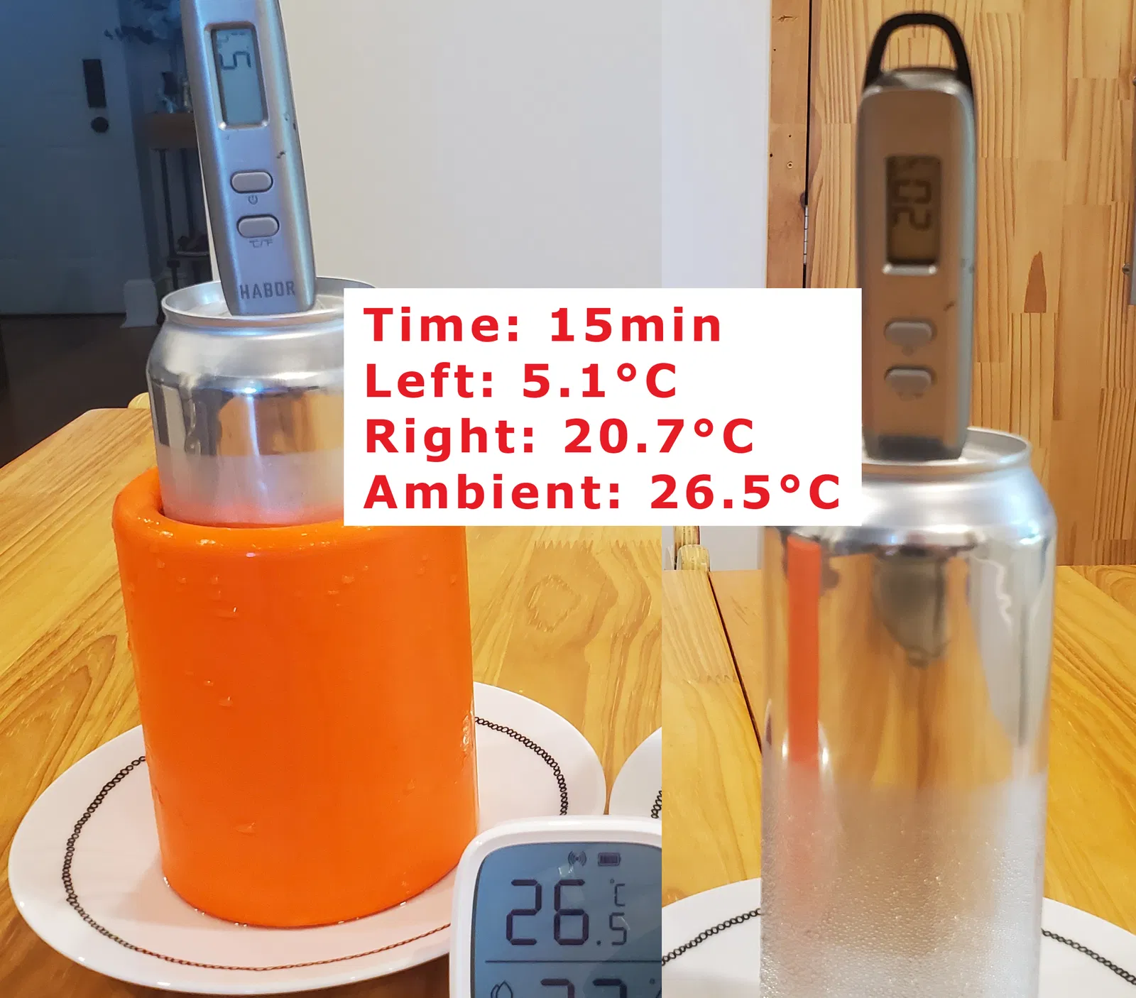 Mình đã thử nghiệm thiết kế bằng cách đặt hai lon giống hệt nhau (đổ đầy nước) vào tủ lạnh 24h. Sau khi lấy ra, một cái cho vào giữ lạnh, cái còn lại để bên ngoài. Mình đo nhiệt độ sau mỗi 15 phút — cái trong giữ lạnh giữ lạnh lâu hơn đáng kể.