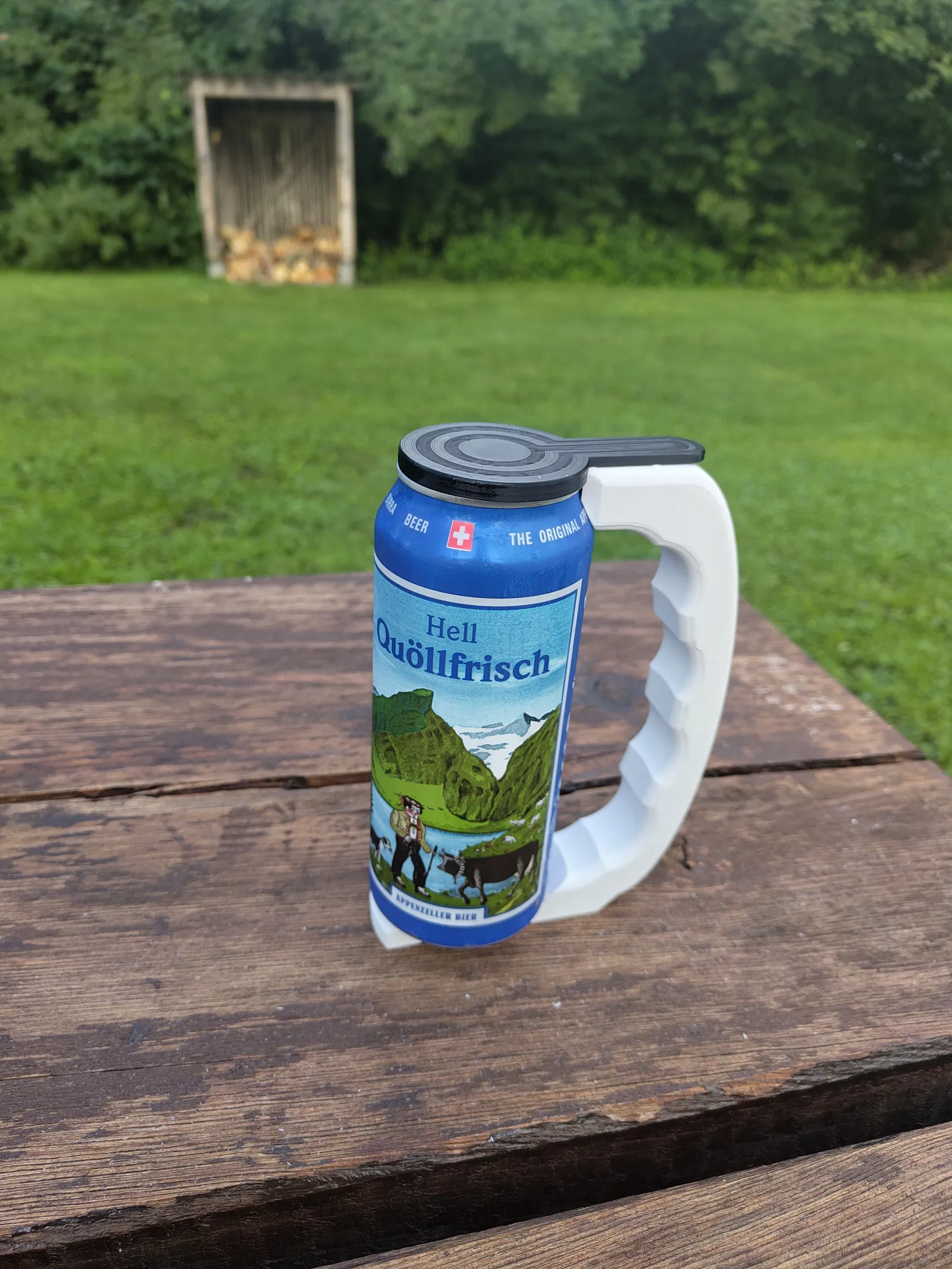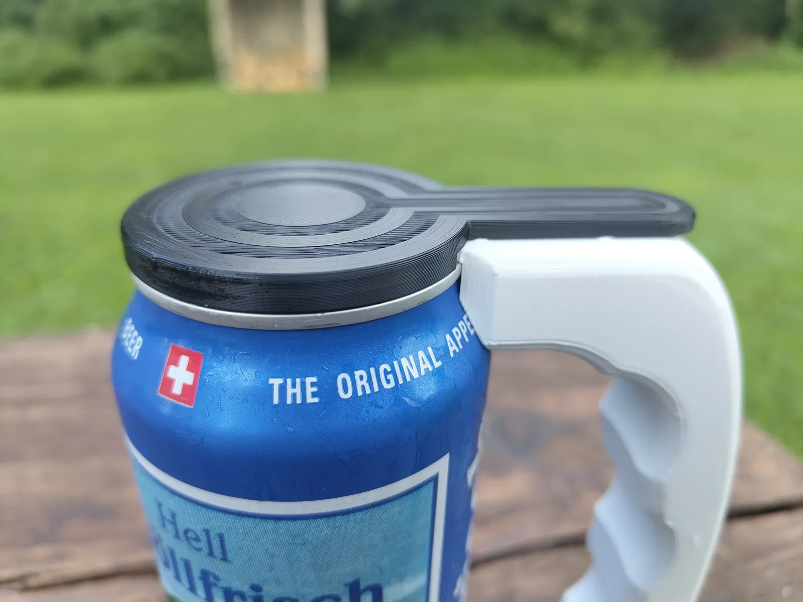 Một giá đỡ lon tối giản cho lon 500 ml tiêu chuẩn. Lon được đặt từ trên xuống và khớp vào vị trí ở đáy; lấy ra cũng theo chiều ngược lại. Giá đỡ bám vào lon nhờ hình dáng tự nhiên của nó. Nắp xoay bảo vệ miệng lon khỏi côn trùng và bụi bẩn – lý tưởng để sử dụng ngoài trời vào mùa hè. Mô hình này nhẹ, có chức năng và cần có vật liệu hỗ trợ khi in.