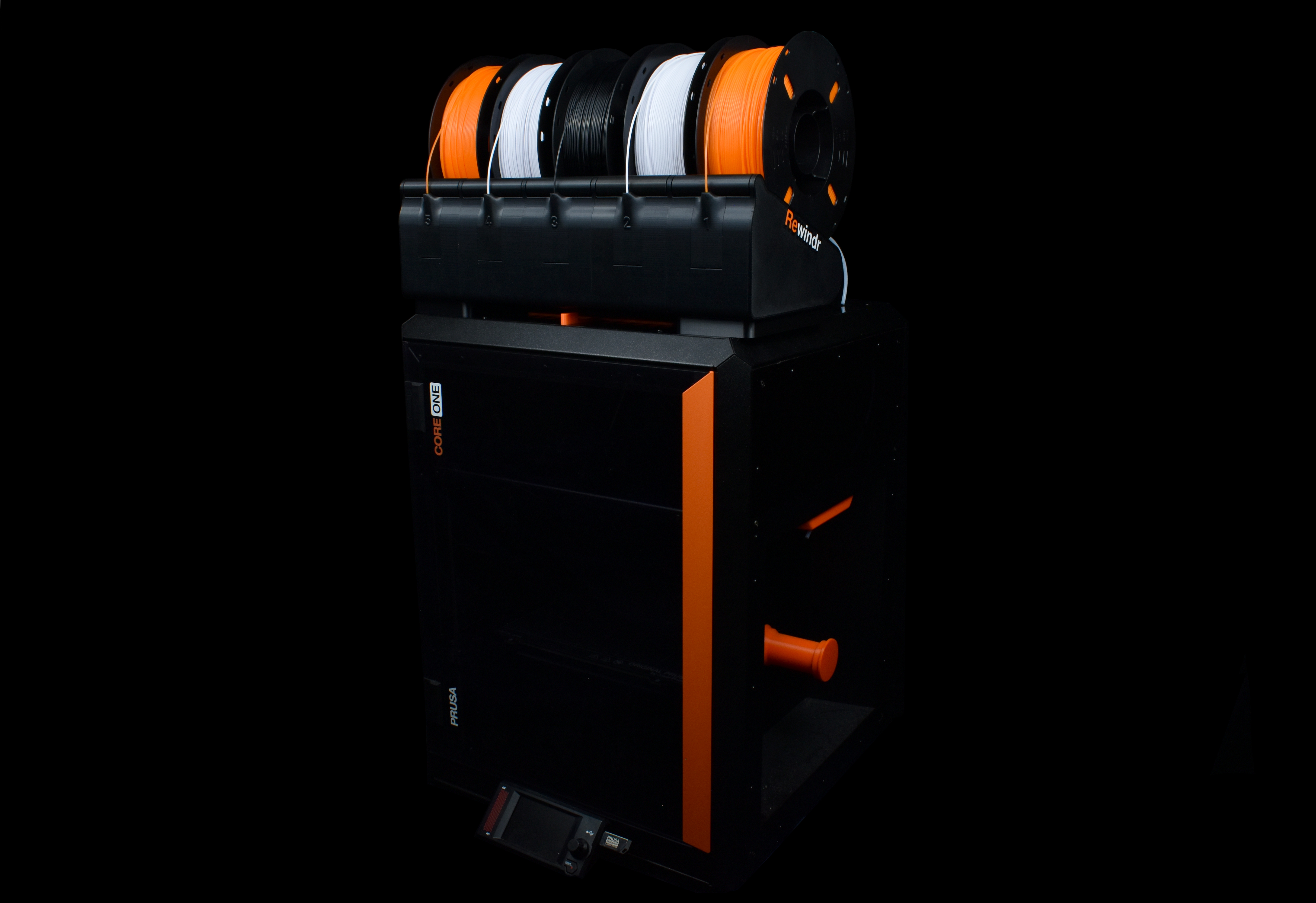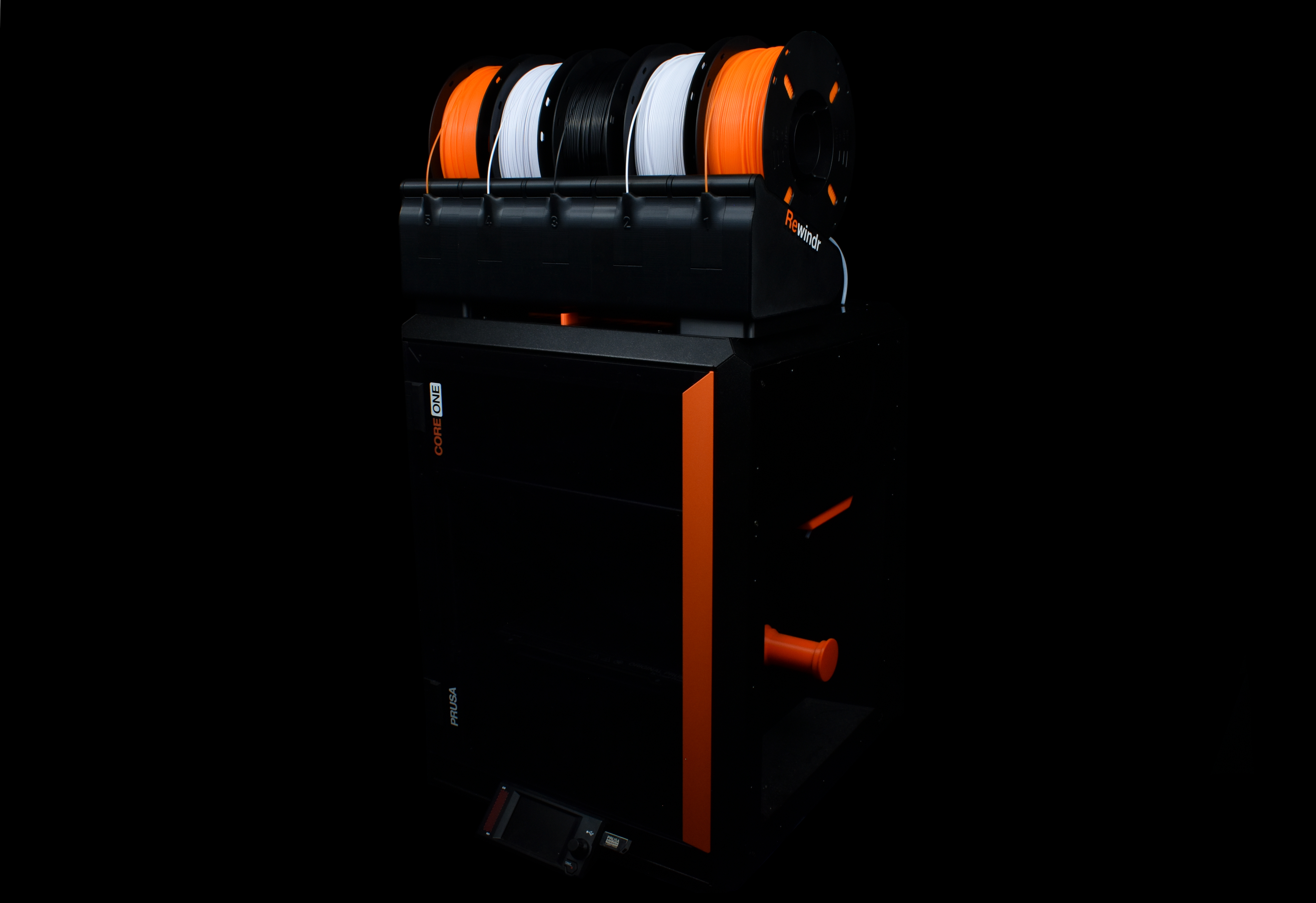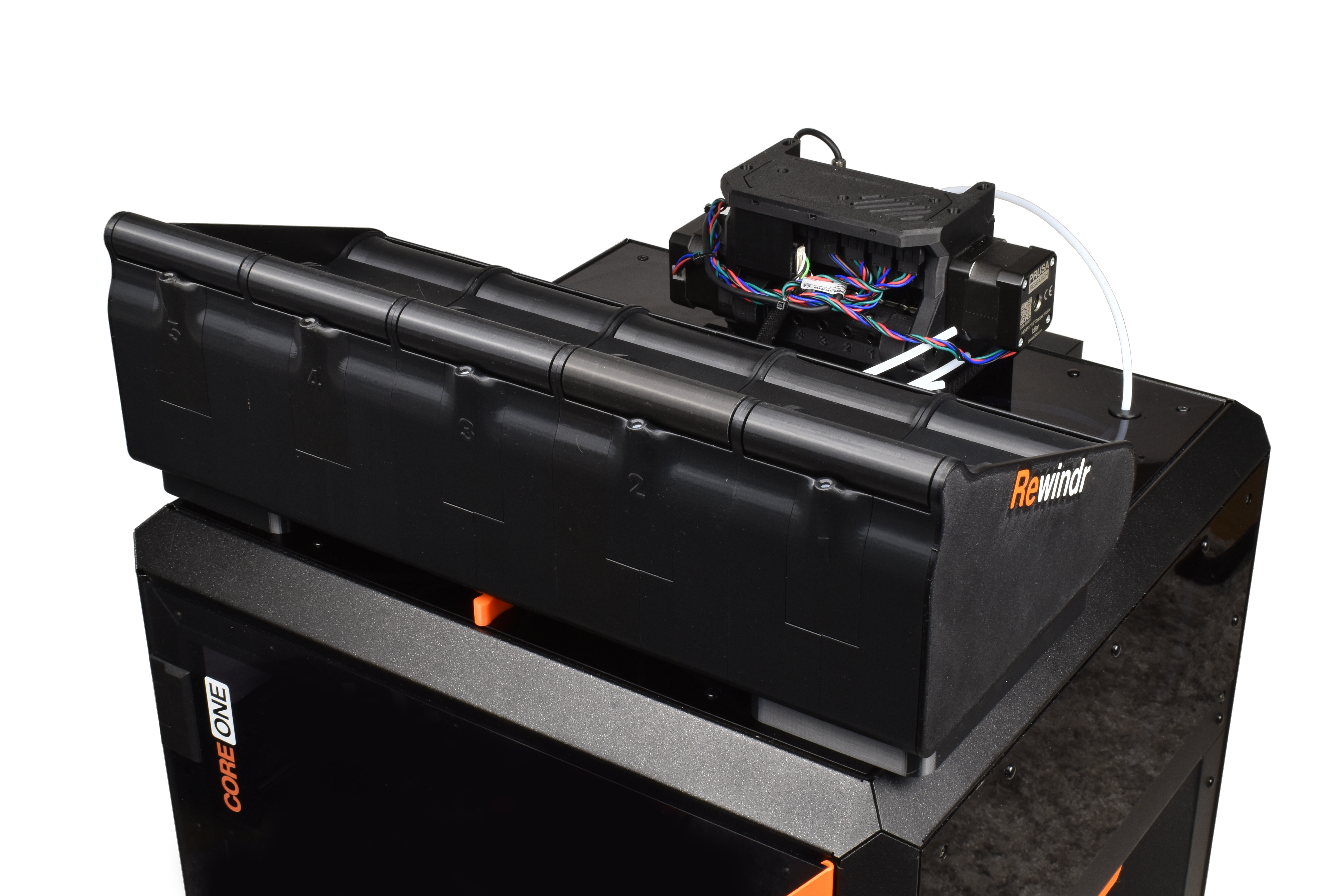 Rewindr được đặt trên đỉnh CORE One, ngay bên cạnh MMU3. Điều này có nghĩa là đường đi của dây tóc cực kỳ ngắn, giúp việc nạp liệu trở nên dễ dàng. Rewindr được gắn vào các giá đỡ đặc biệt, cho phép luồng không khí đi qua bên dưới các giá đỡ cuộn dây. MMU3 được gắn vào một giá đỡ đặc biệt ở phía sau, giúp việc tháo lắp/bảo trì trở nên dễ dàng.