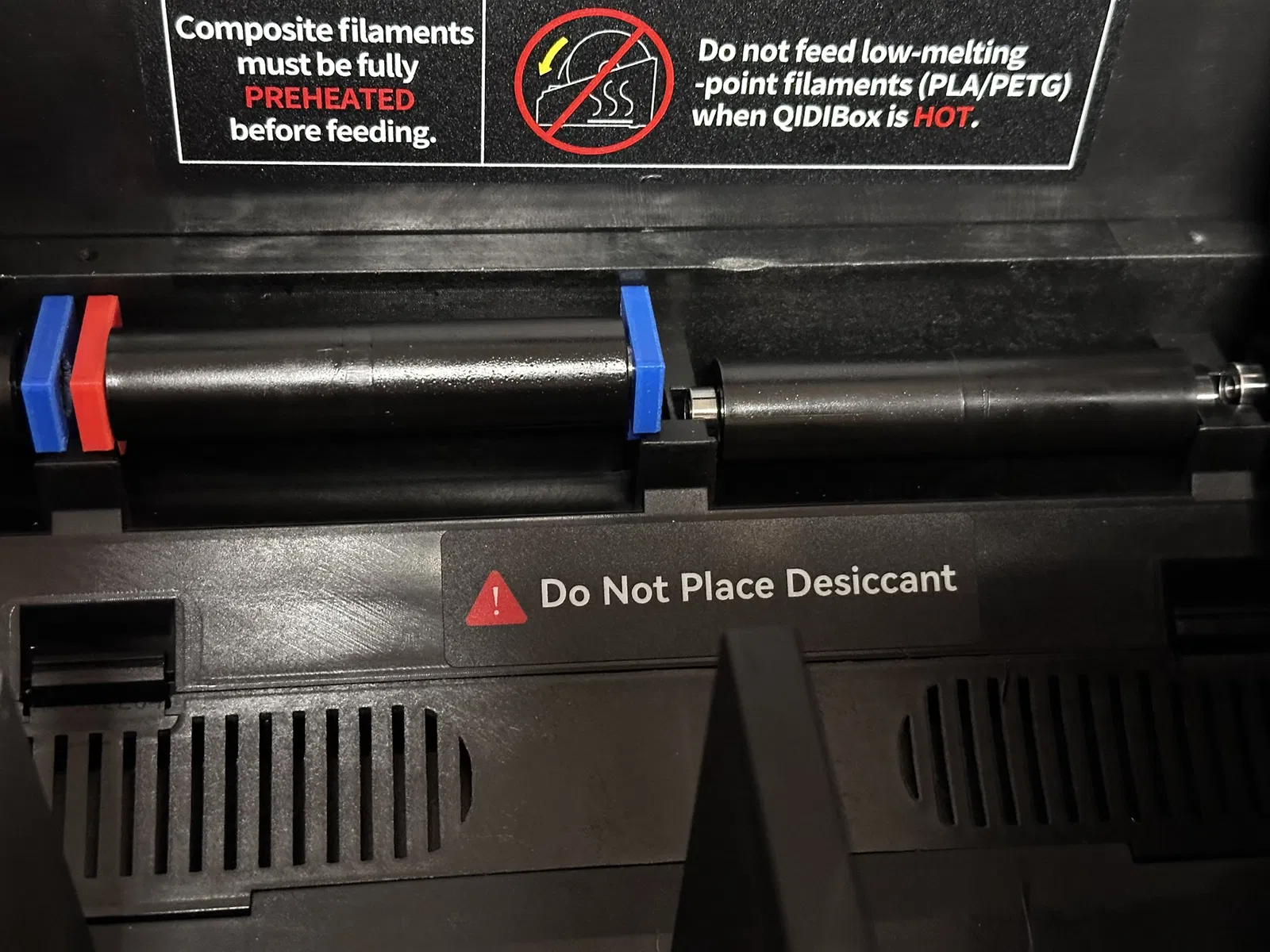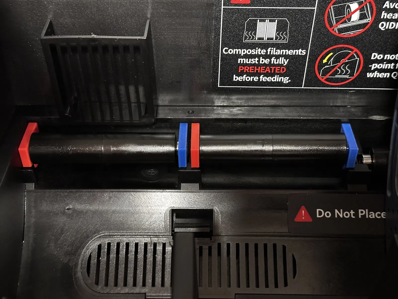 Một số cuộn dây filament — như cuộn SUNLU có đường kính chỉ khoảng ~195 mm — quá nhỏ để nằm đúng trên con lăn trước và sau. Thay vào đó, chúng nằm trên đáy của hộp, làm cho cuộn dây không thể quay tự do.