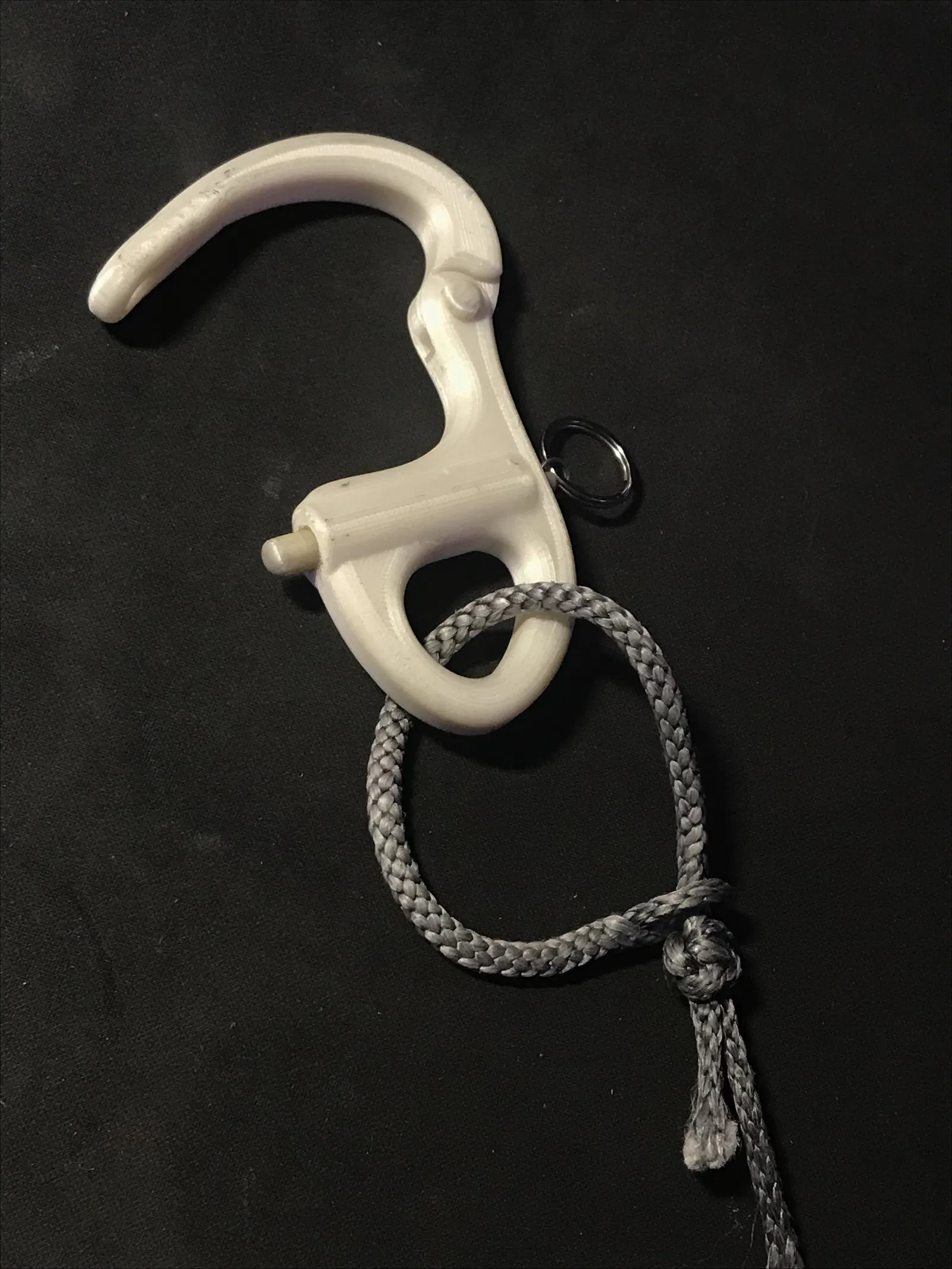 Snap shackle này xài cho rigging nhẹ ok lắm, scale lên xài cũng được. Cần in thêm parts, lò xo, và dây/vòng xoắn nhỏ. Lắp ráp đơn giản, chỉ cần luồn lò xo, chốt gài, cố định, rồi gắn chốt xoay. In với độ dày lớp 0.20mm, bật supports, infill 100% cho chốt xoay/chốt gài, và in các bộ phận nằm ngang để chắc chắn.
