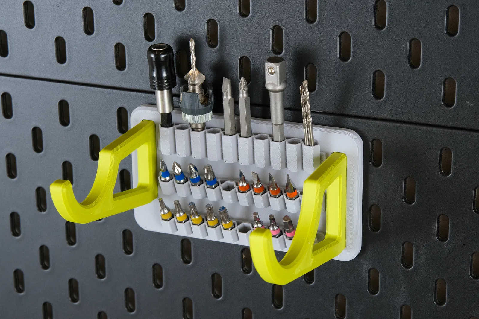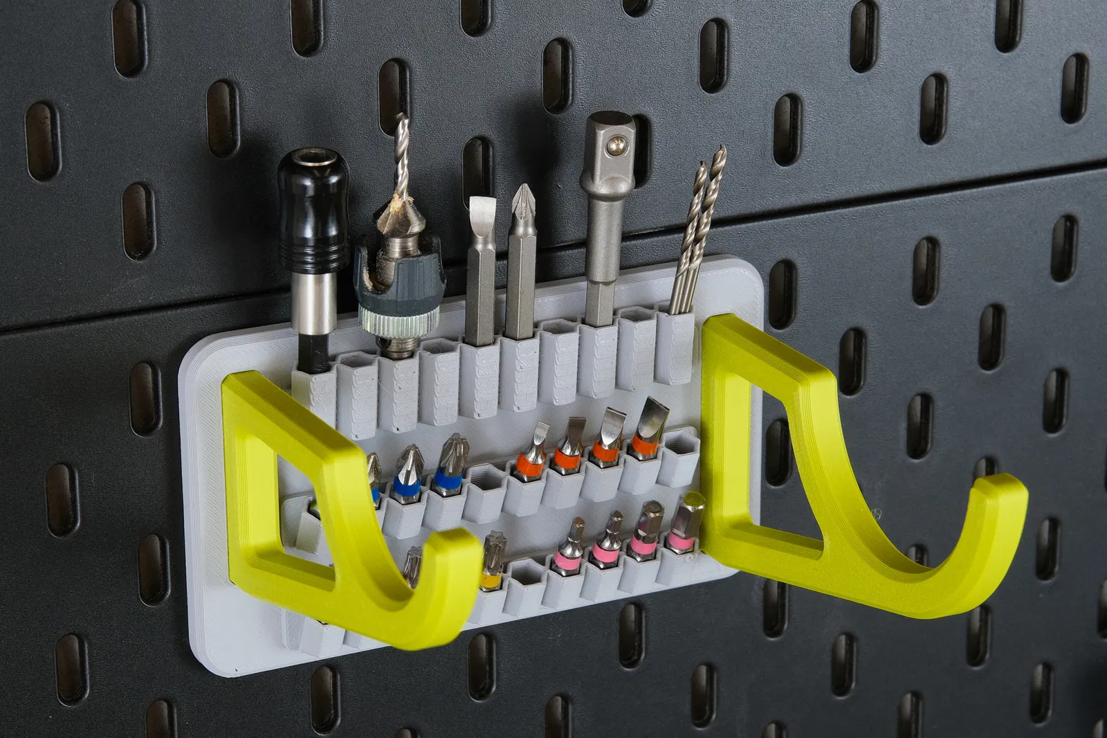 Móc treo cho phép bạn dễ dàng lấy máy khoan và có chỗ để mũi khoan, phụ kiện bên dưới. Các móc in rời và dán vào đế, sử dụng keo siêu dính dạng gel để đảm bảo độ chắc chắn.