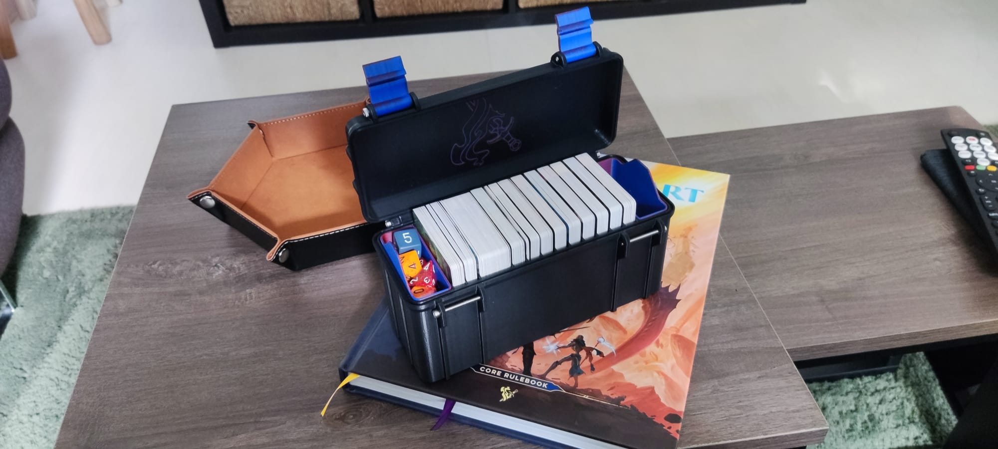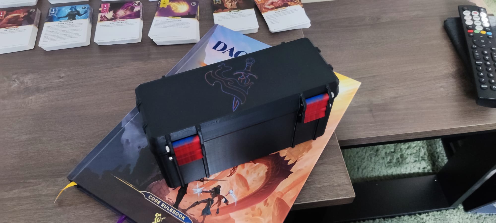 Một chiếc hộp chắc chắn cho những lá bài đi kèm với sách luật cốt lõi của Daggerheart TTRPG.