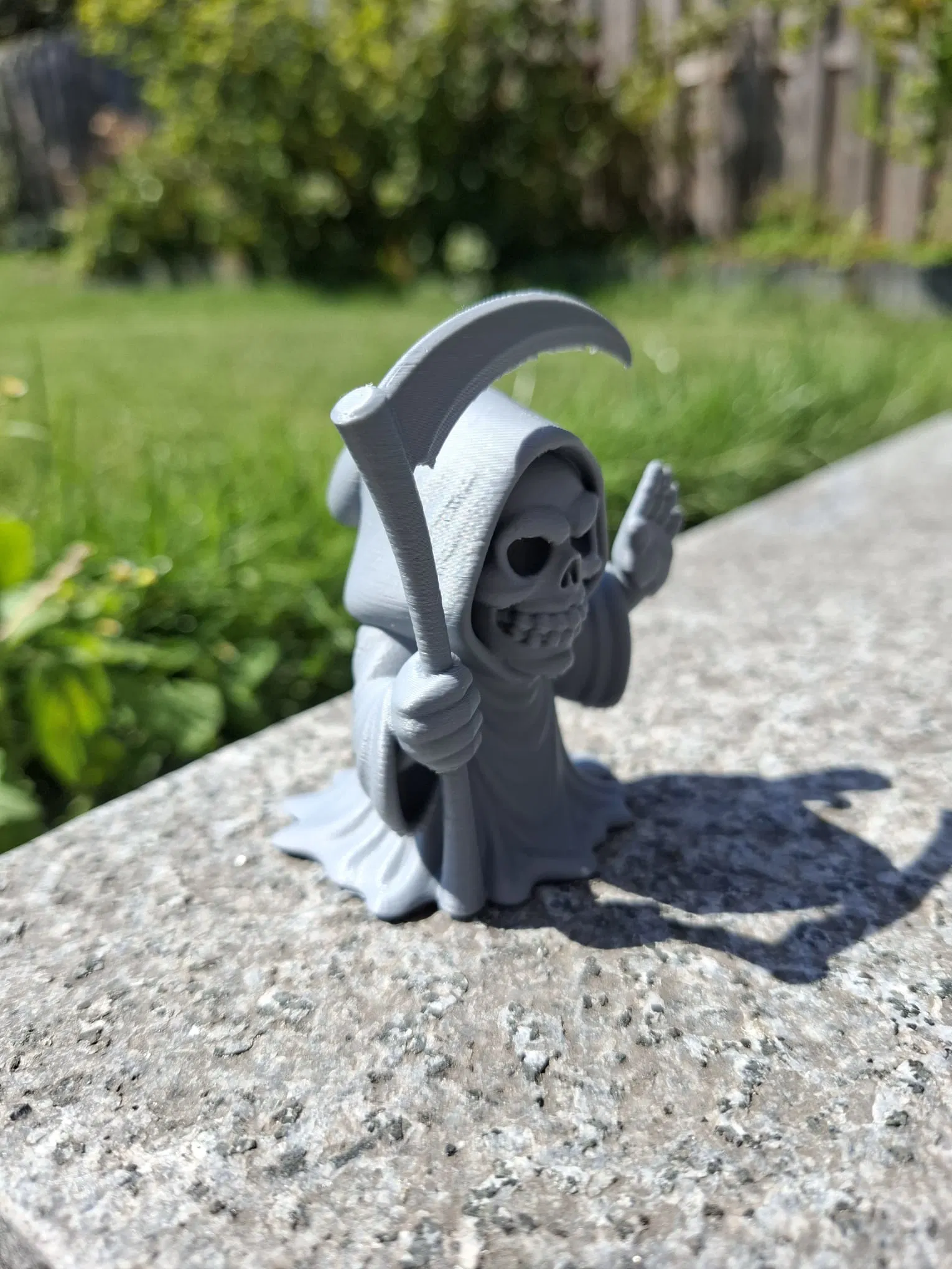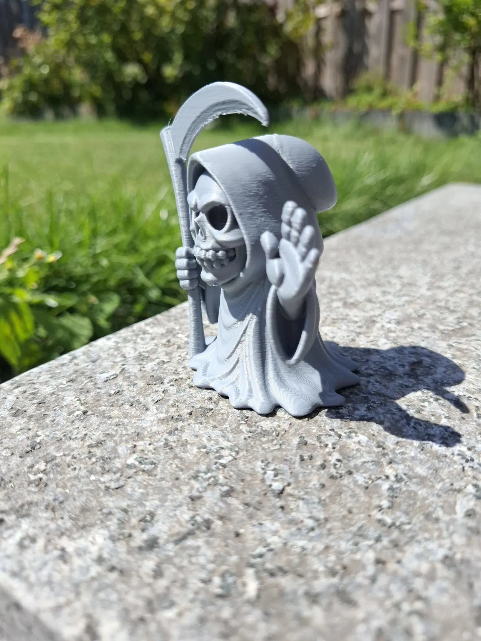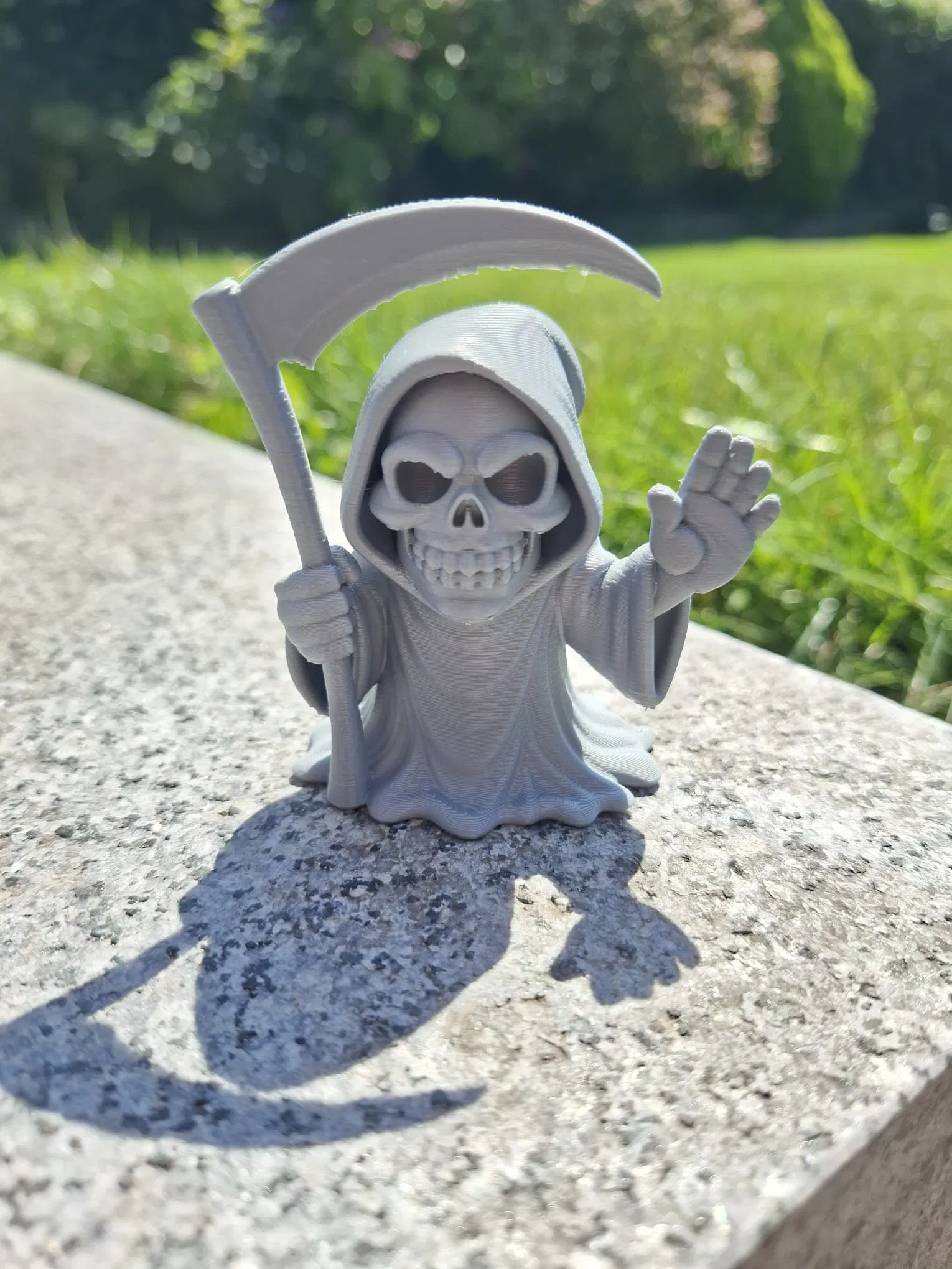Khoác lên mình chiếc áo choàng trùm đầu bồng bềnh, bộ xương vui vẻ này vẫy tay chào bằng một tay, tay kia nắm chắc lưỡi hái quá khổ.