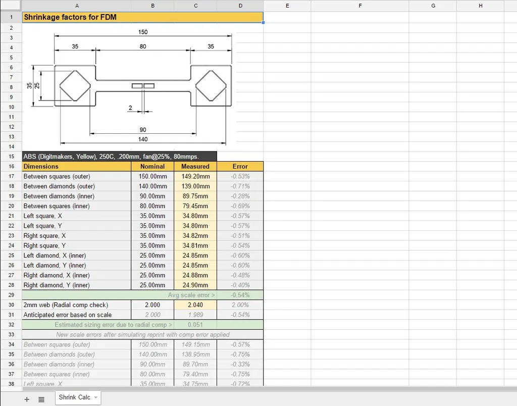 Tiếp theo, bảng tính tính toán lại lỗi scale tìm thấy ở các chi tiết lớn hơn bằng cách 'mô phỏng' bạn in lại mẫu với bù bán kính đã được điều chỉnh, sau đó lấy trung bình các giá trị này làm lỗi scale cuối cùng cho slicer của bạn.