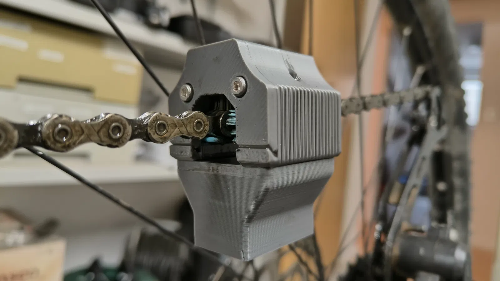 Tuy nhiên, việc sử dụng WD-40 bên trong bộ phận làm sạch lại có một lợi ích bất ngờ: nó giúp dầu lan tỏa tốt giữa các mắt sên. Vì vậy, tôi quyết định chỉnh sửa mô hình này nghiêng về việc bôi dầu và làm sạch hơn là chà xát vật lý.
