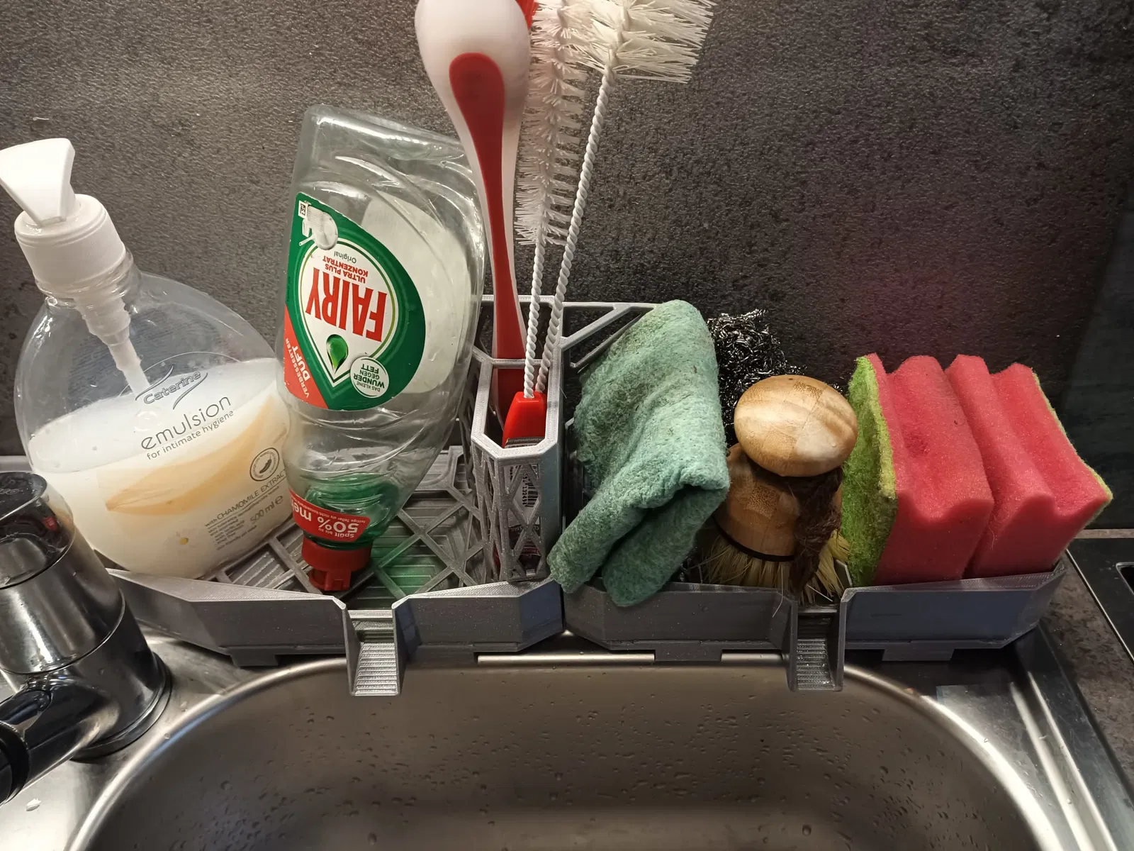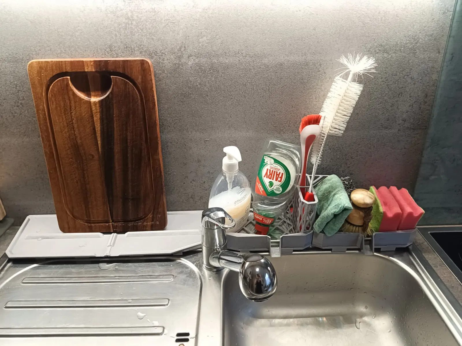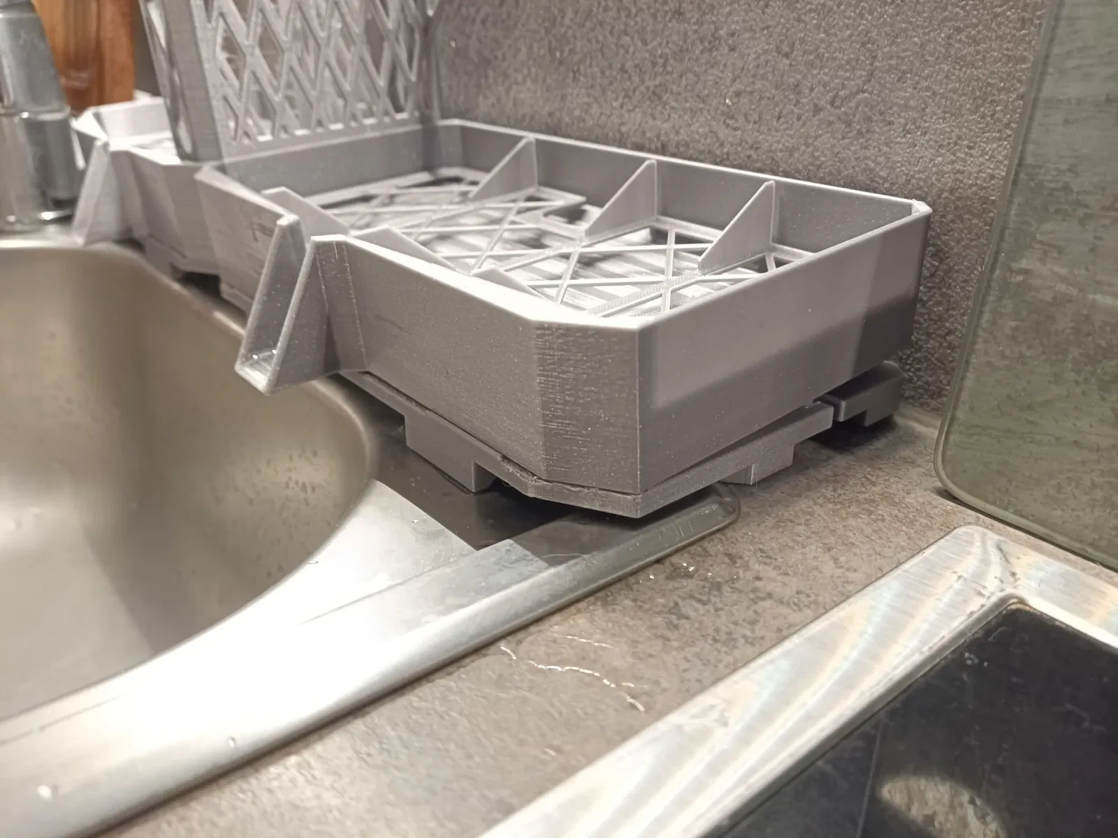 Nền tảng cơ bản của mỗi mô-đun được tối ưu hóa cho bồn rửa tiêu chuẩn như chúng tôi có. Nó được thiết kế để các mô-đun có độ sâu hơn một chút và do đó nhô ra một chút vào bồn rửa để nước có thể chảy vào bồn rửa. Các chân được tối ưu hóa để chúng cũng có thể tìm thấy chỗ giữ trong chính bồn rửa.