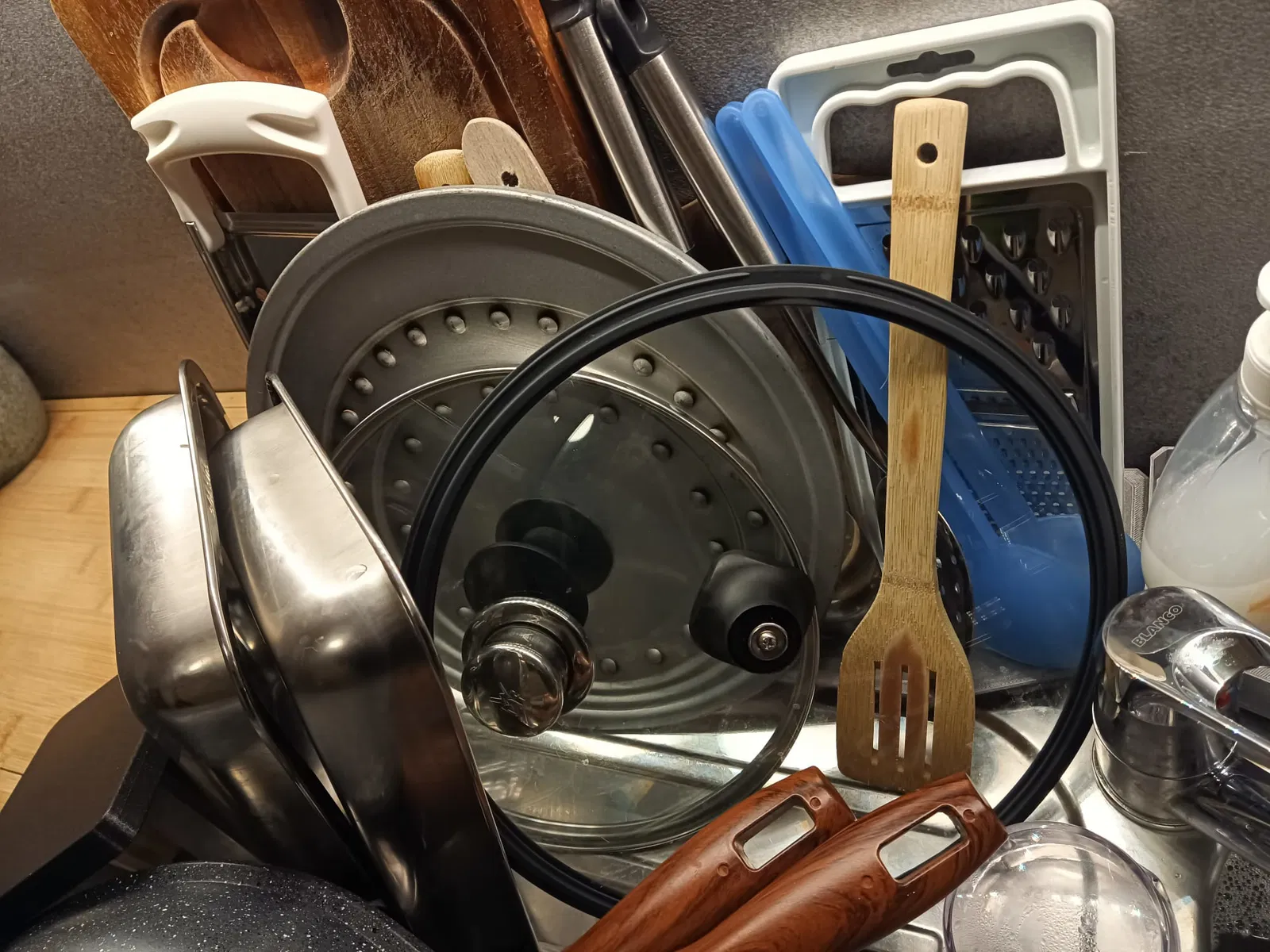 Như một phụ kiện, dù là một phần để đặt lên trên hay là một phần mở rộng độc lập khác, sẽ có một loại rổ đựng dao kéo mà bạn có thể đặt dao kéo đứng thẳng vào đó và nước cũng chảy ra. Như vậy dao kéo sẽ không bị văng lung tung và bị gãy trong bồn rửa.