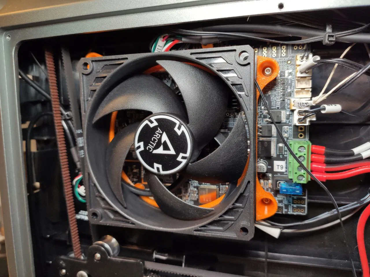 Giá đỡ quạt được giữ bằng ba ốc vít tiêu chuẩn. Nên in bằng PETG hoặc ABS. Và vâng - nắp thép dưới cùng không được tích hợp trong bản mod này, vì bạn sẽ phải khoét một lỗ khác trên nắp, và với độ dày của nó, đây sẽ là một việc không hề dễ dàng.
