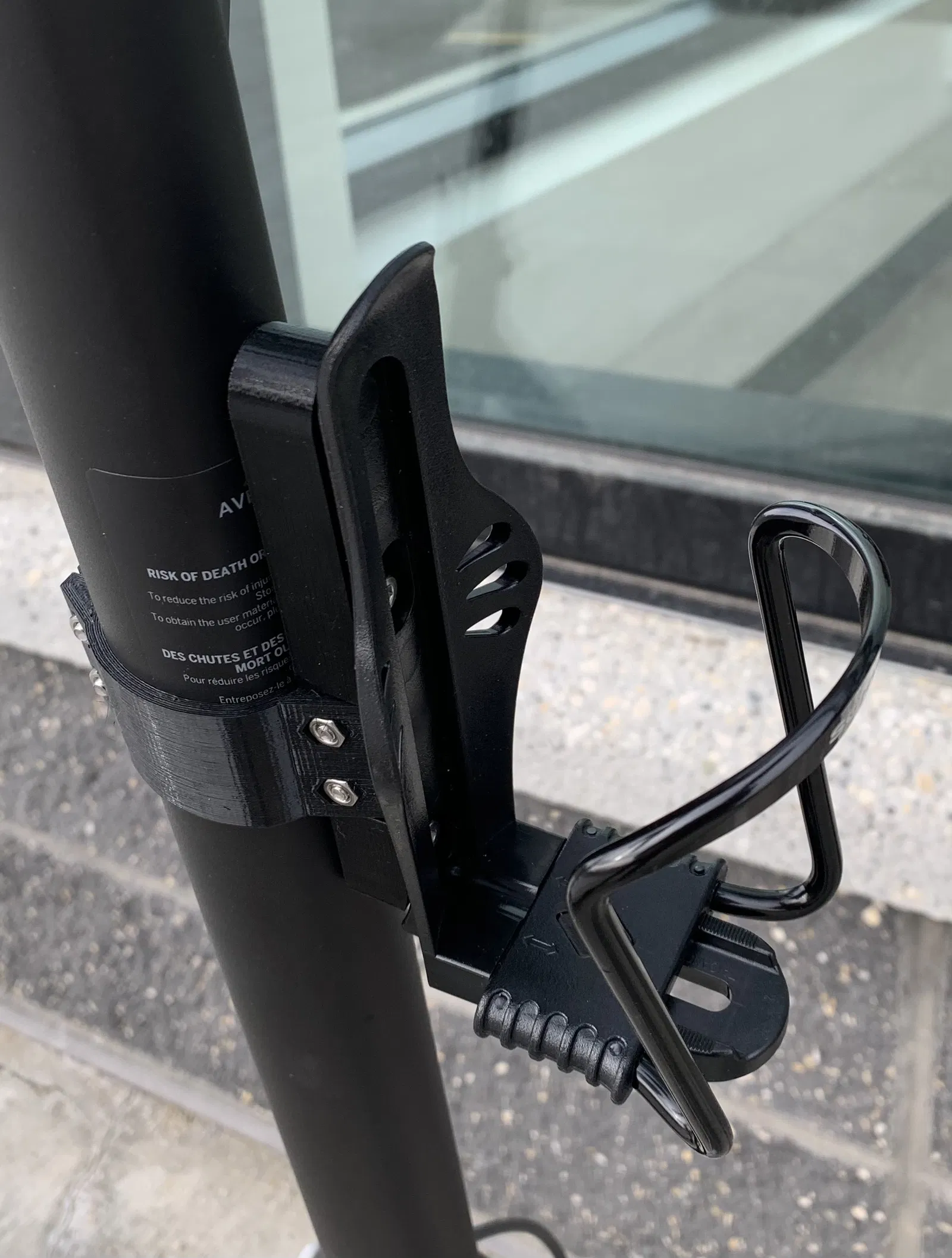 Tui làm cái đế gắn này là do tui muốn có chỗ để ly nước trên chiếc xe điện của tui. Hồi đó có nhiều loại cho xe đạp lắm (thậm chí có hệ thống gắn tiêu chuẩn luôn) mà lại chẳng có cái nào cho xe scooter hết. Cái đế gắn này sẽ bắt ốc vô phần cổ lái của xe scooter và cung cấp một cái ngàm tiêu chuẩn để bạn có thể gắn mấy cái đồ của xe đạp vô.