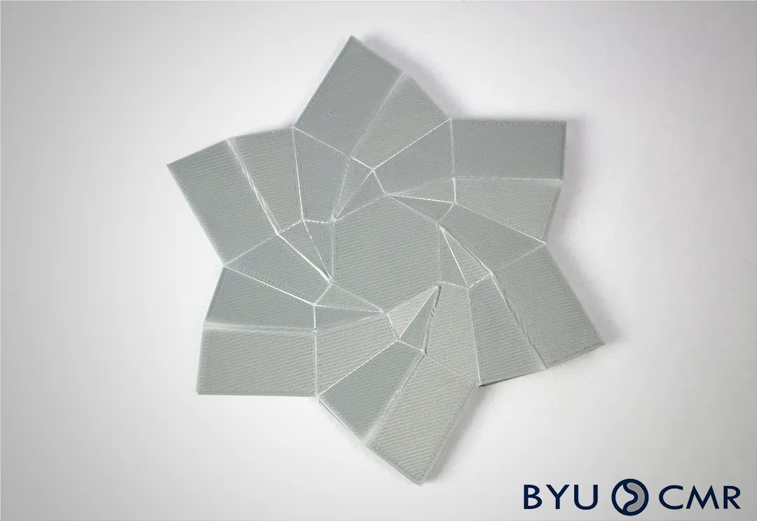 Đây là một mẫu flasher hình lục giác có thể in 3D, dựa trên công trình của Shannon Zirbel, Robert Lang và nhiều người khác. Nó thể hiện khả năng của mẫu flasher có thể chuyển từ trạng thái phẳng sang trạng thái gấp gọn hơn nhiều, tất cả trong khi di chuyển với một bậc tự do.