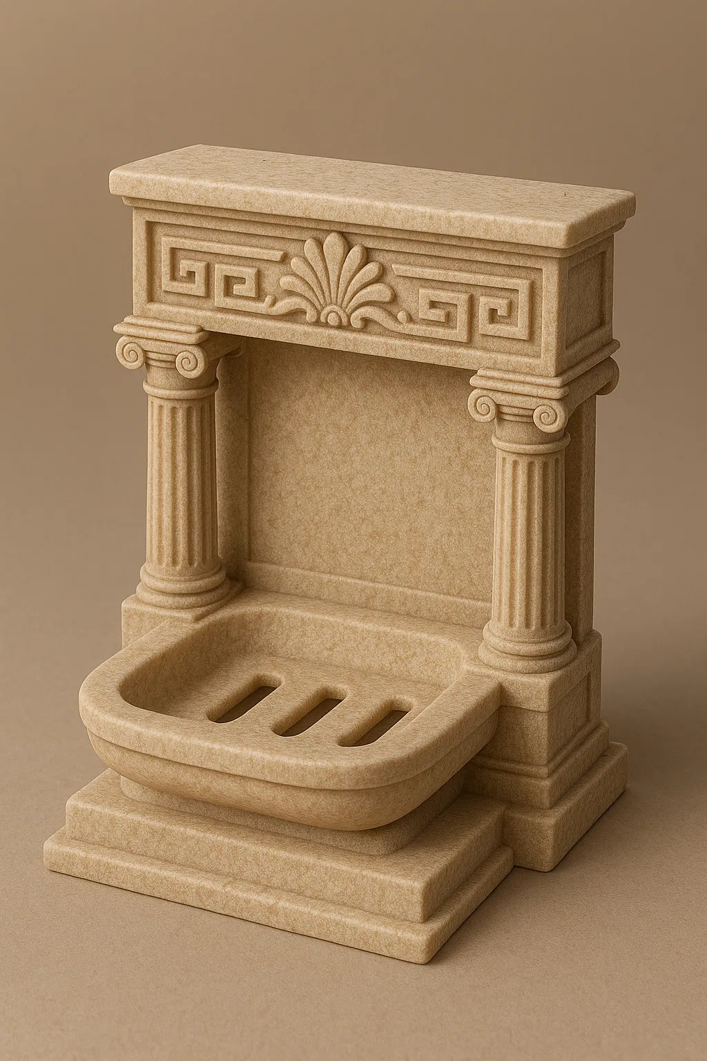 Một mẫu khay đựng xà bông độc đáo lấy cảm hứng từ kiến trúc Hy Lạp cổ đại, với thiết kế chi tiết tỉ mỉ gồm cột, phù điêu và hoa văn khóa Hy Lạp. Sản phẩm vừa trang trí, vừa tiện dụng cho phòng tắm, làm từ vật liệu giả đá sang trọng.