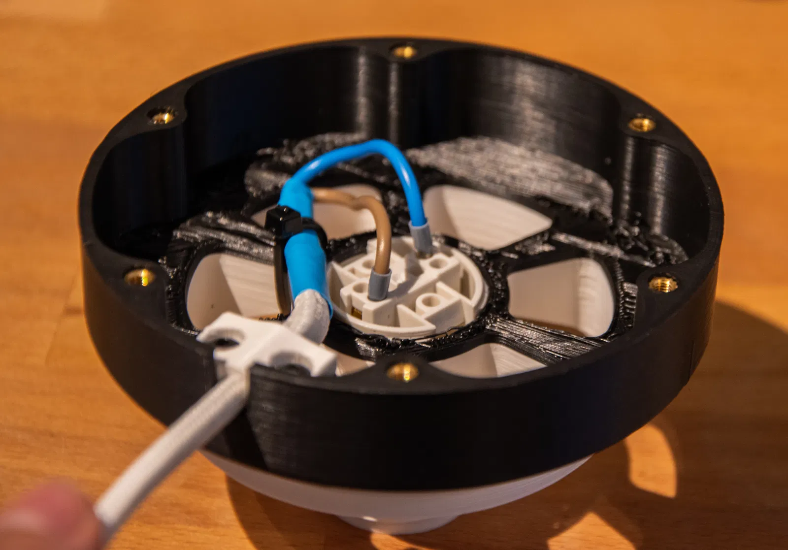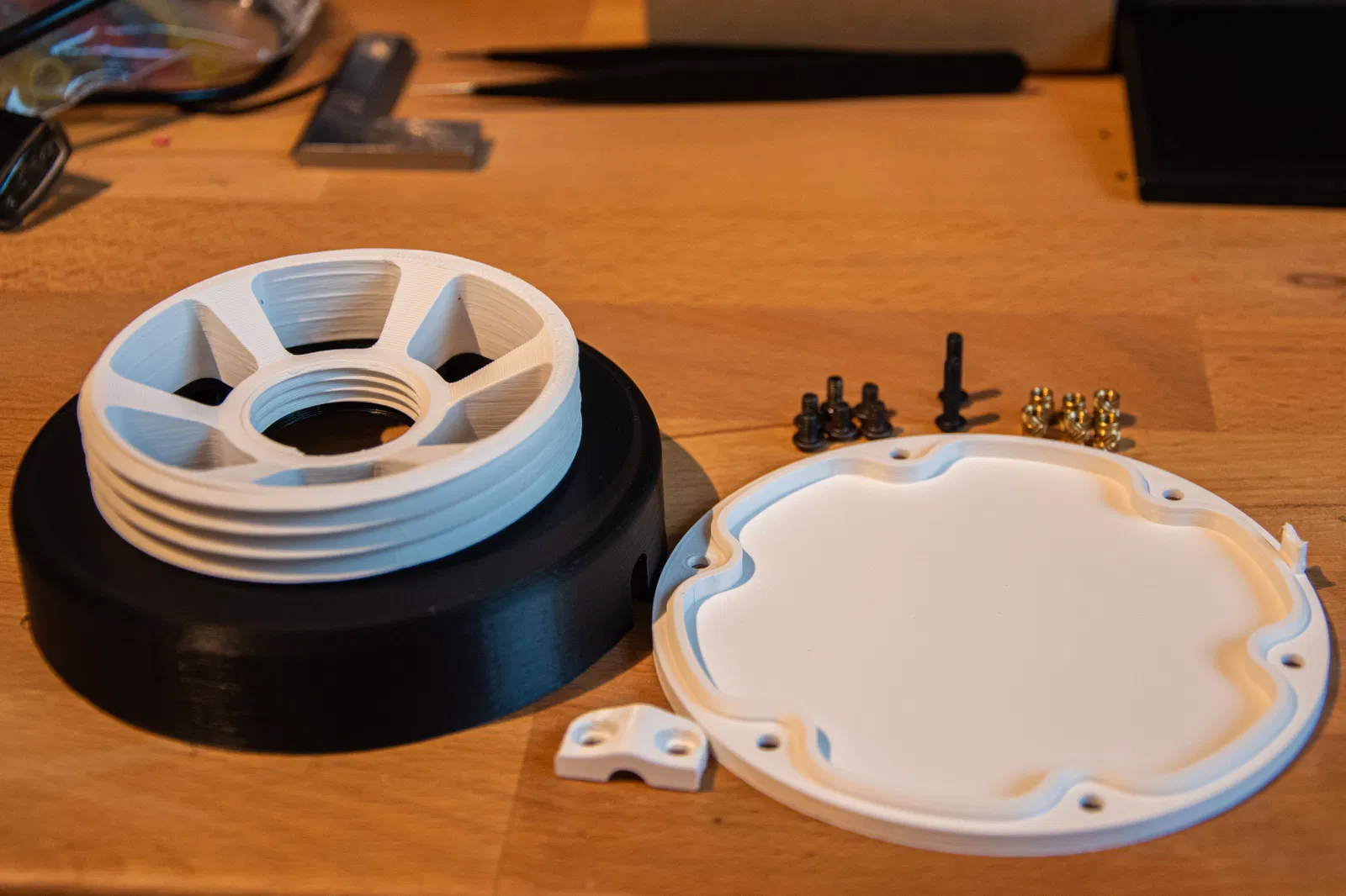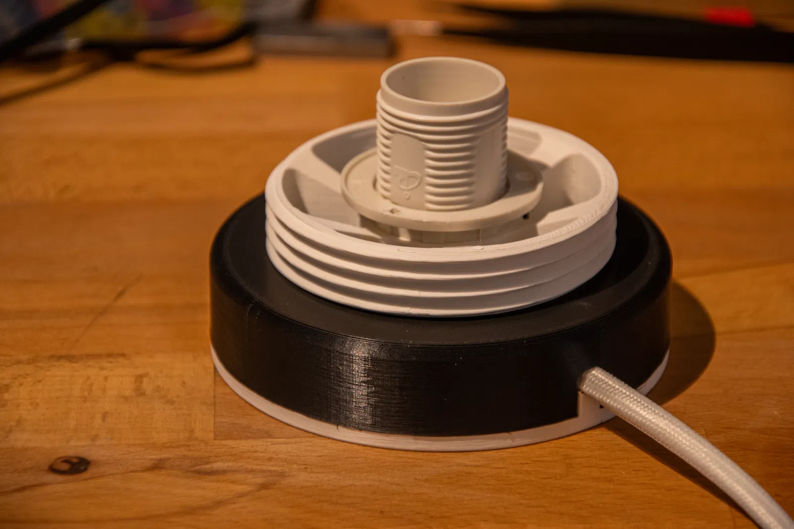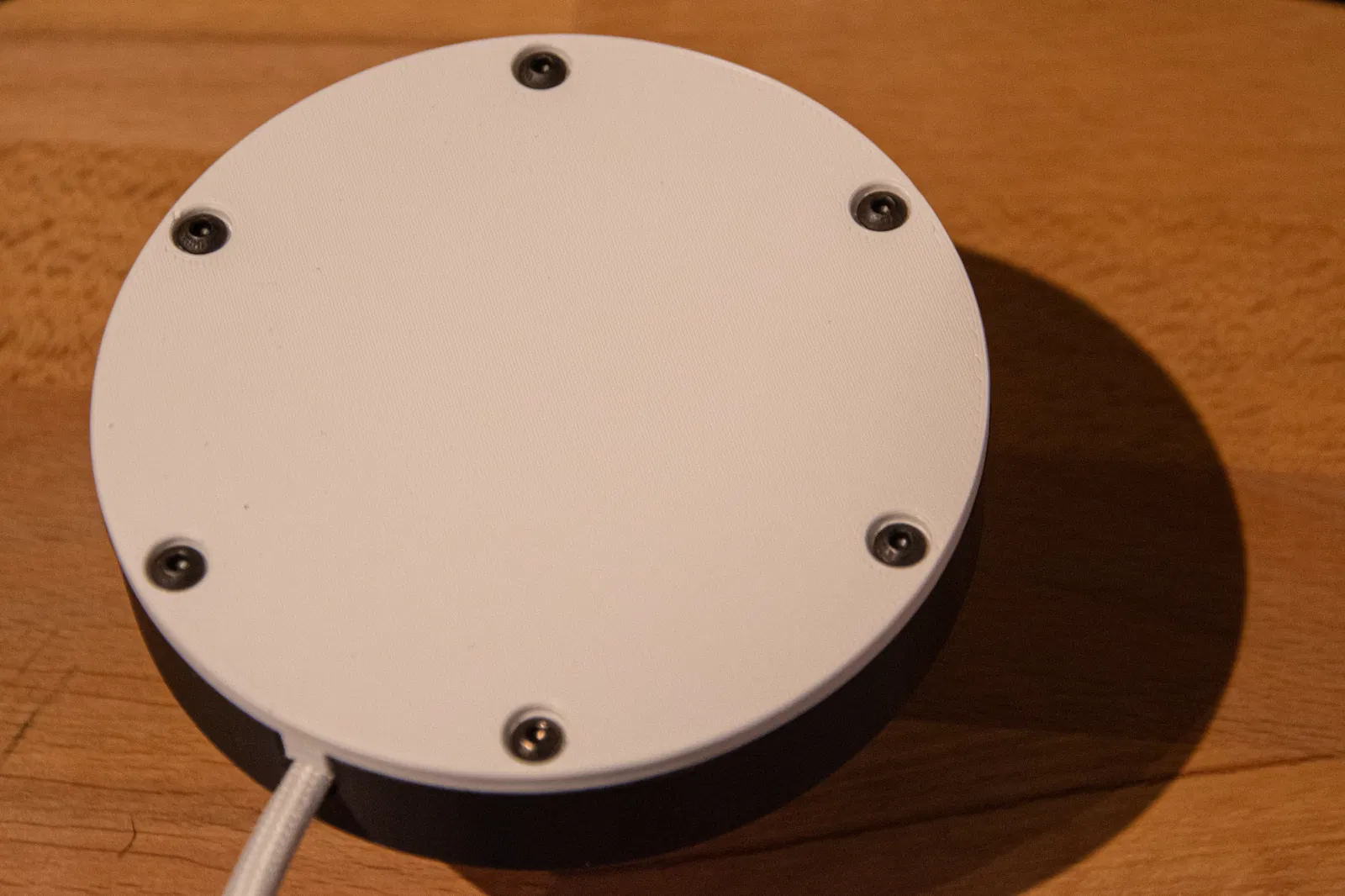 Một đế hình bánh (puck) mới, thiết kế riêng cho Đèn Mặt Trăng Khắc Chìm có Đế Vặn Rộng. Đế này có đai ốc ren và bộ phận chống mỏi dây cáp, được làm hoàn toàn mới chứ không phải chỉnh sửa. Bao gồm danh sách vật liệu chi tiết và hướng dẫn lắp ráp từng bước.