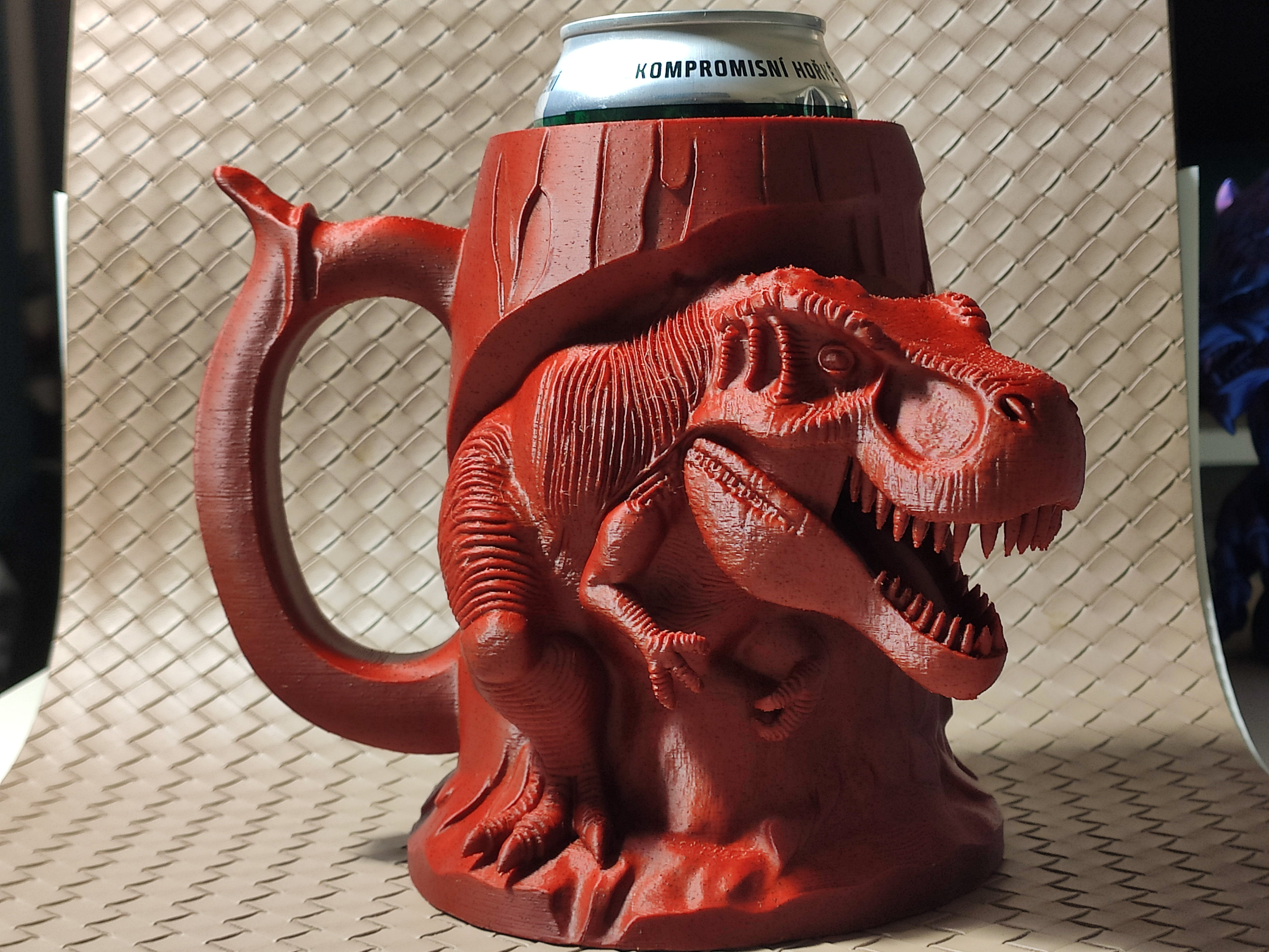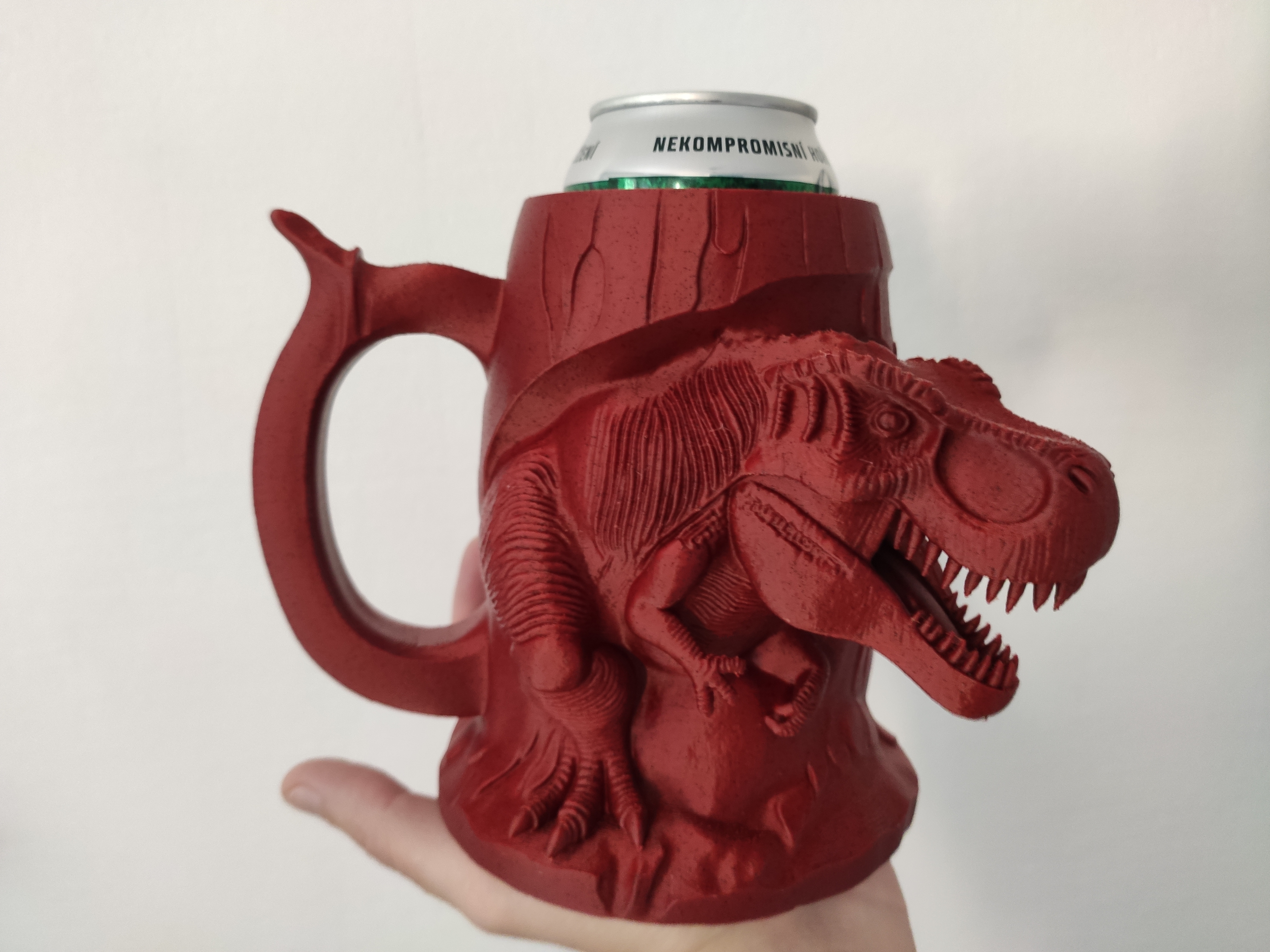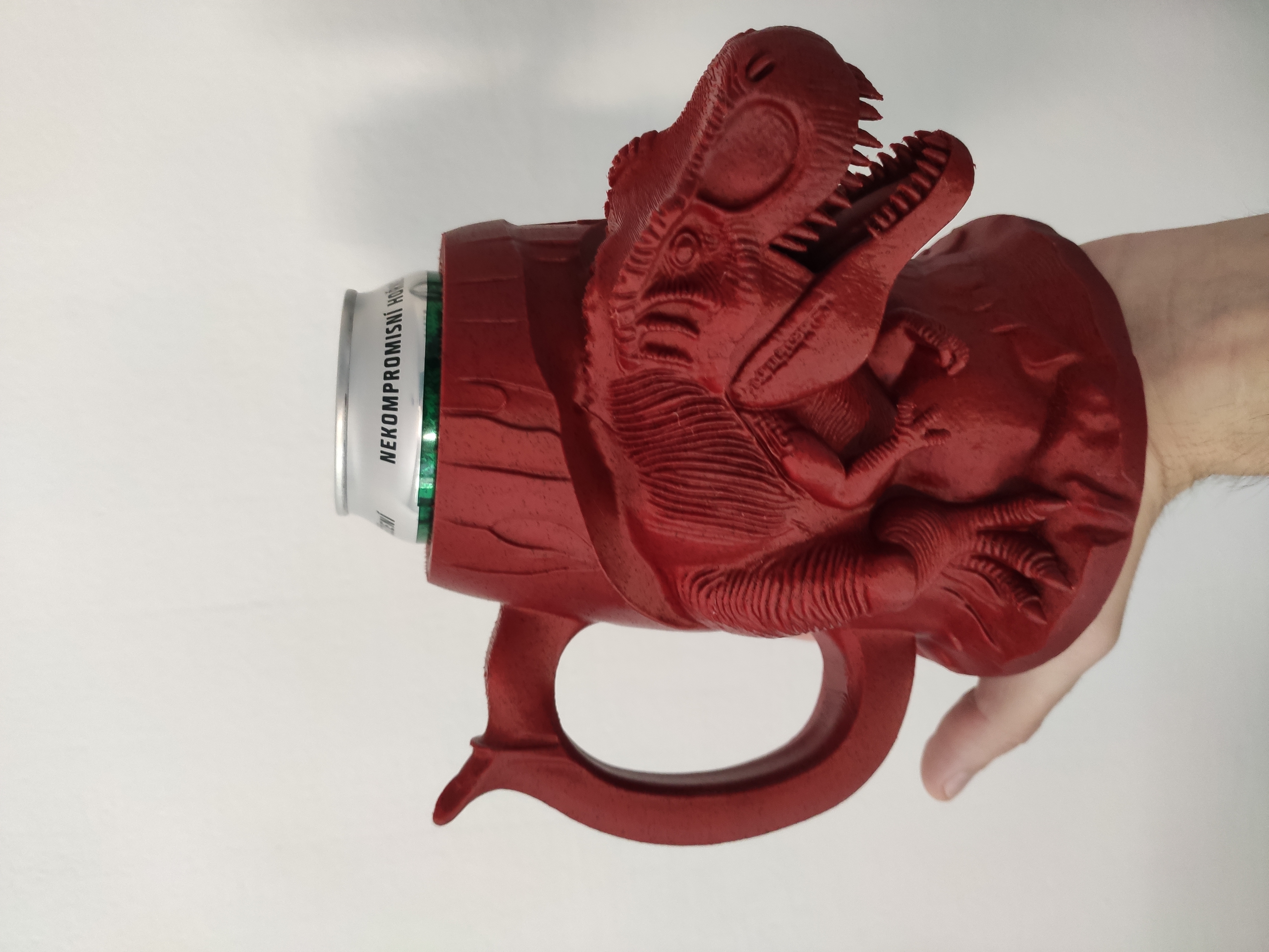 Ống đựng bia hình T-Rex độc đáo, dành cho lon 0.5L. Có kèm miếng chèn cho lon 12oz hoặc 330ml, giúp giữ đồ uống mát lạnh theo phong cách khủng long bạo chúa. In bằng PLA với cài đặt khuyến nghị.