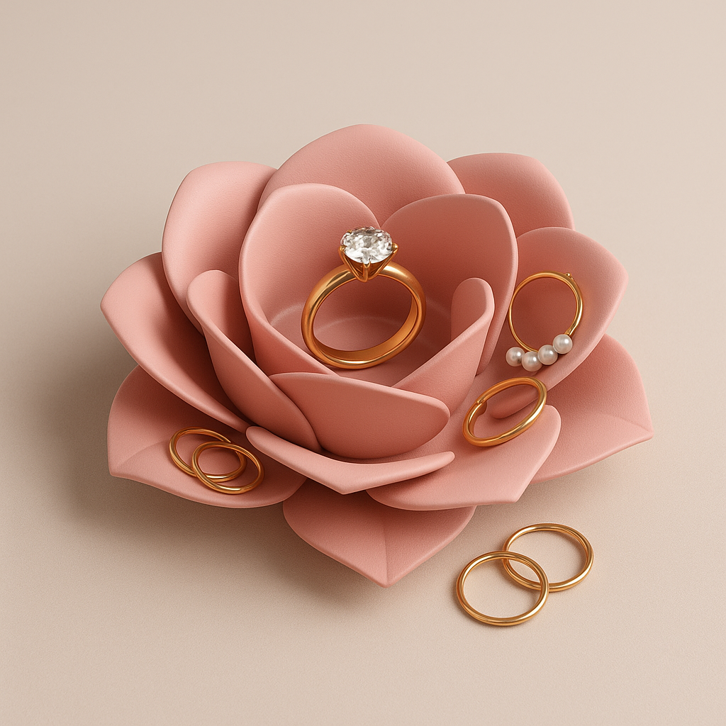 Nơi trang sức hòa quyện với vẻ đẹp tinh khôi của thiên nhiên… BloomBowl là một chiếc đĩa đựng trang sức hình hoa hồng, kết hợp giữa sự thanh lịch và tính ứng dụng hàng ngày. Được thiết kế để nhẹ nhàng ôm những chiếc nhẫn, bông tai và phụ kiện nhỏ trong những đường cong tựa cánh hoa, nó mang đến một nét quyến rũ lãng mạn cho bàn trang điểm của bạn.