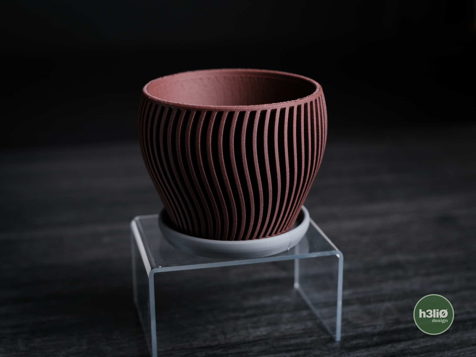 Ảnh chụp chậu in bằng PLA mờ và PLA vân gỗ.
