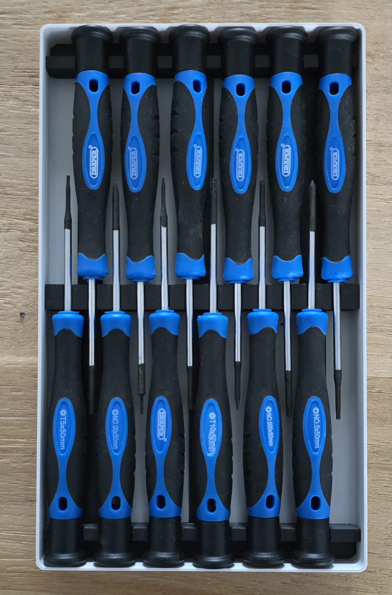 Bao gồm một khay Gridfinity 5x3x3 không có gờ và một miếng lót cho 12 tua vít cỡ nhỏ (thương hiệu Draper).