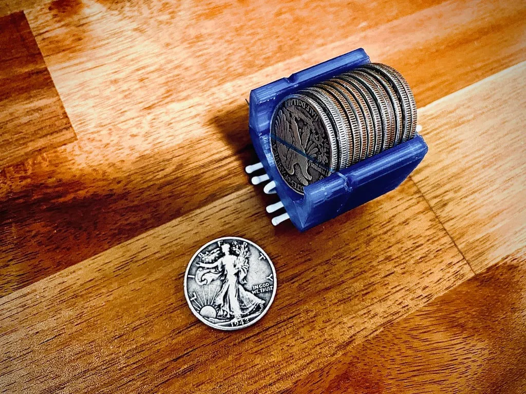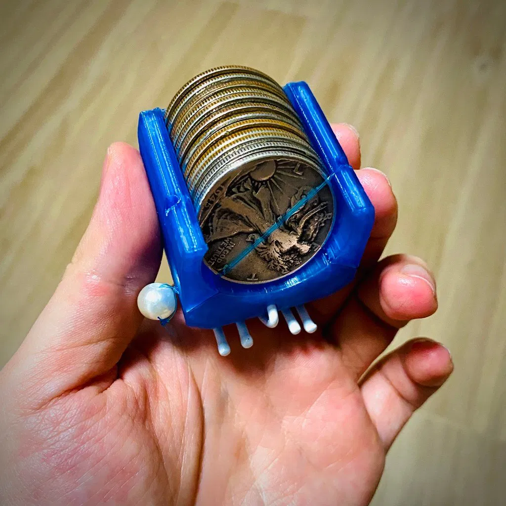 Phiên bản gốc của tôi về một thiết bị thả xu dạng nạp dọc, chứa được 12 đồng xu US nửa đô la thông thường, một công cụ mạnh mẽ đeo dưới áo khoác của bạn. Bạn sẽ được cung cấp một chồng xu gọn gàng theo chiều dọc, đây là một tính năng hiếm thấy ở các sản phẩm tương tự trên thị trường, giúp bạn biểu diễn màn "Miser’s Dream" (Giấc Mơ Của Kẻ Keo Kiệt) một cách thuận tiện nhất.