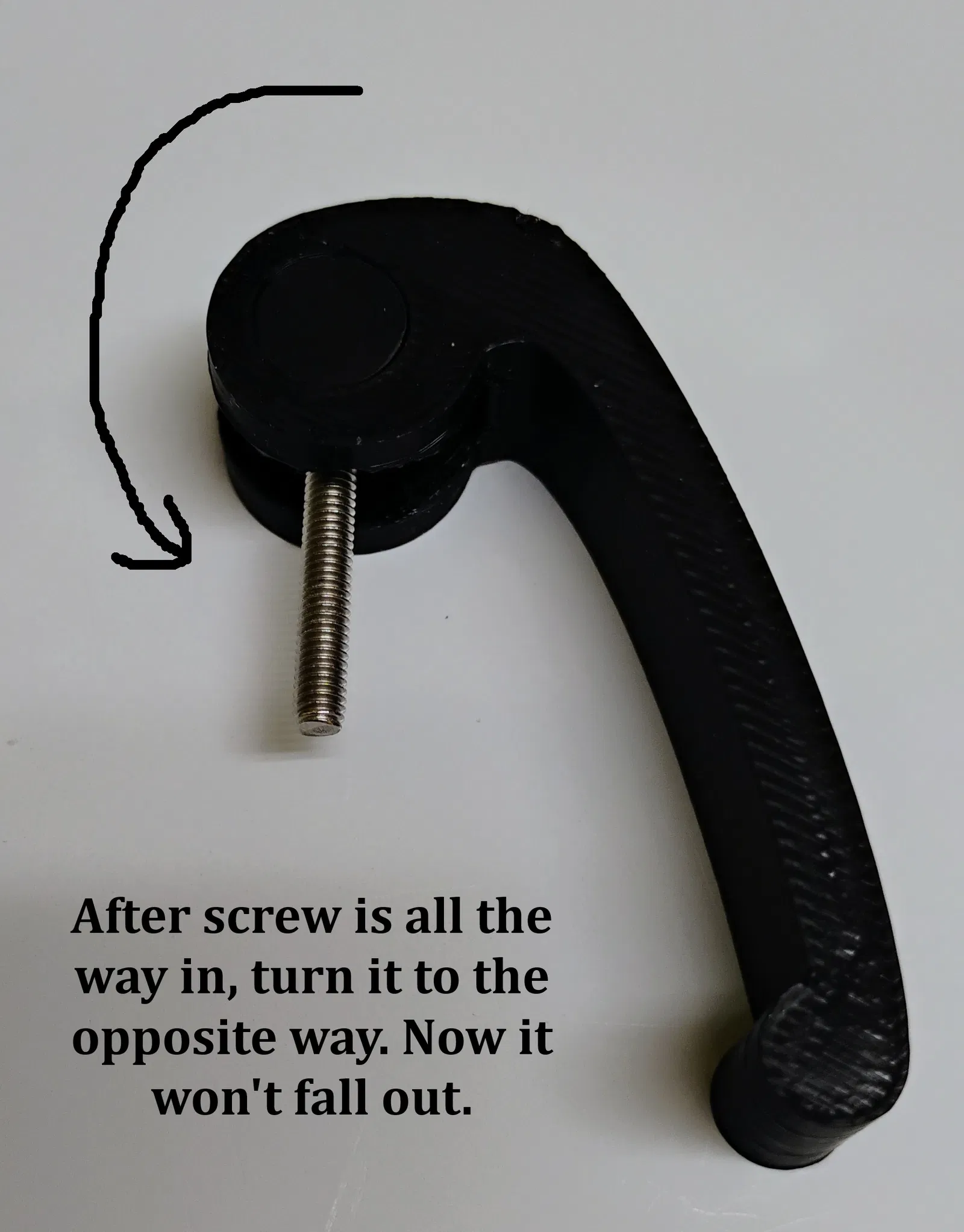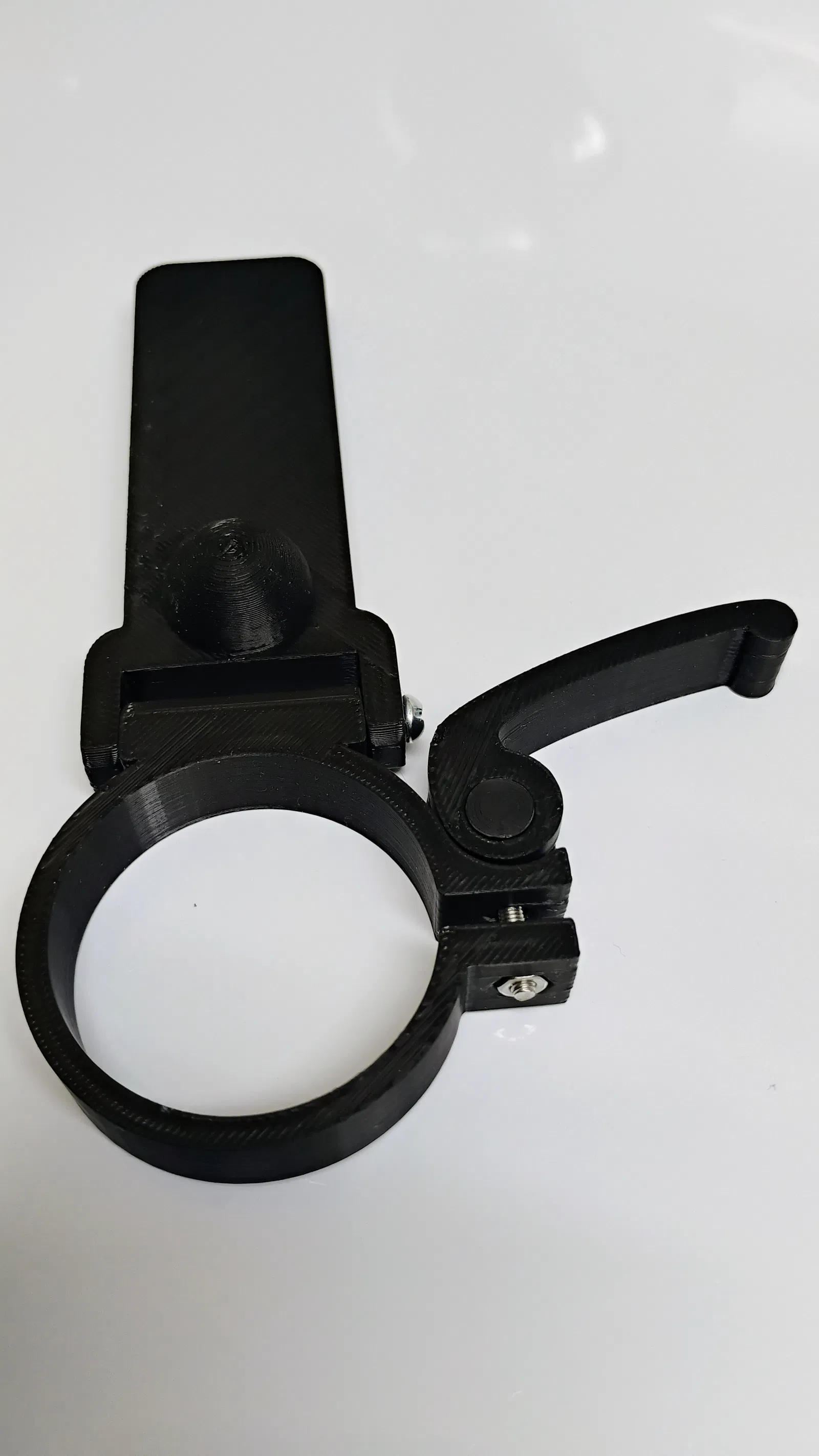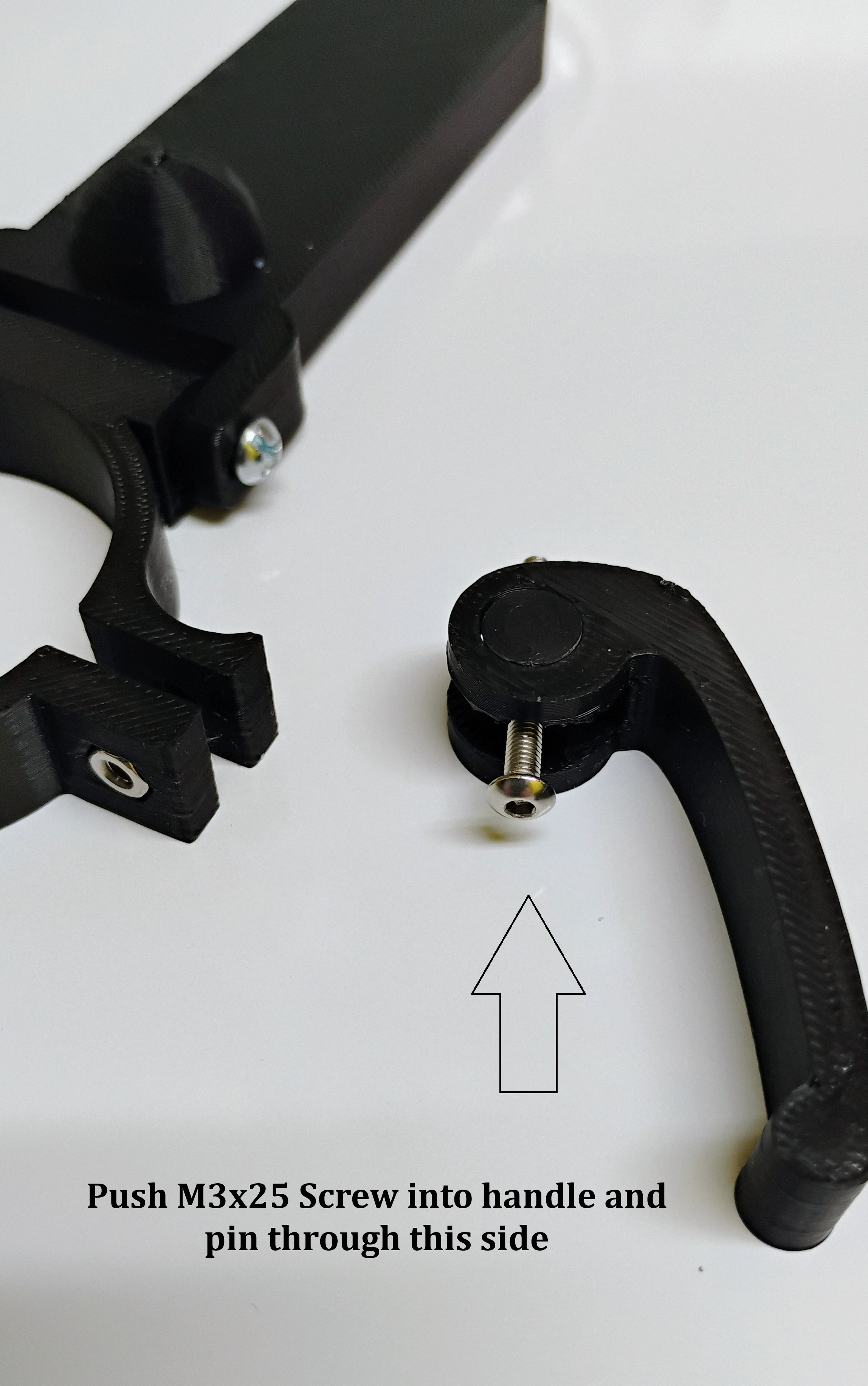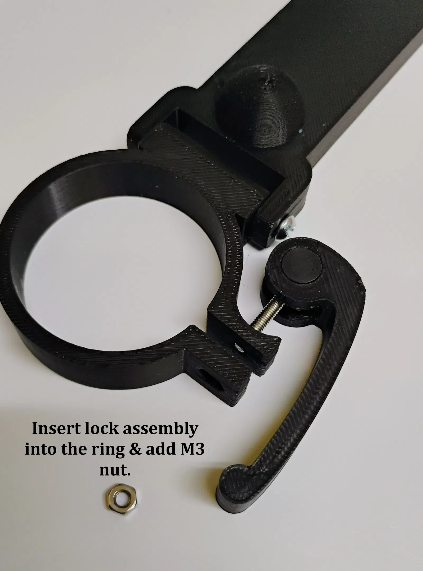 - Sử dụng vít M3 x 25mm & đai ốc cho cần khóa, lắp chốt vào cần khóa. Lắp vít M3 qua đó và vào vòng cổ. Gắn đai ốc vào vít. Vít cần khóa có thể được siết chặt tại chỗ, một khi đã gắn vào vật chứa.