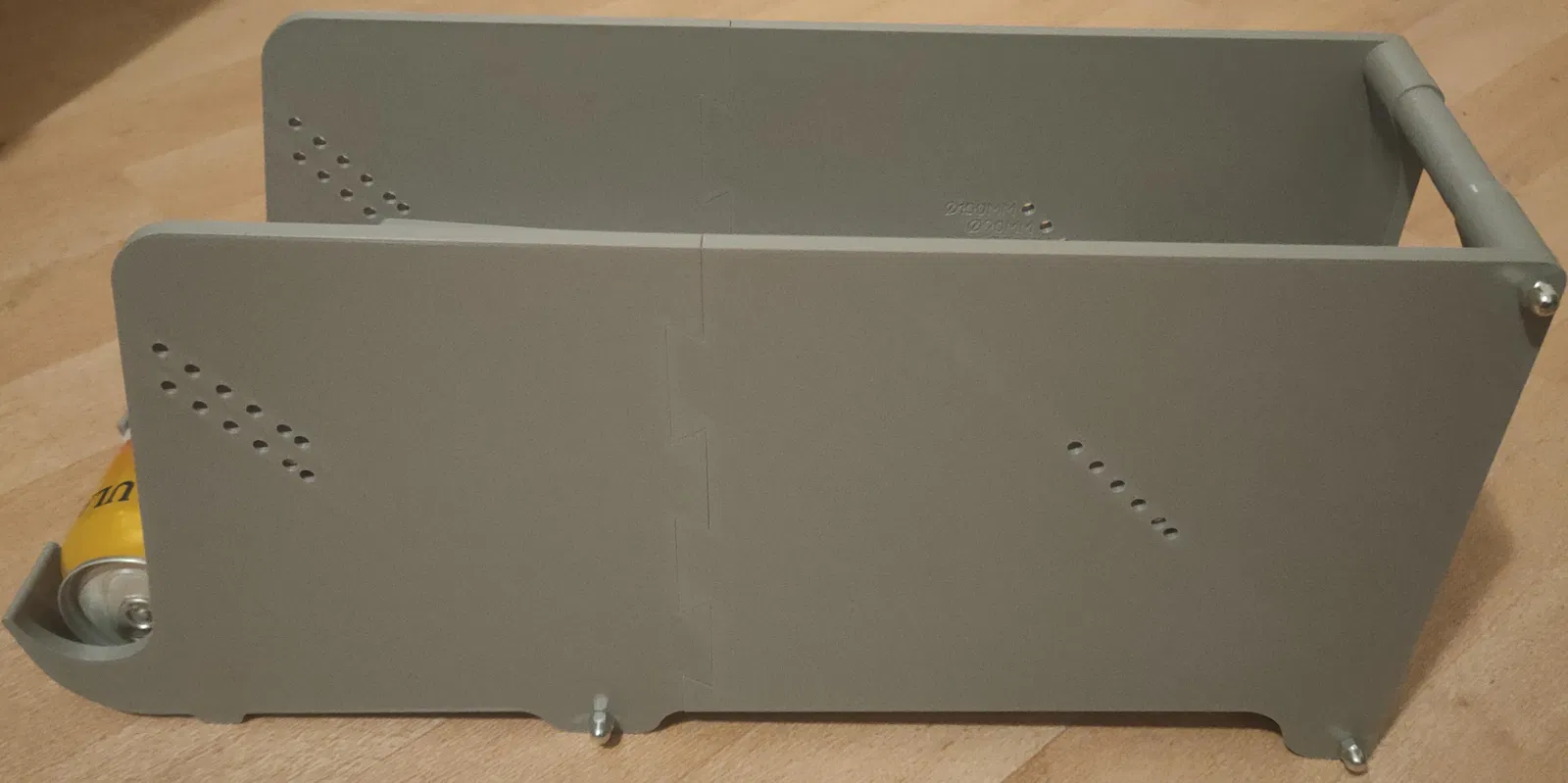 Từ từ đóng "Mặt trước & Mặt sau" lại với nhau bằng búa cao su, khớp nối được thiết kế với độ khít bằng 0 ngoại trừ các góc ngoài 60° (nếu độ khít quá chặt, hãy làm sắc các góc này bằng dao hoặc giấy nhám). Bộ phận "Kệ trên" được lắp bằng 2 vít M5x12mm. Ở bước này, bạn chọn các lỗ lắp phù hợp với kích thước lon của mình và góc kệ trên (3° hoặc 6°). Cắt thanh ren M5 theo chiều dài và lắp ráp mọi thứ lại với nhau.