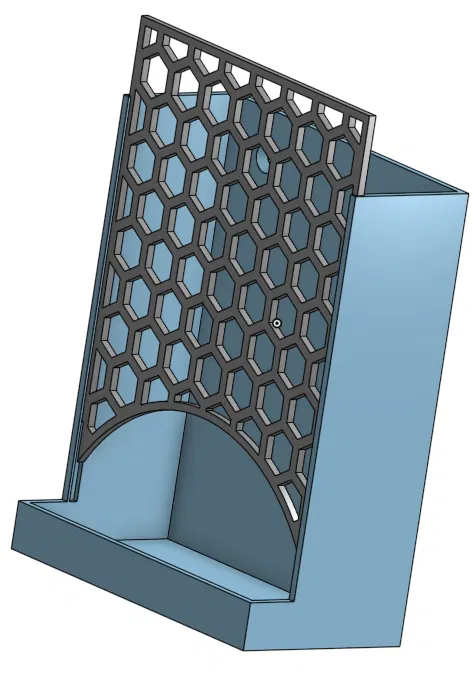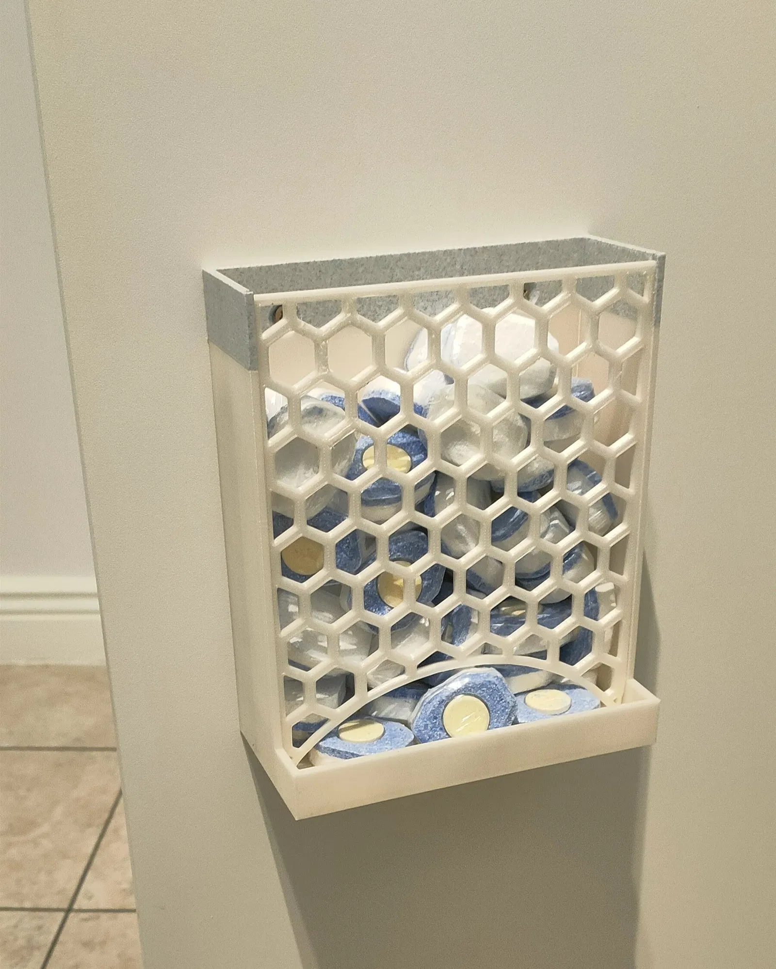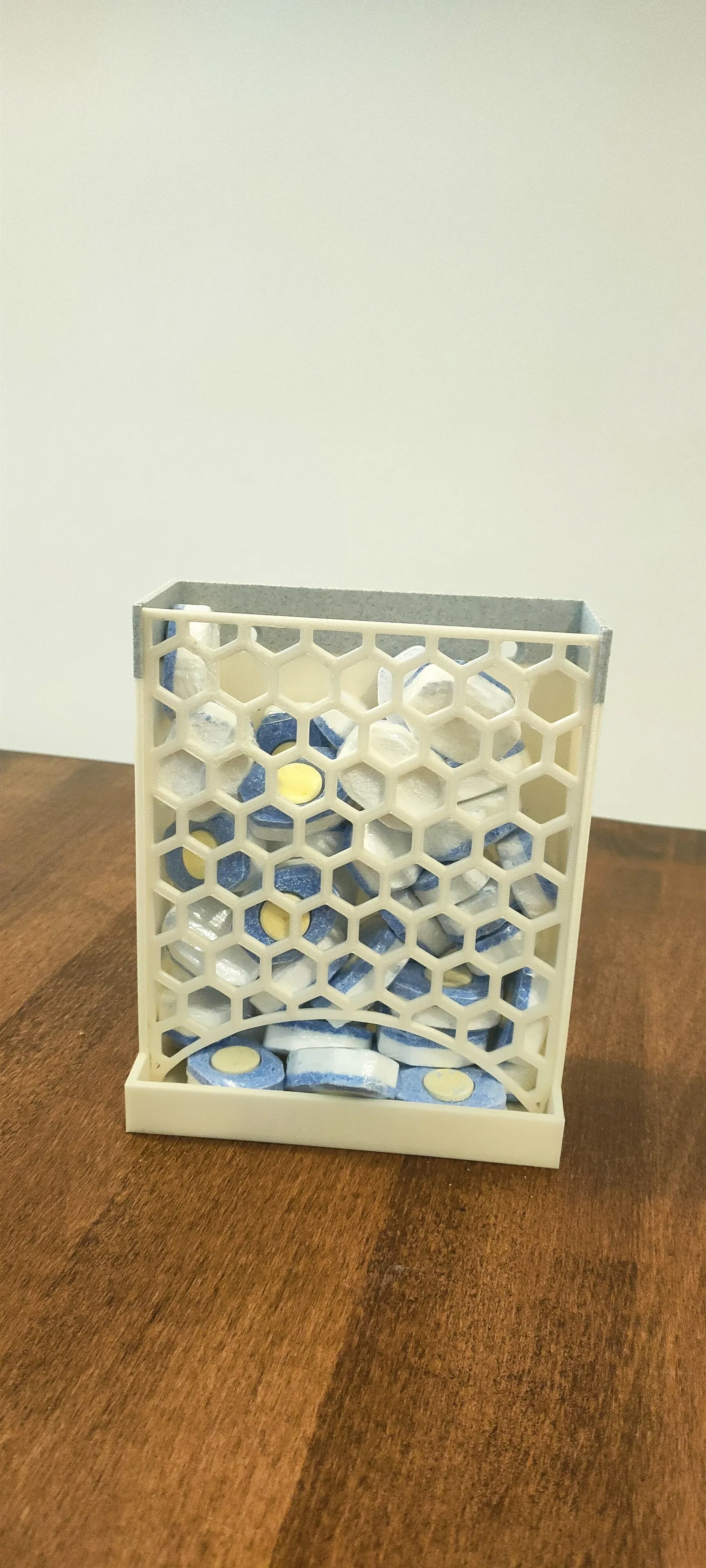 Một hộp đựng gắn trên cánh tủ cho viên rửa chén hoặc bất kỳ vật dụng tương tự nào. Phiên bản V2 có cải tiến về độ dốc và kích thước miệng để dễ sử dụng hơn, và vẫn giữ nguyên ưu điểm không cần hỗ trợ khi in.