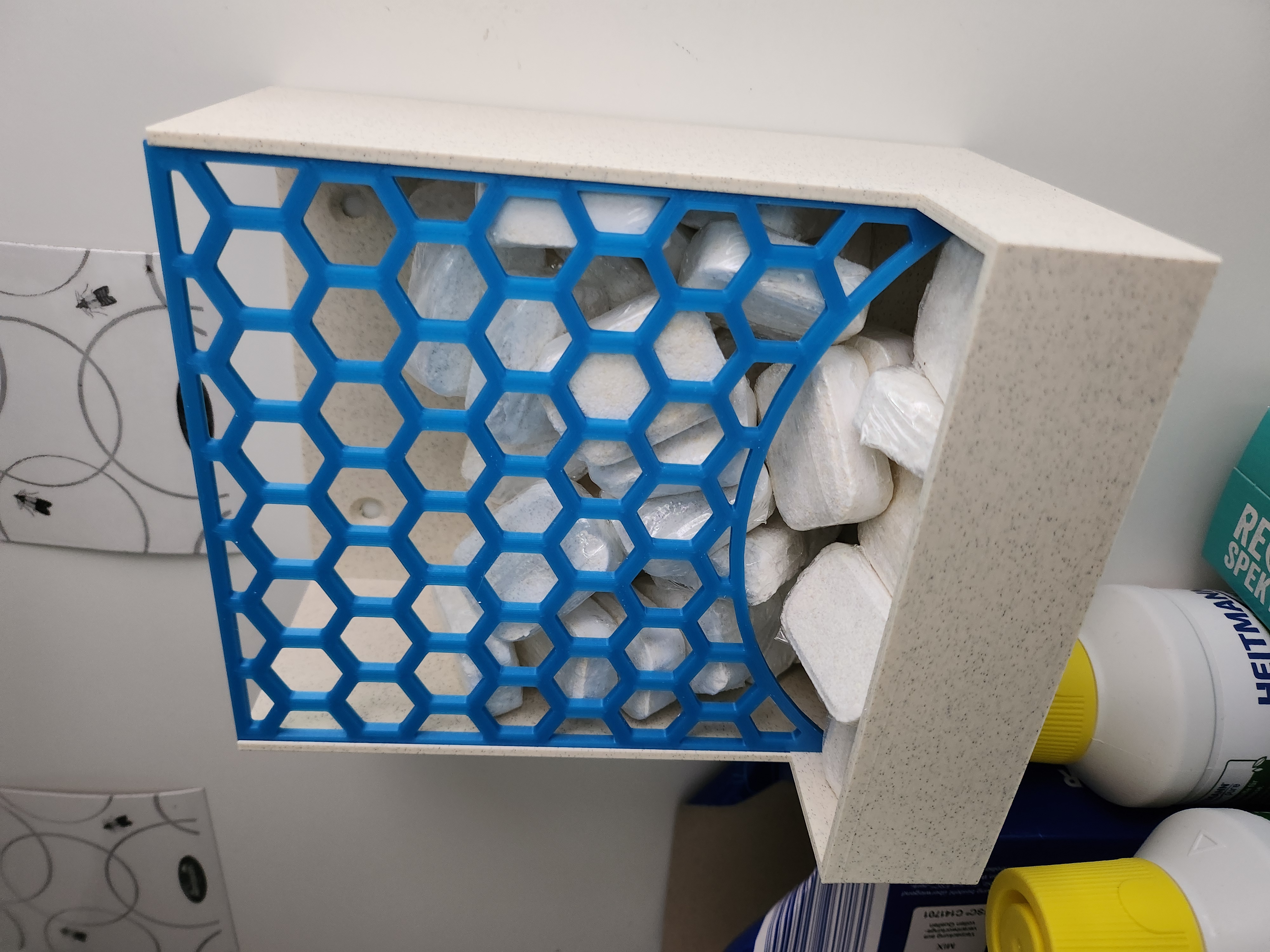 Chỉnh sửa bộ chia viên rửa chén máy rửa chén, có thể in không cần giá đỡ. Phiên bản lớn hơn với rãnh dẫn nghiêng để dễ dàng lấy viên rửa chén hơn.